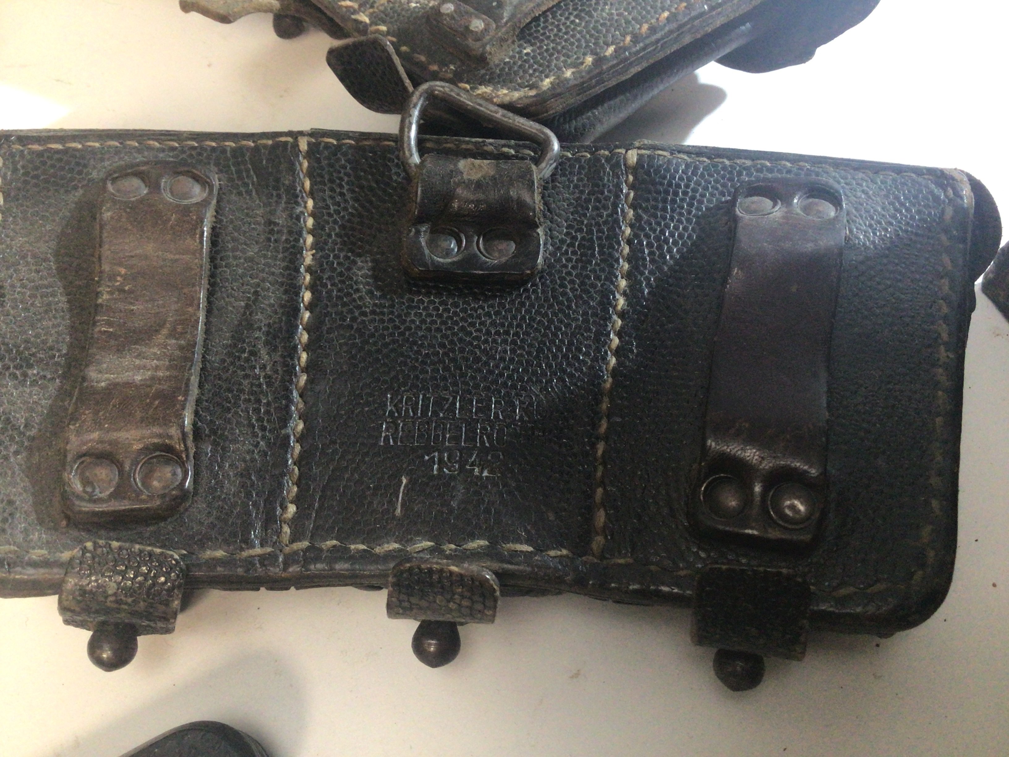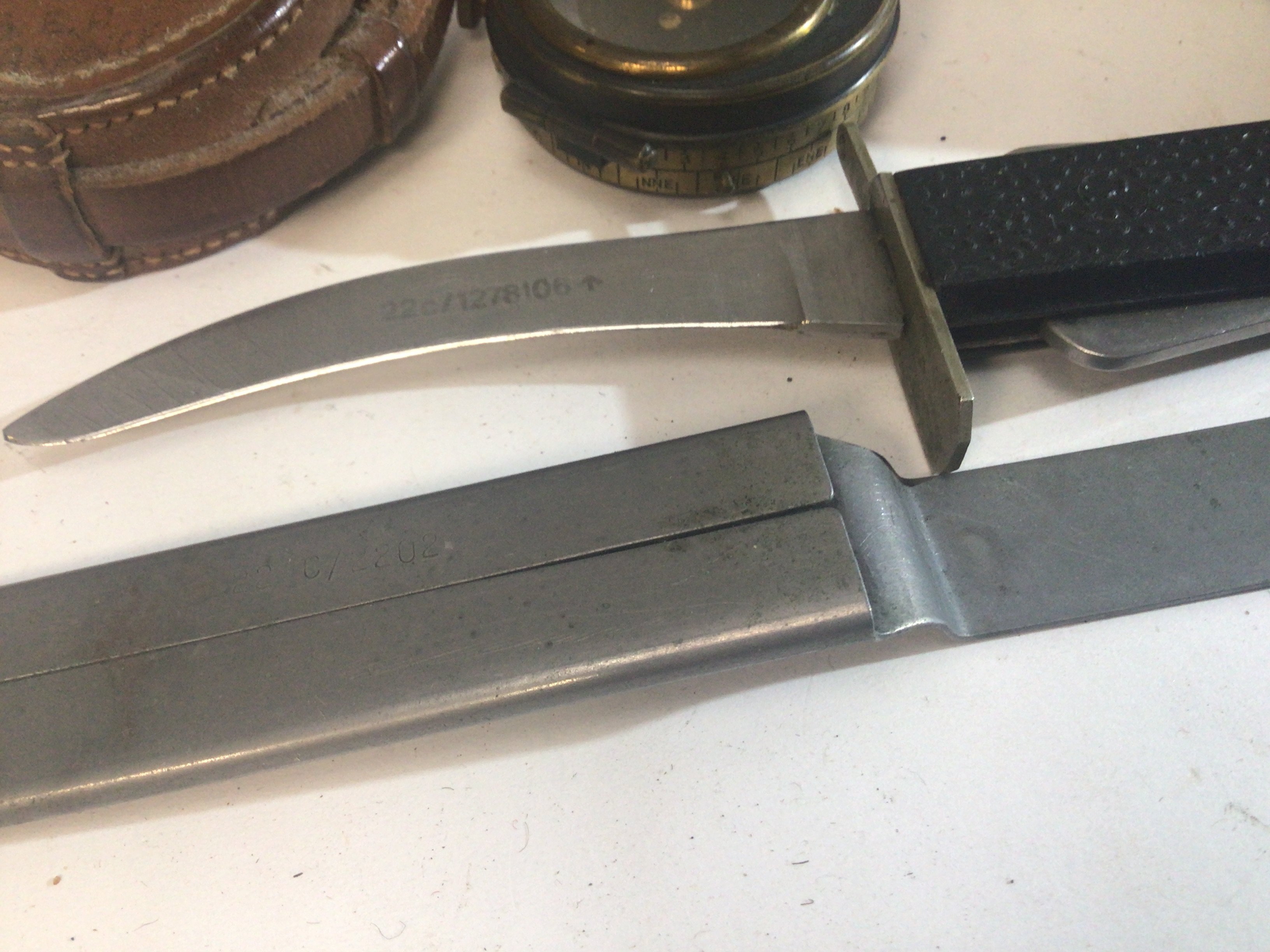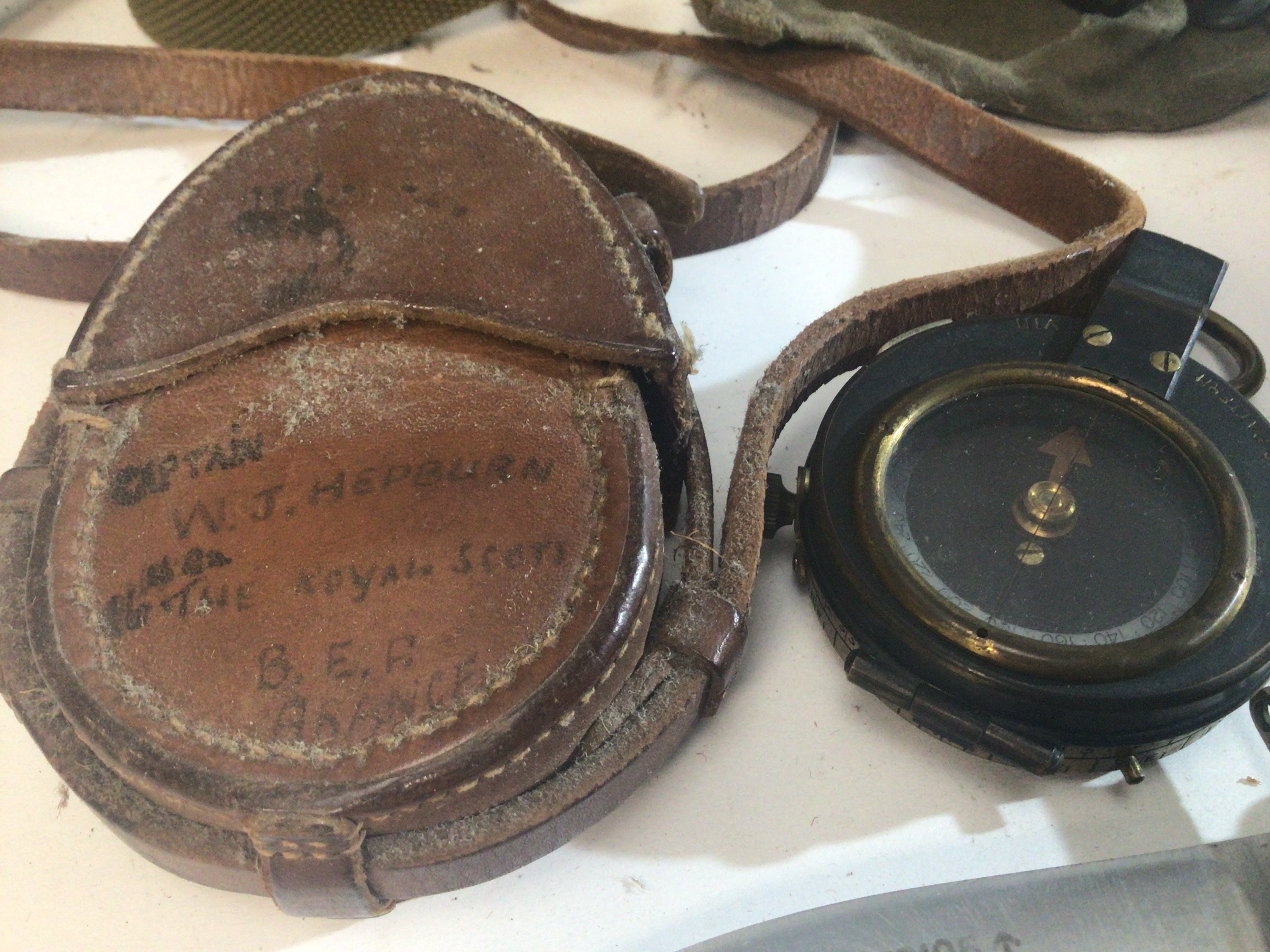 A Military Compass belonging to Captain W J Hepburn The Royal Scots an American II world war compass belts a Sheffield multi purpose knife military issue ammunition pouches and other oddments.