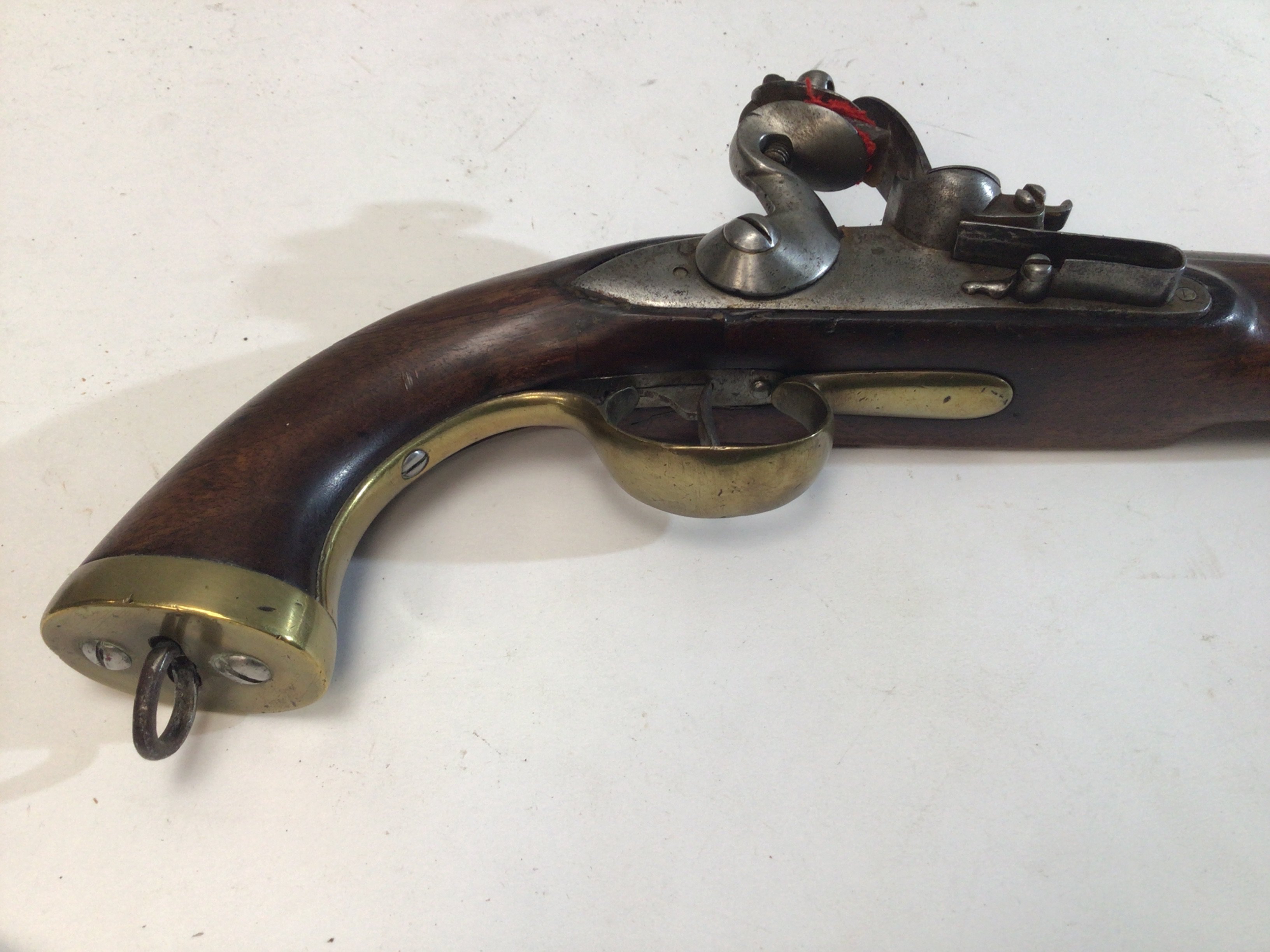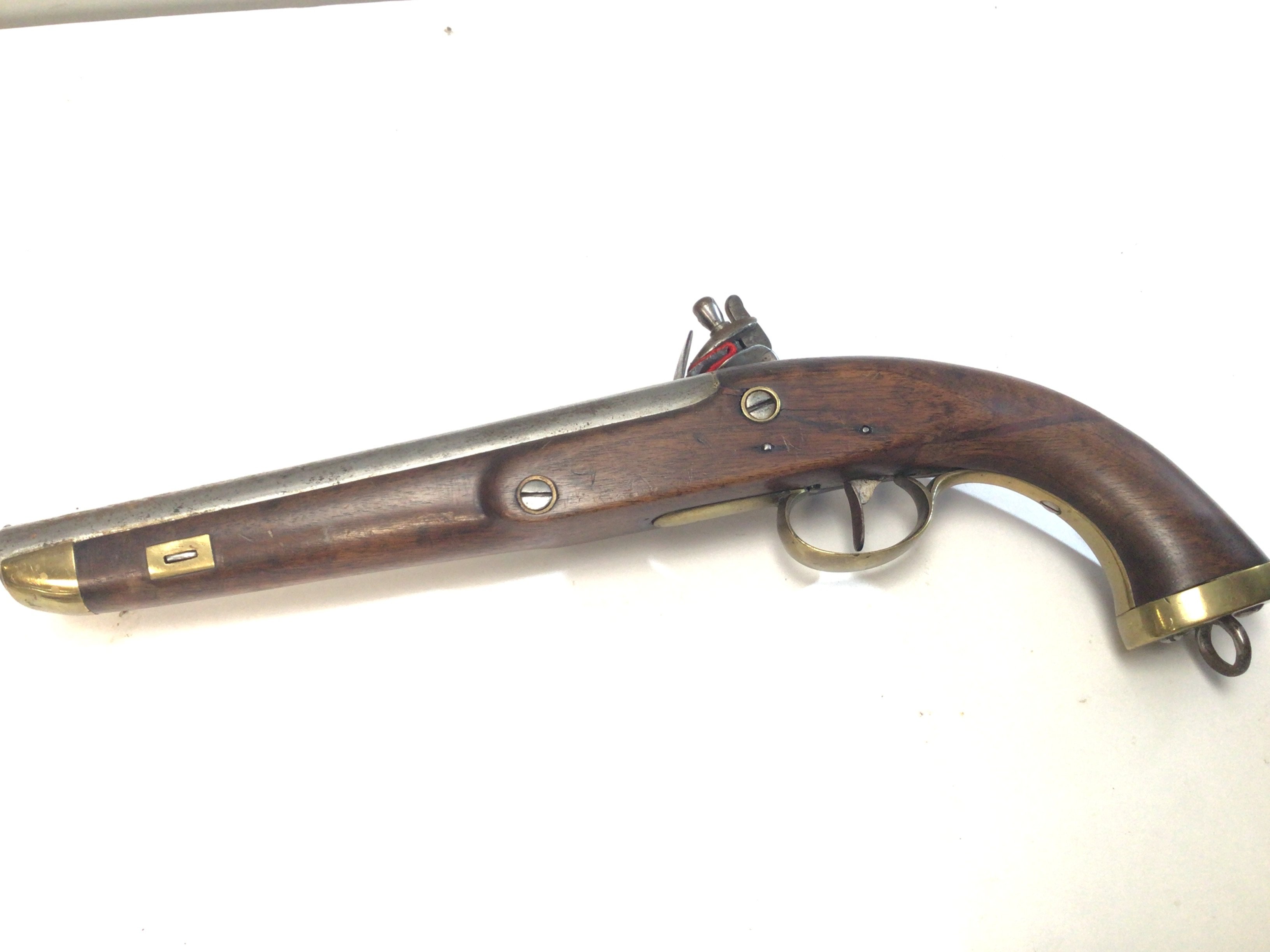 A late 18th Century flintlock pistol possibly military issue the brass fittings with attachment ring steel action and barrel.