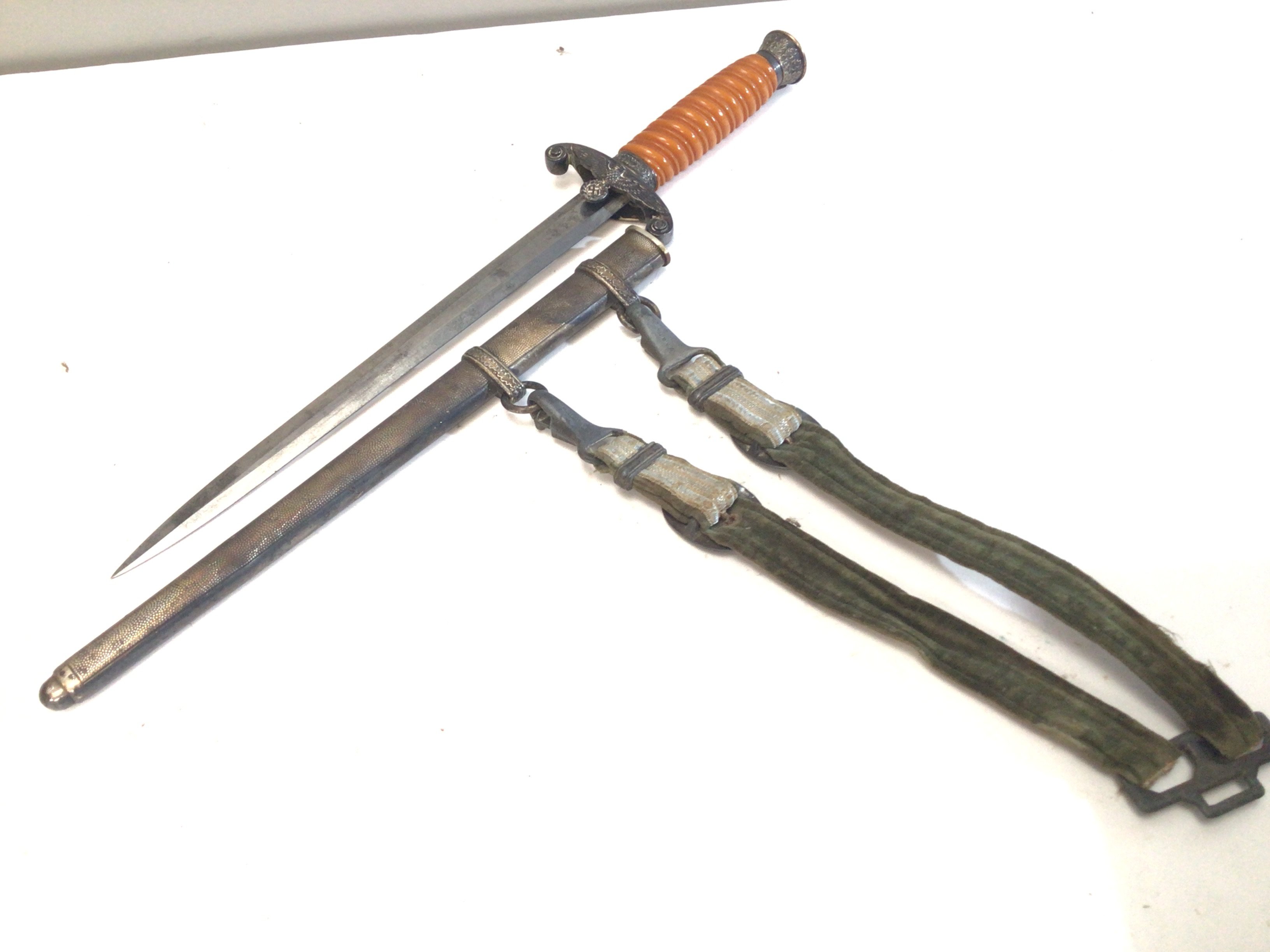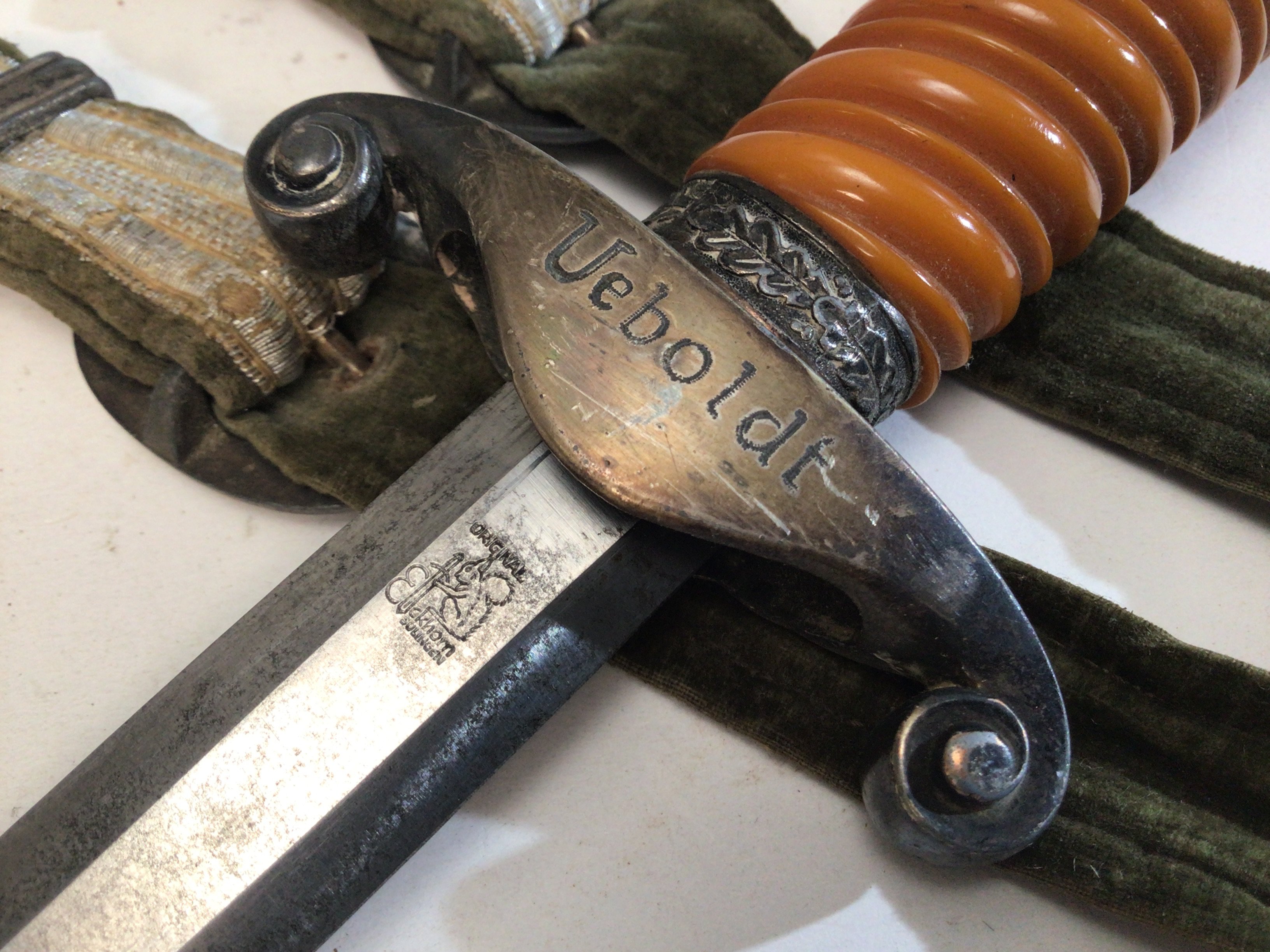 A German II world war Third Reich officers presentation dagger. With original hanger the cross guard with the inscriptions Ueboldt makers stamp to the blade.