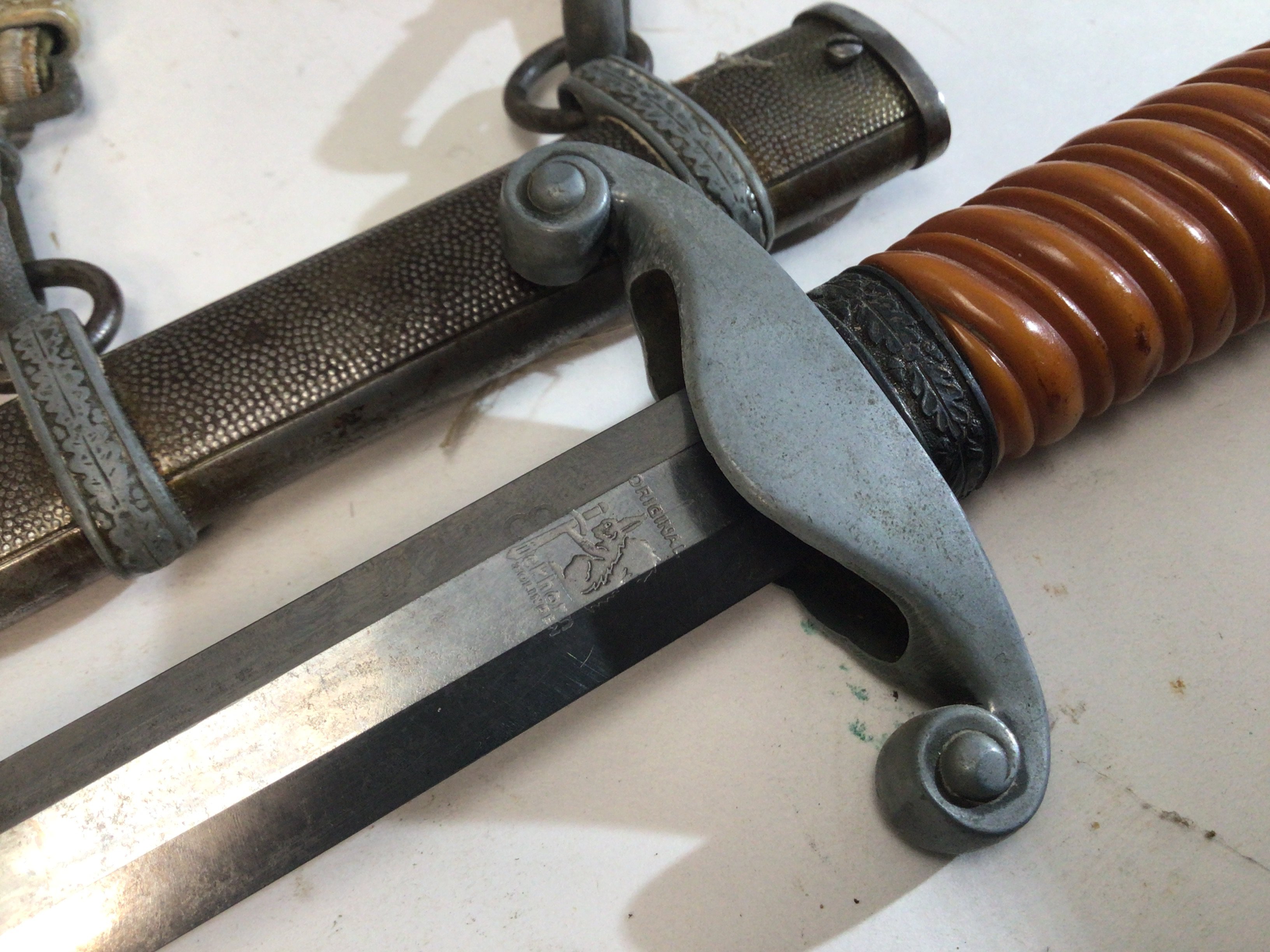 A German Third Reich II world war officers presentation dagger with original hanger the blade with makers stamp.