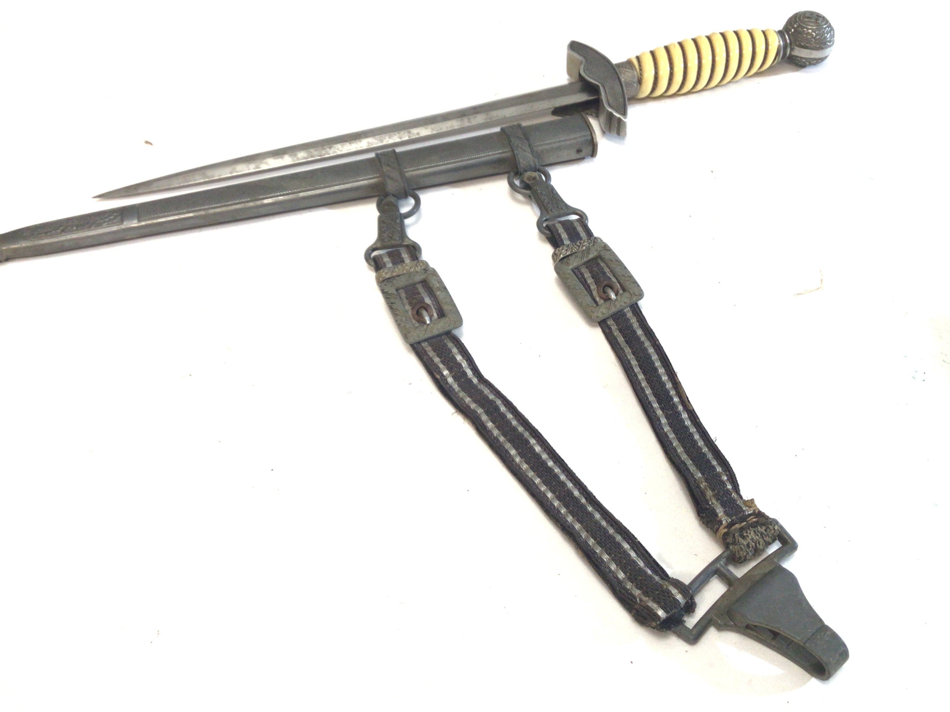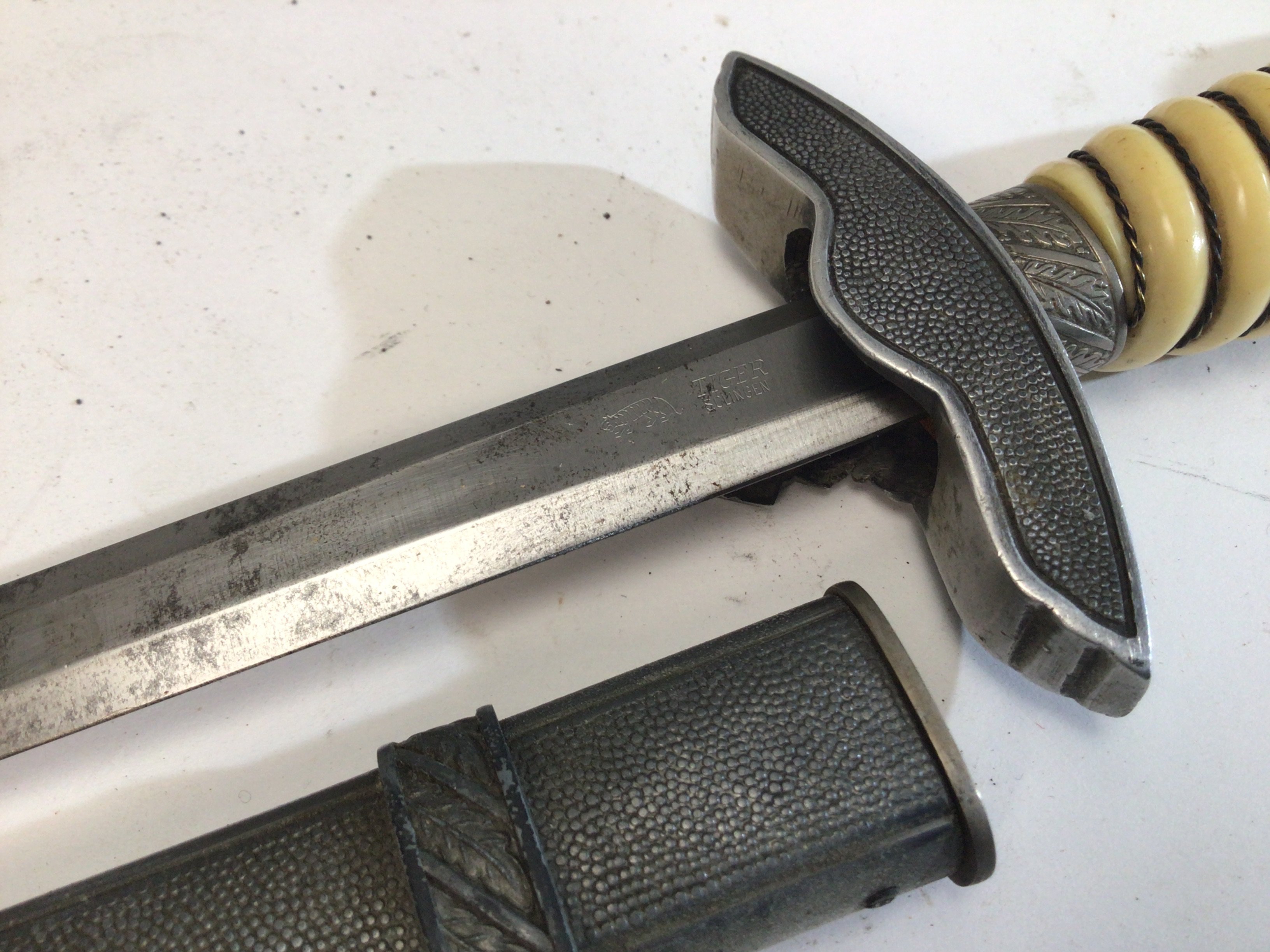 A German Third Reich II world war Luftwaffe presentation officers dagger. With original hanger the blade with Tiger Solingen makers marks.