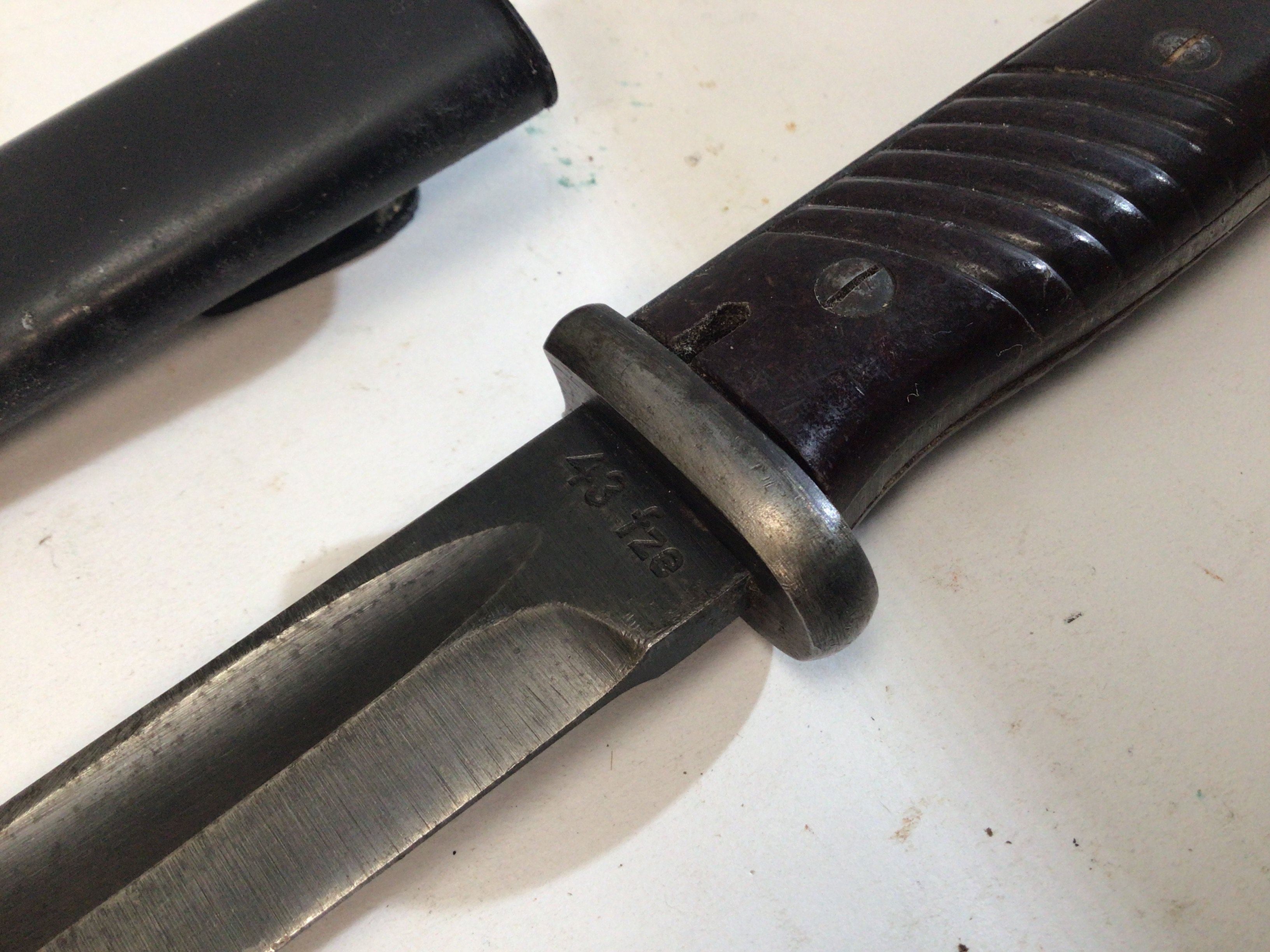 A German Third Reich K98 bayonet the blade stamped 43 fze also numbered 5582 the steel scabbed stamped and dated J.Sch1938.