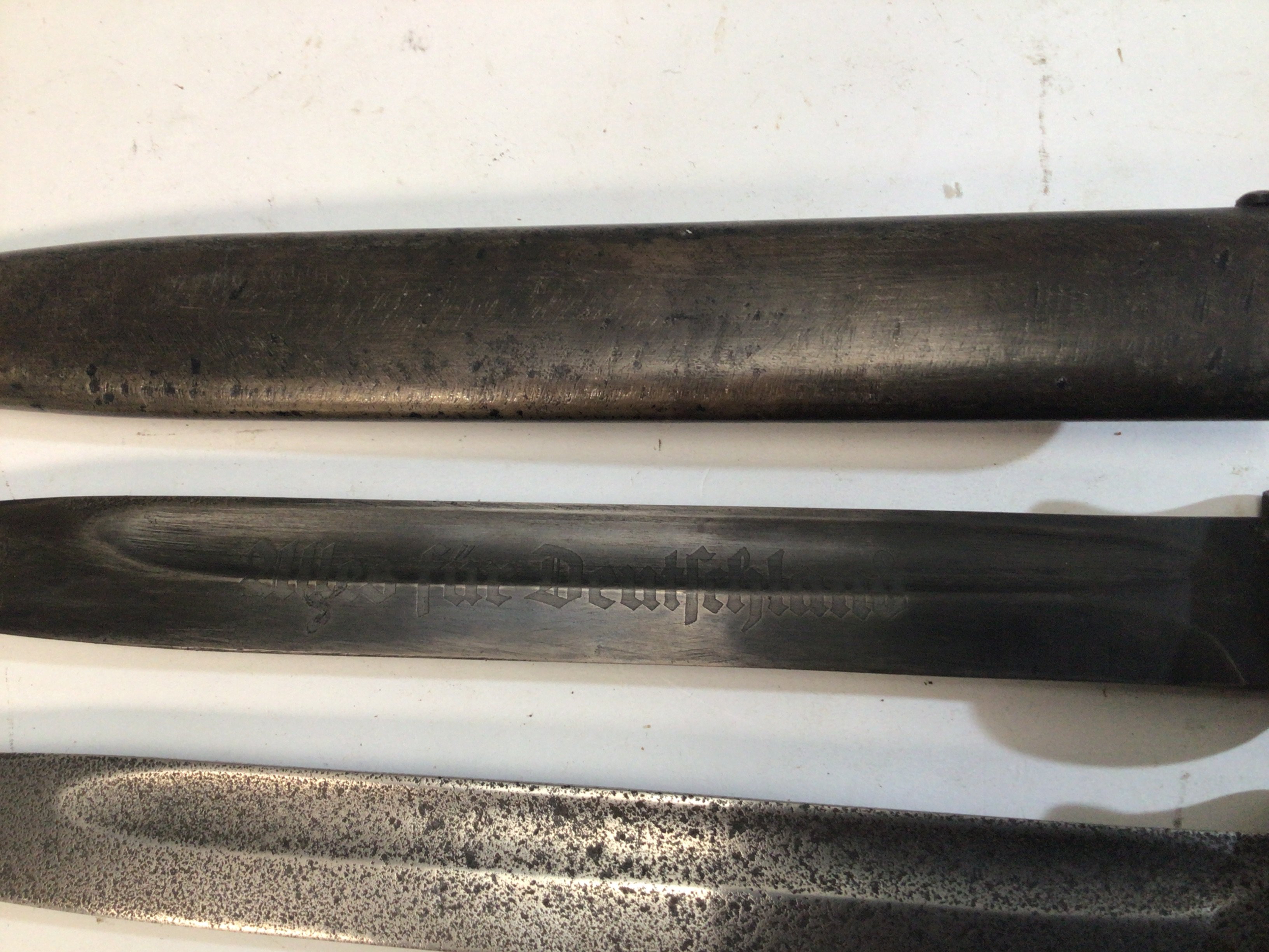 A German Third Reich II world war K98 bayonet the blade etched Alles Fur Deutschland.also stamped with maker’s initials WKC. and one other K98 bayonet no scabbard (2)