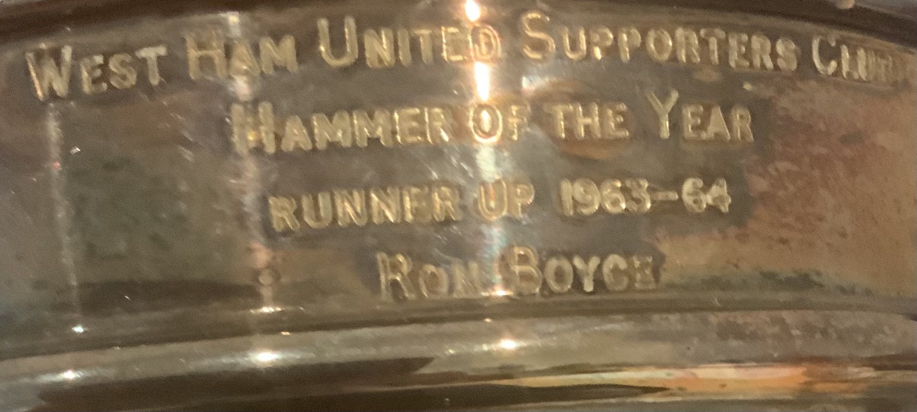 Ron Boyce West Ham 1964 Hammer Of The Year Runners Up Trophy: Seven inch high trophy engraved with 1963 - 1964 West Ham Supporters Club runner up Ron Boyce. Metal is tarnished but otherwise in excellent condition.