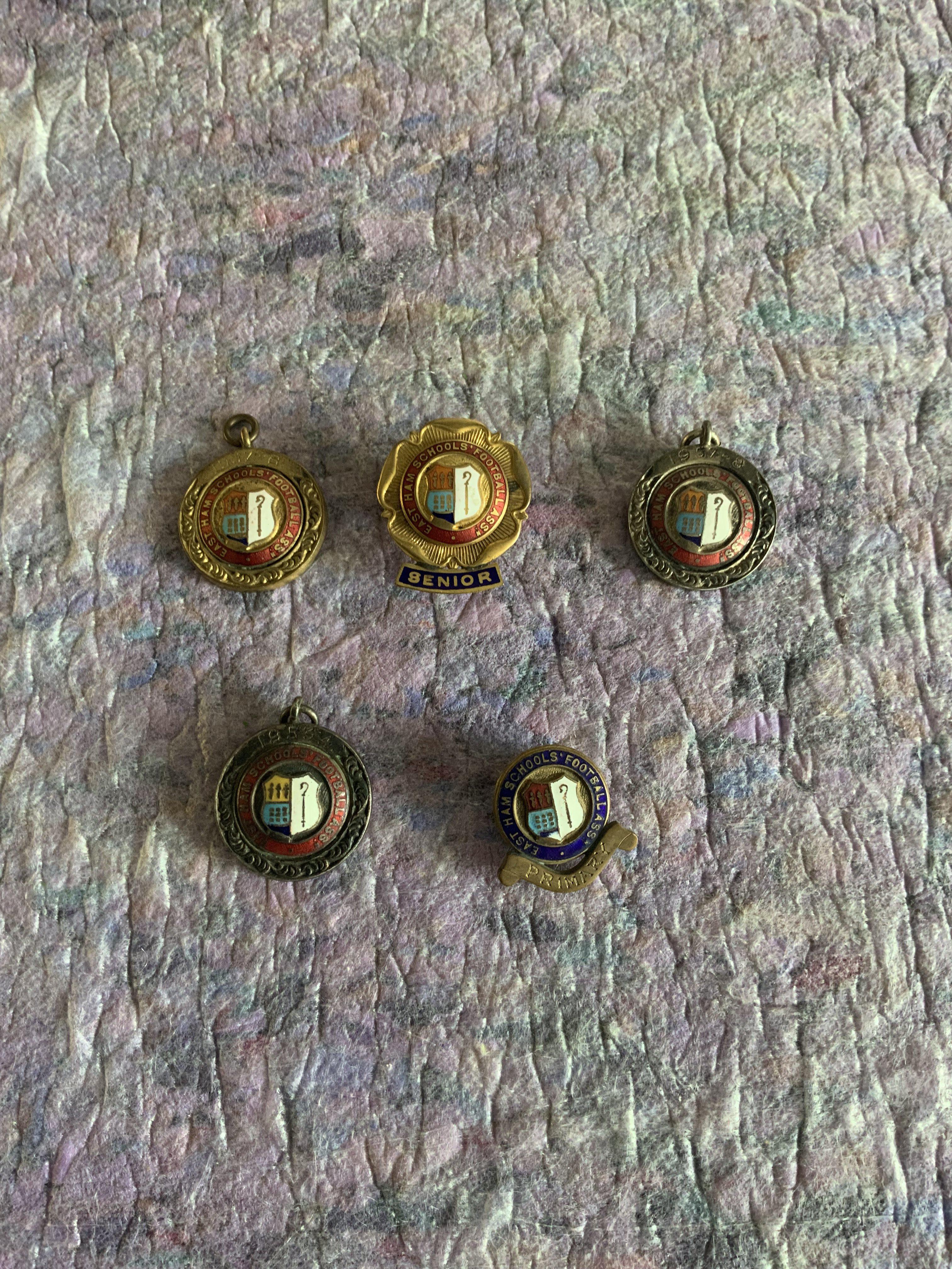 Ron Boyce West Ham East Ham Schools Football Badges: A selection of badges from Ron Boyces schoolboy career. Five badges 3 of which have engraving to reverse. Good condition. (5).