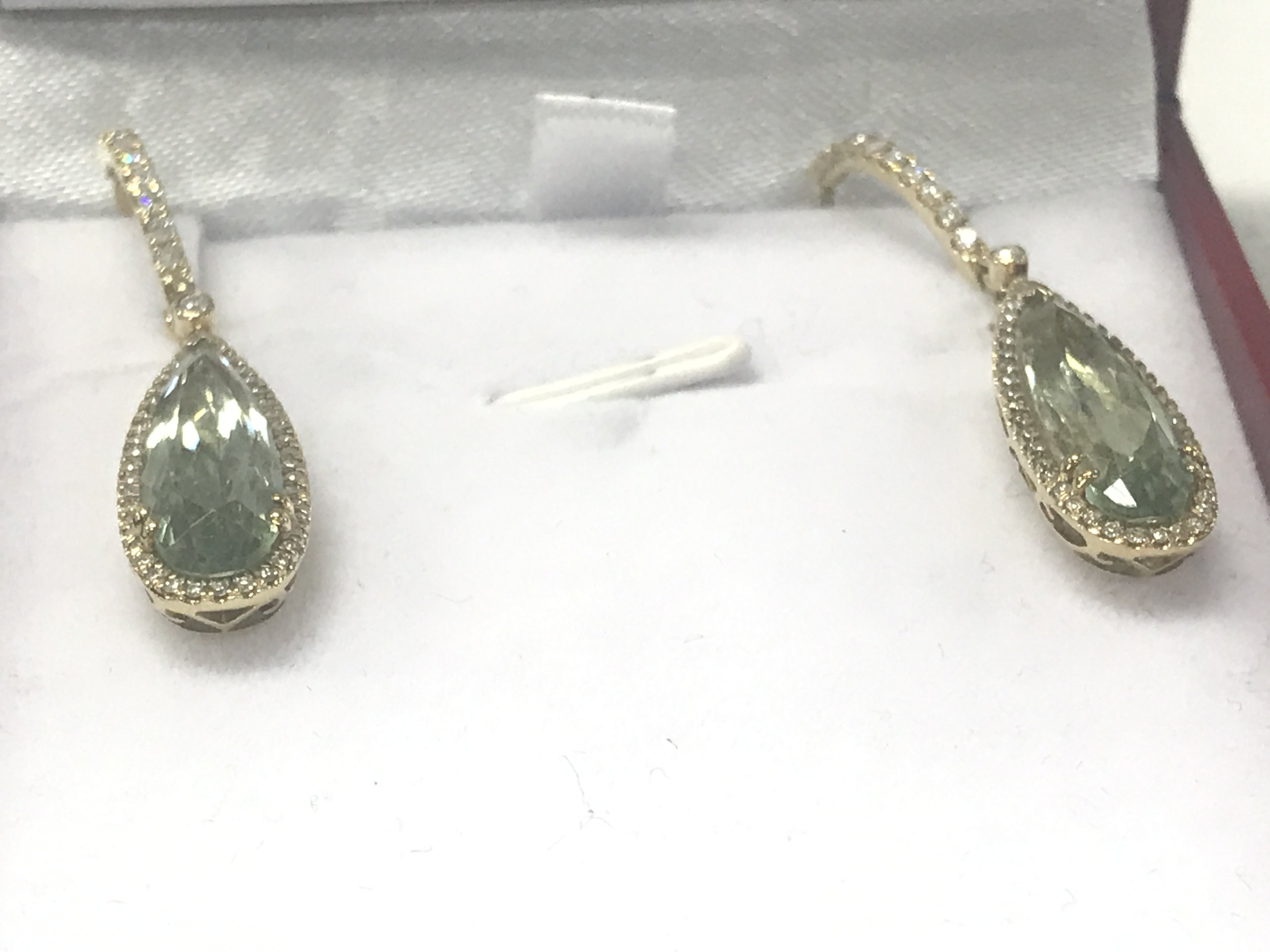 Pair of 9ct yellow gold long drop earrings set with pear shaped green amethysts surrounded by RBC diamonds, with further RBC diamonds to the bales and loops, boxed. Amethysts 6.62ct. Diamonds 0.45ct.