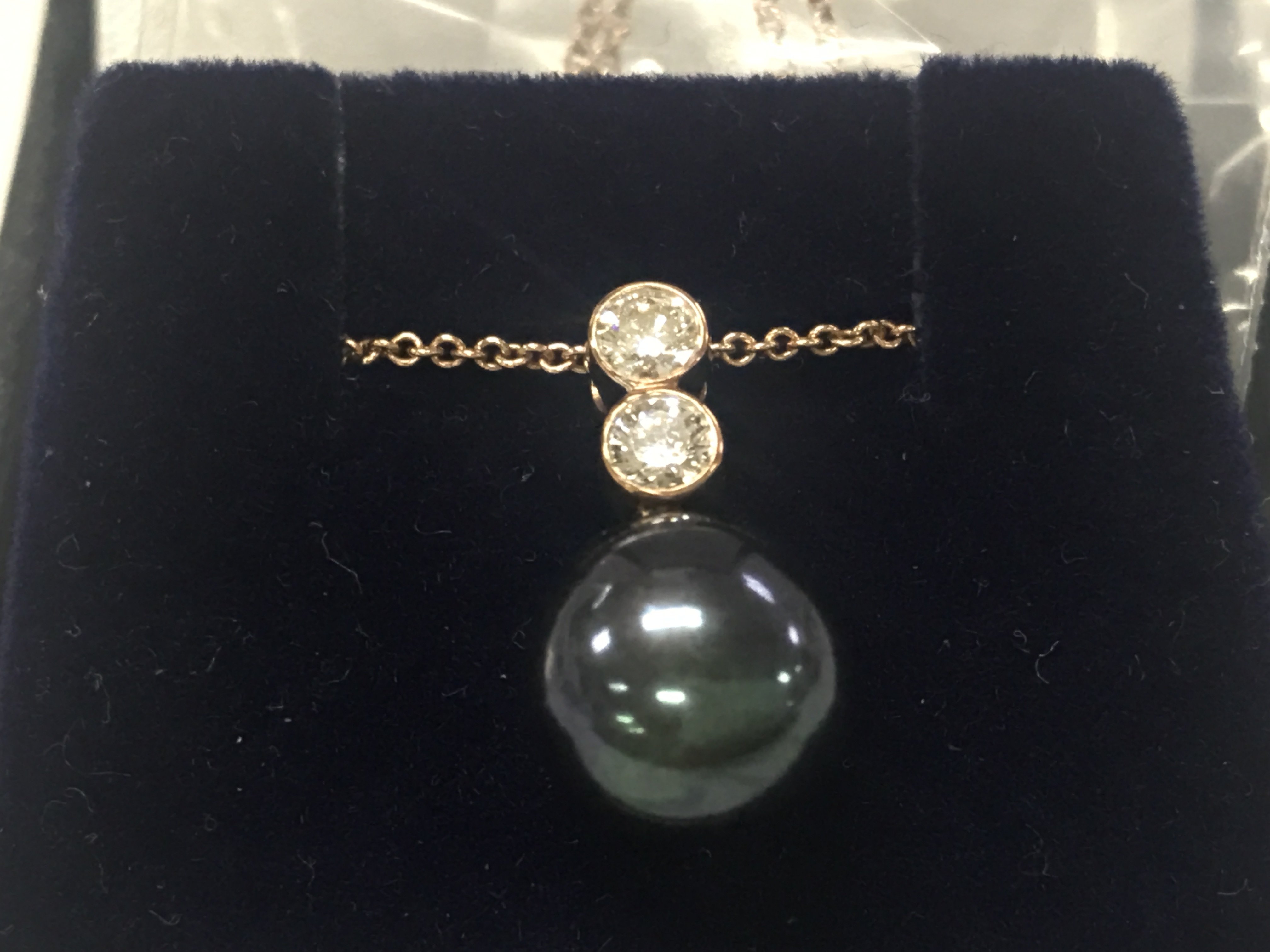 9ct rose gold iridescent dark pearl and double drop diamond necklace, boxed. Diamonds 0.20ct.