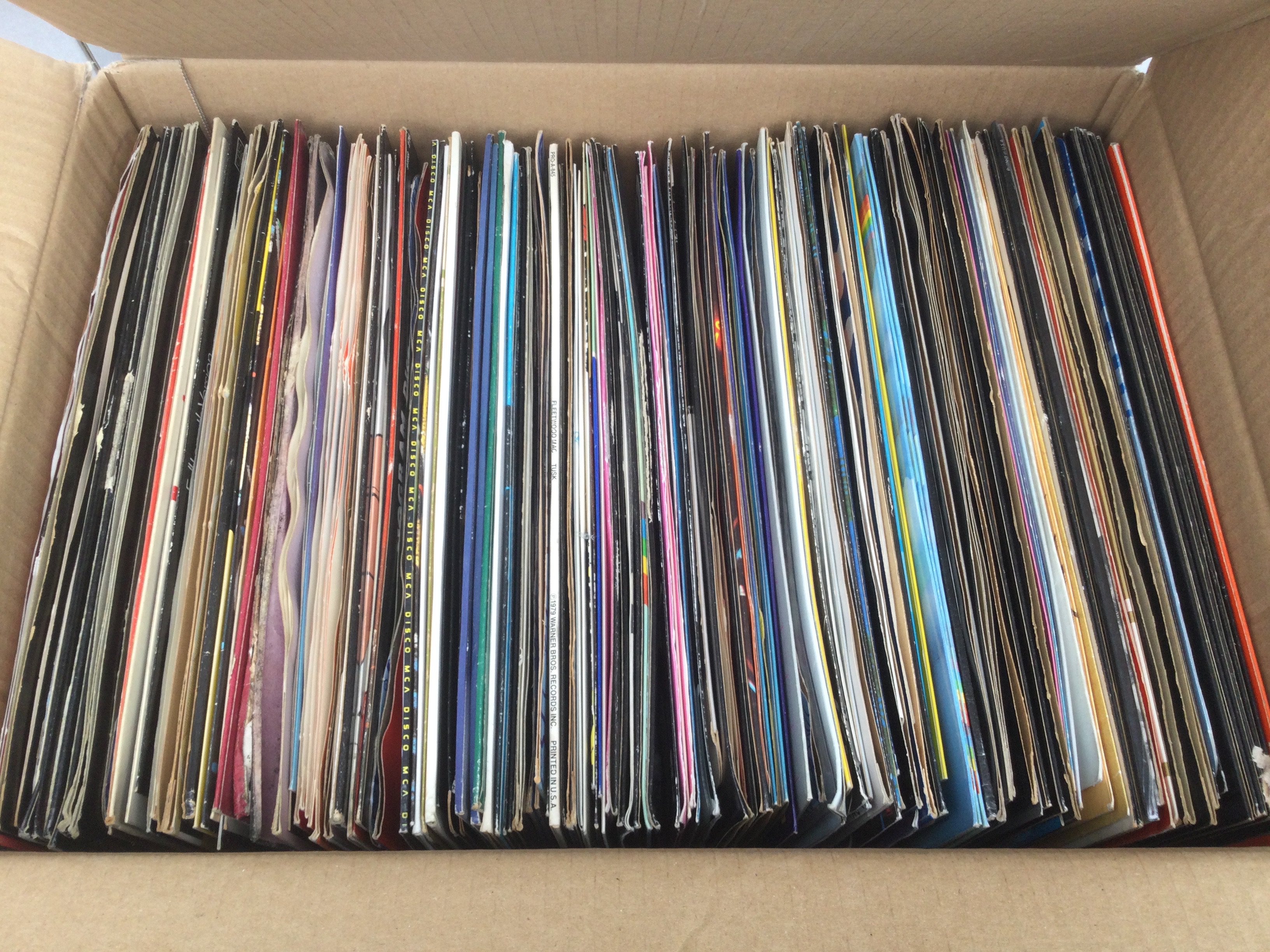 Two boxes of LPs and 12" singles by various artists including Rory Gallagher, Steely Dan, James Brown and many more.