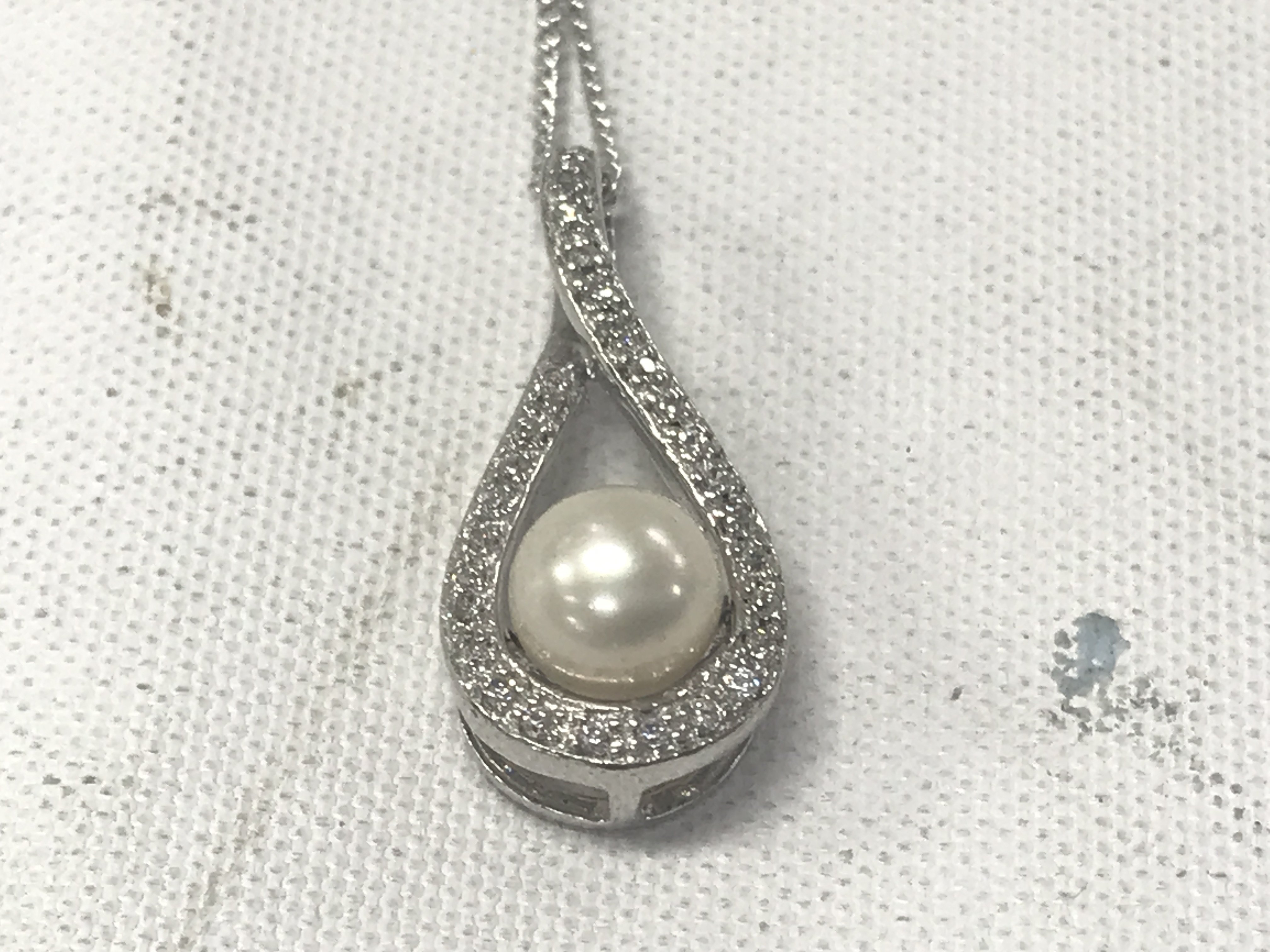 Silver pear-shaped pendant set with a cultured pearl and white cubic zirconia, on a silver chain.