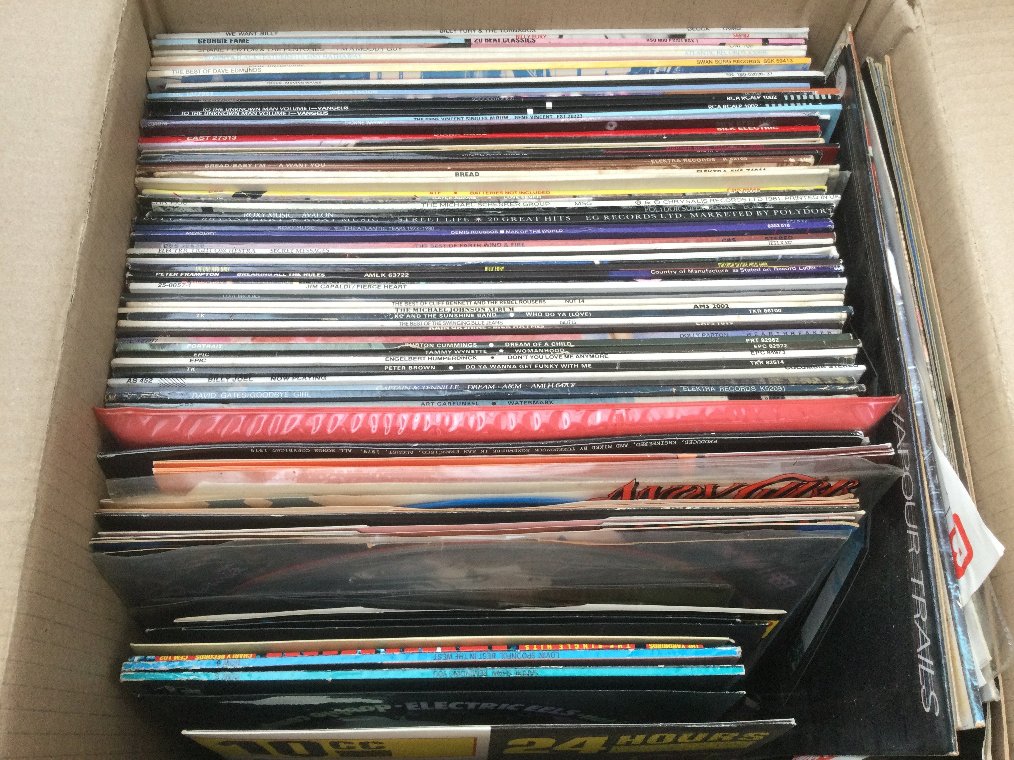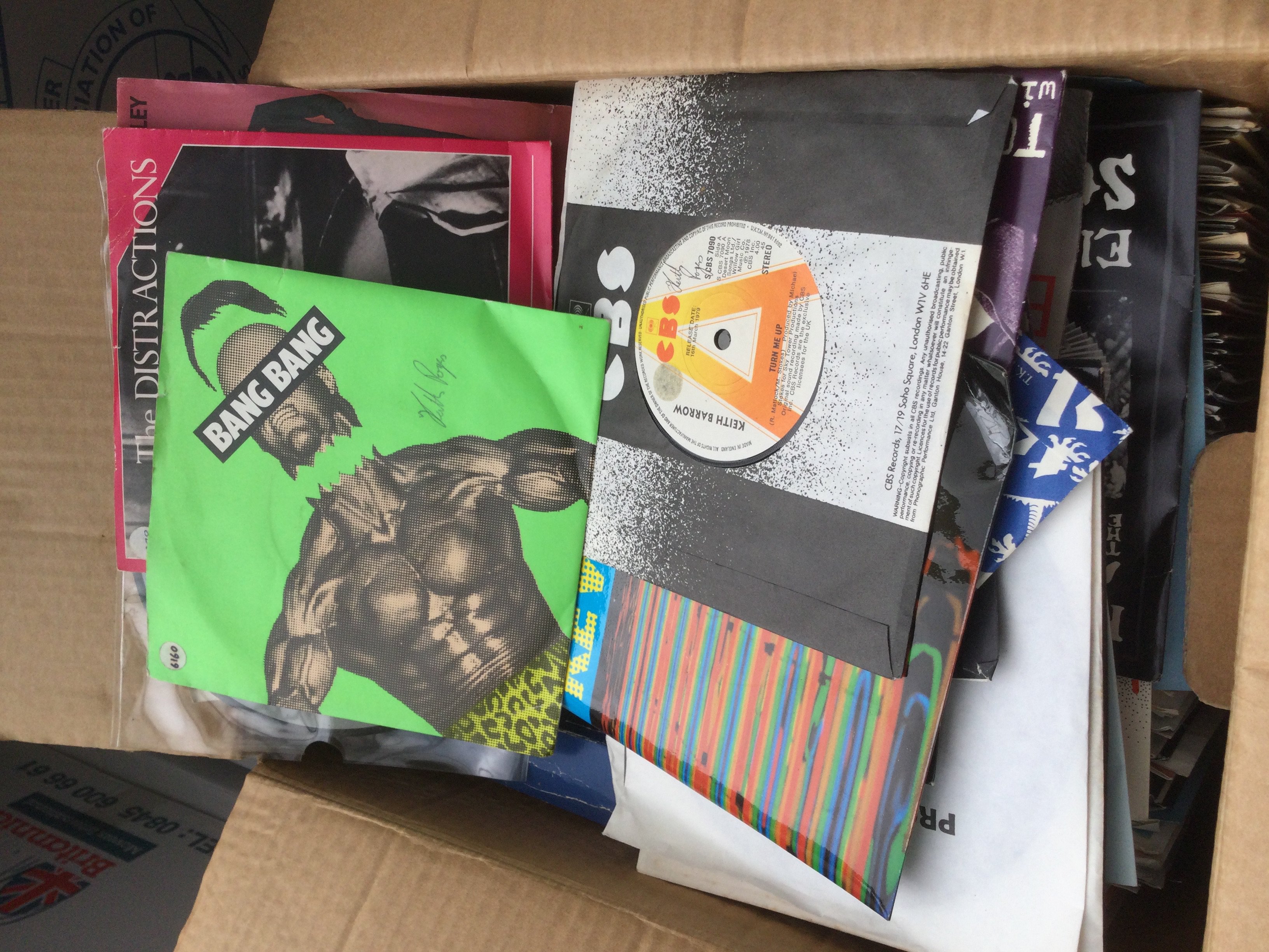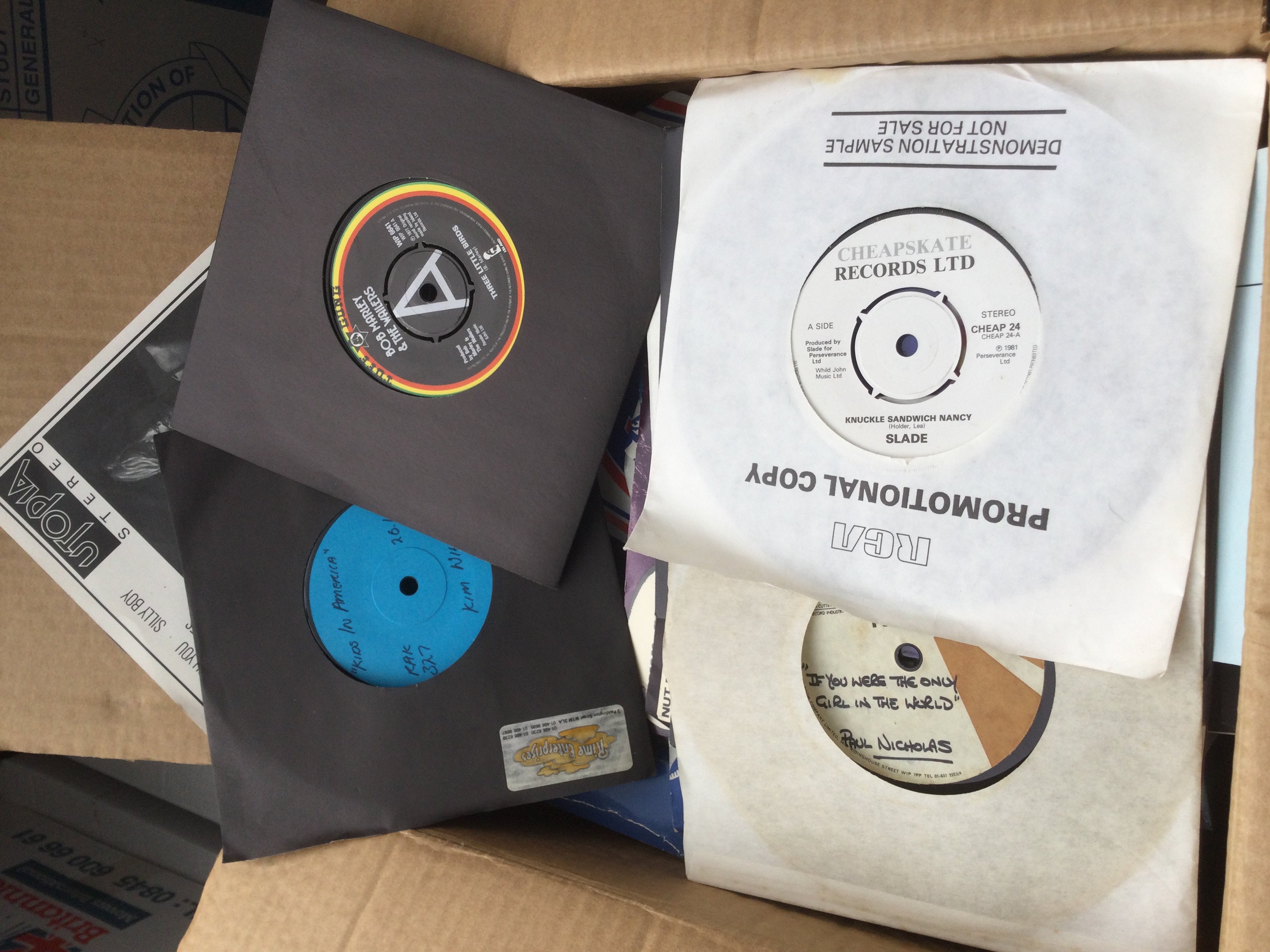 Two boxes of promo LPs and 7" singles by various artists plus many picture discs. Artists include David Bowie, Slade, Billy Fury and many more.