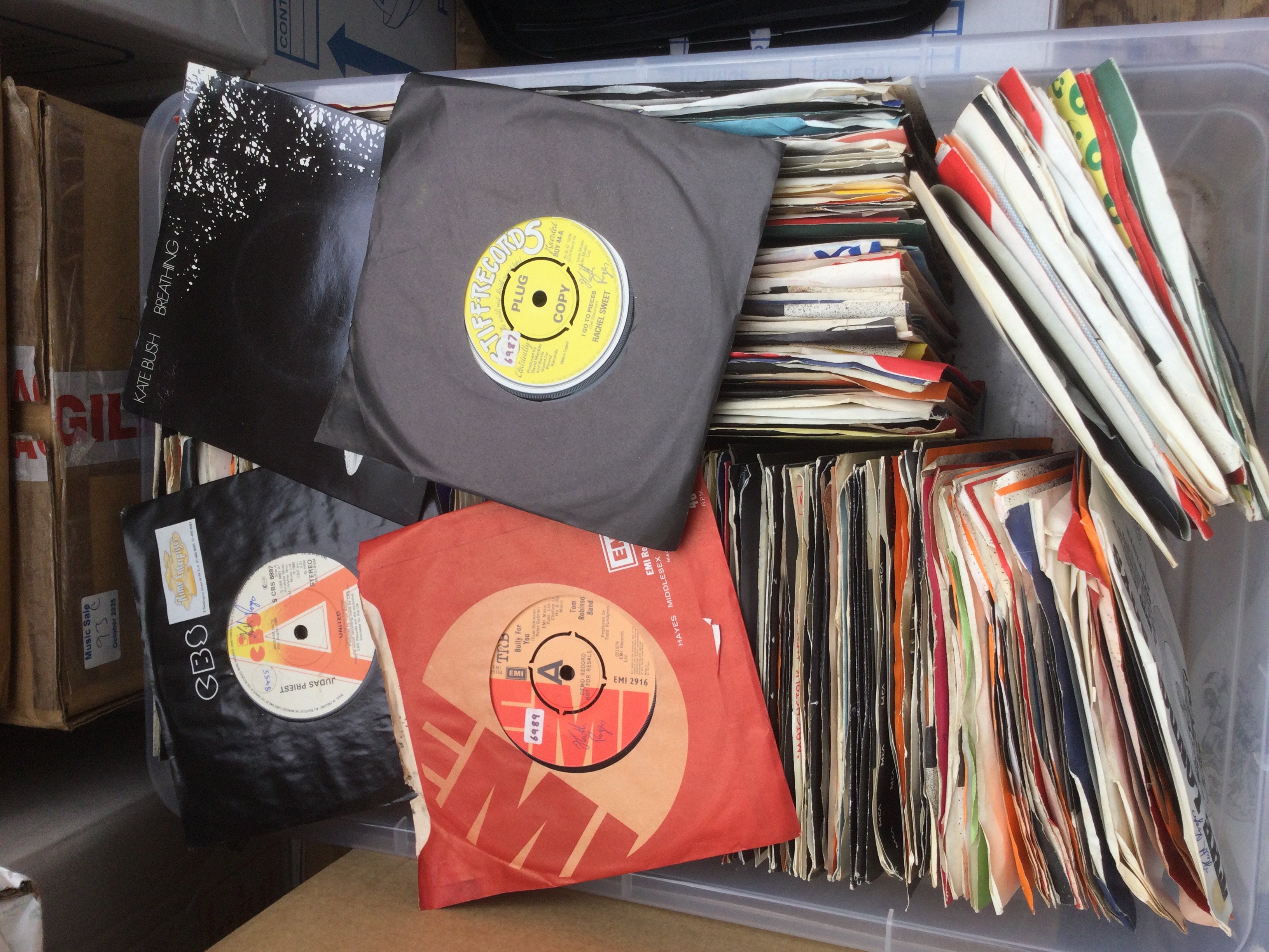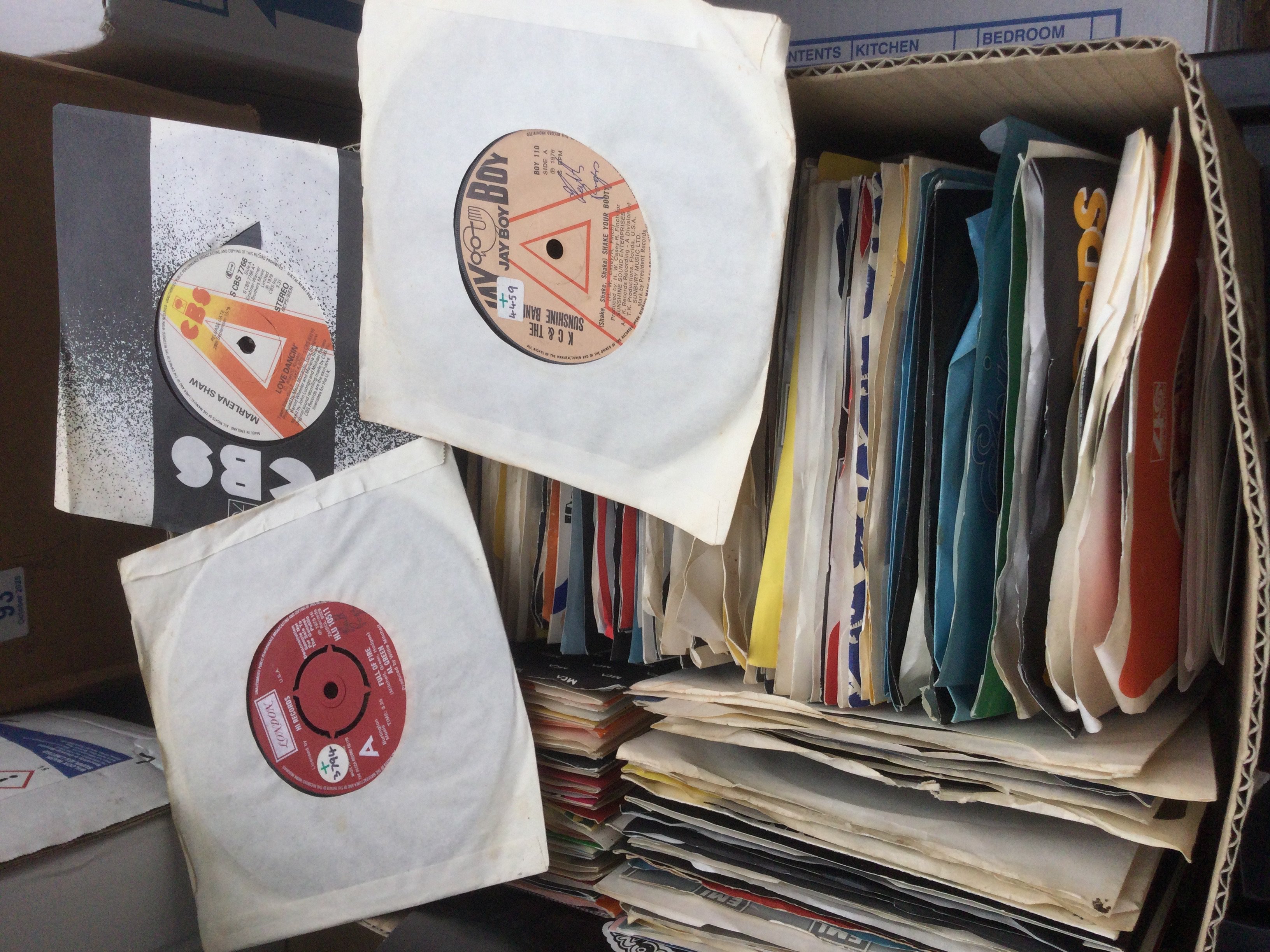 Two boxes of promo 7" singles by various artists including Judas Priest, Steely Dan, Kate Bush and many more.