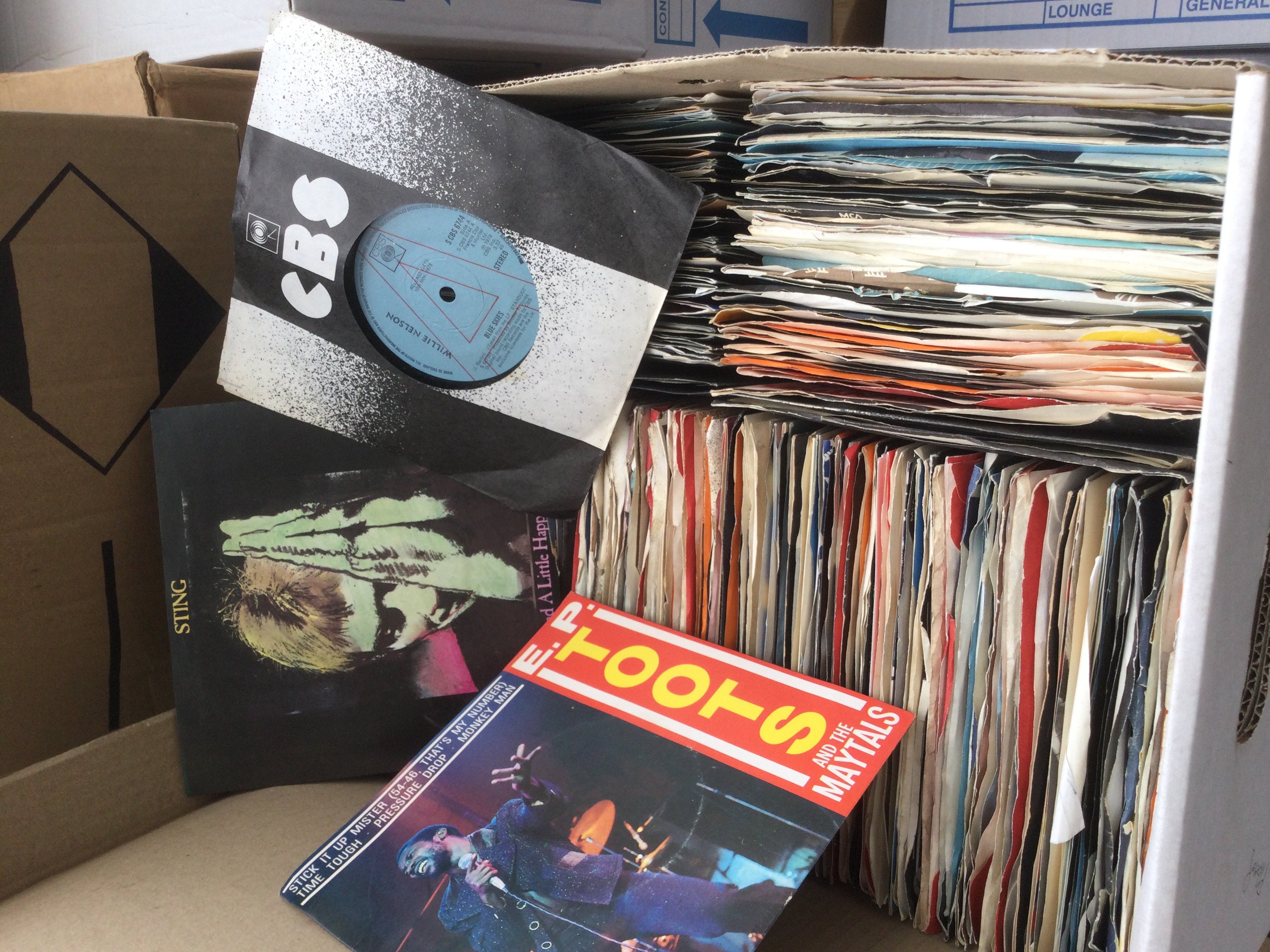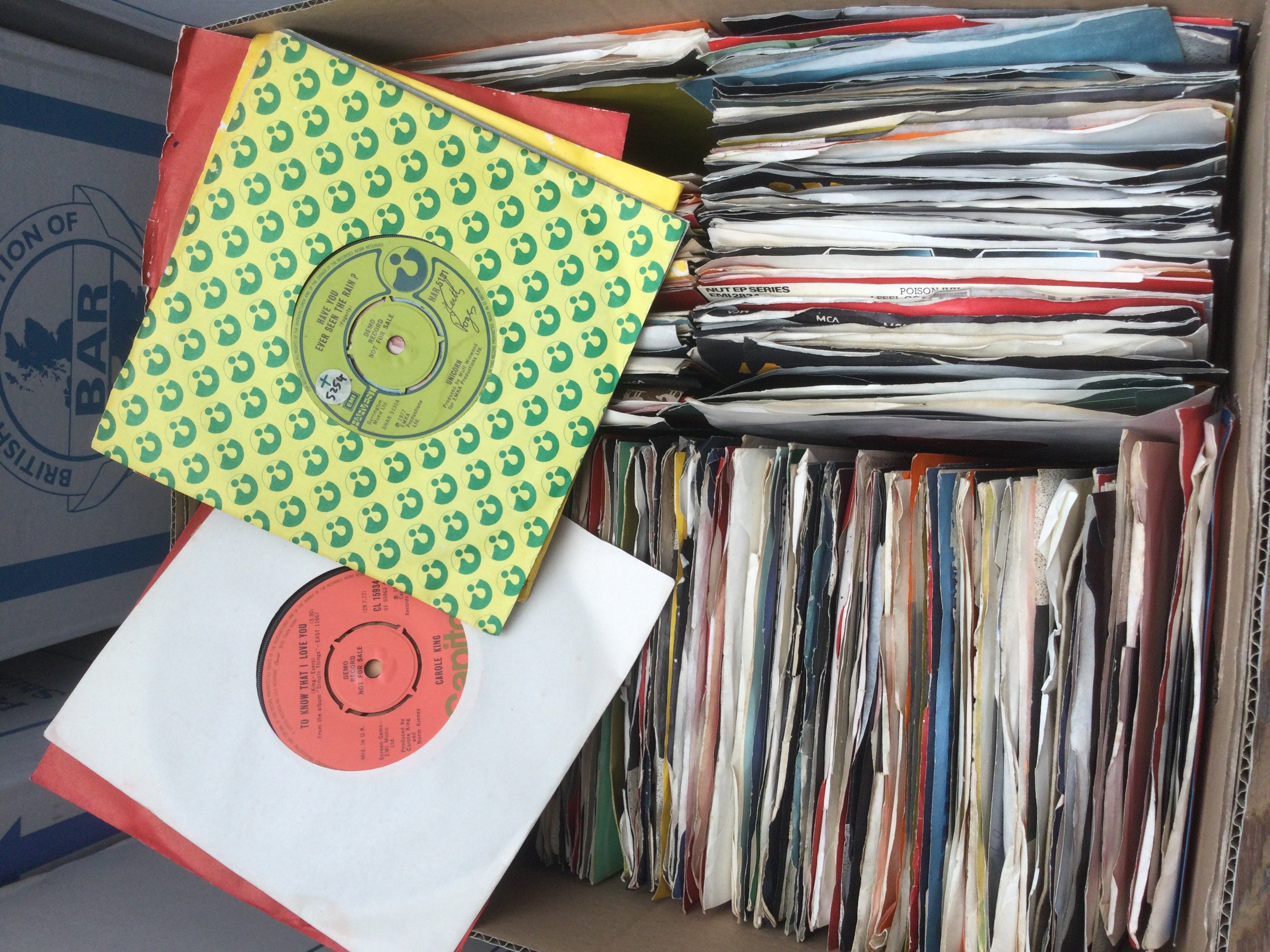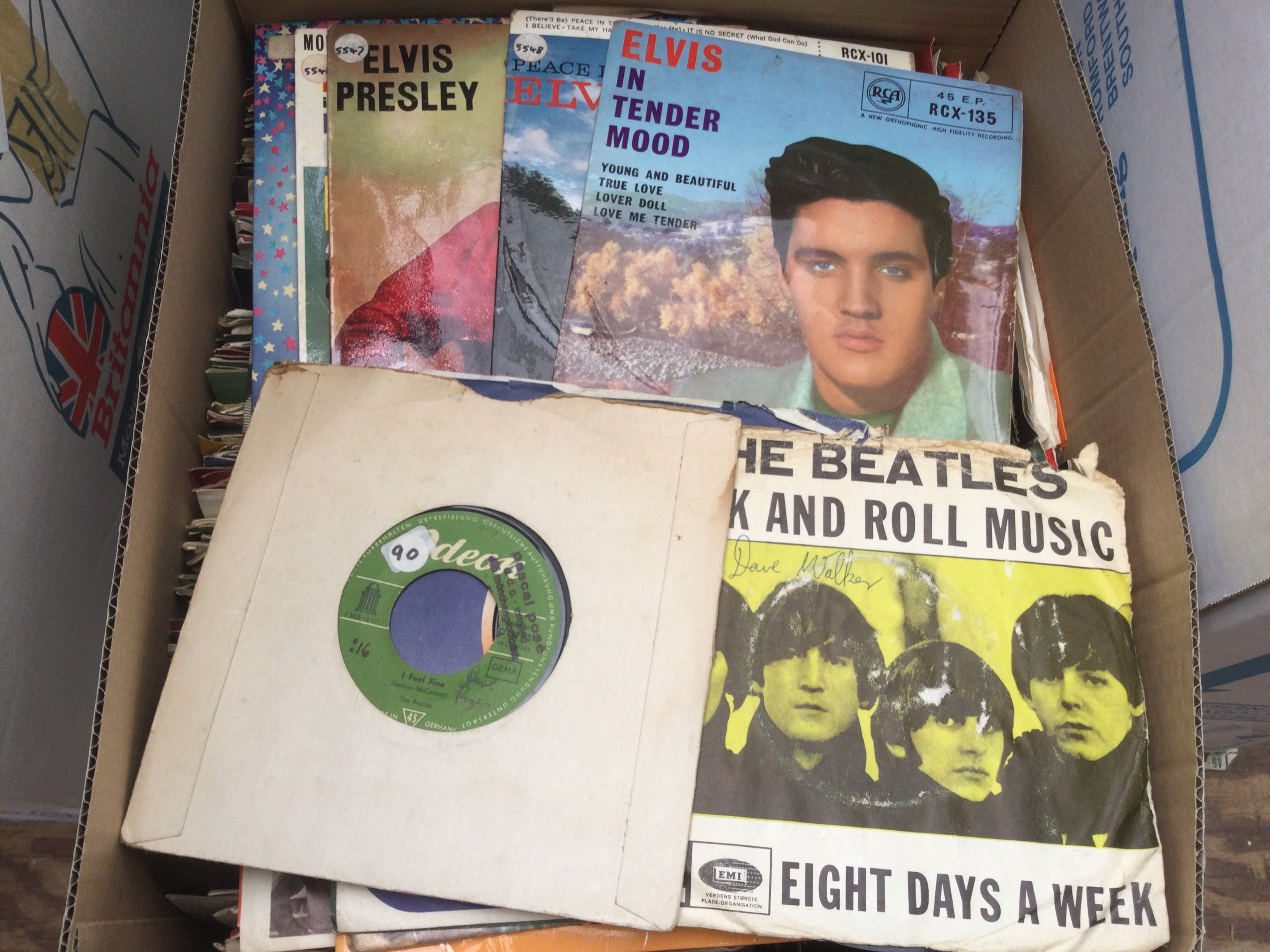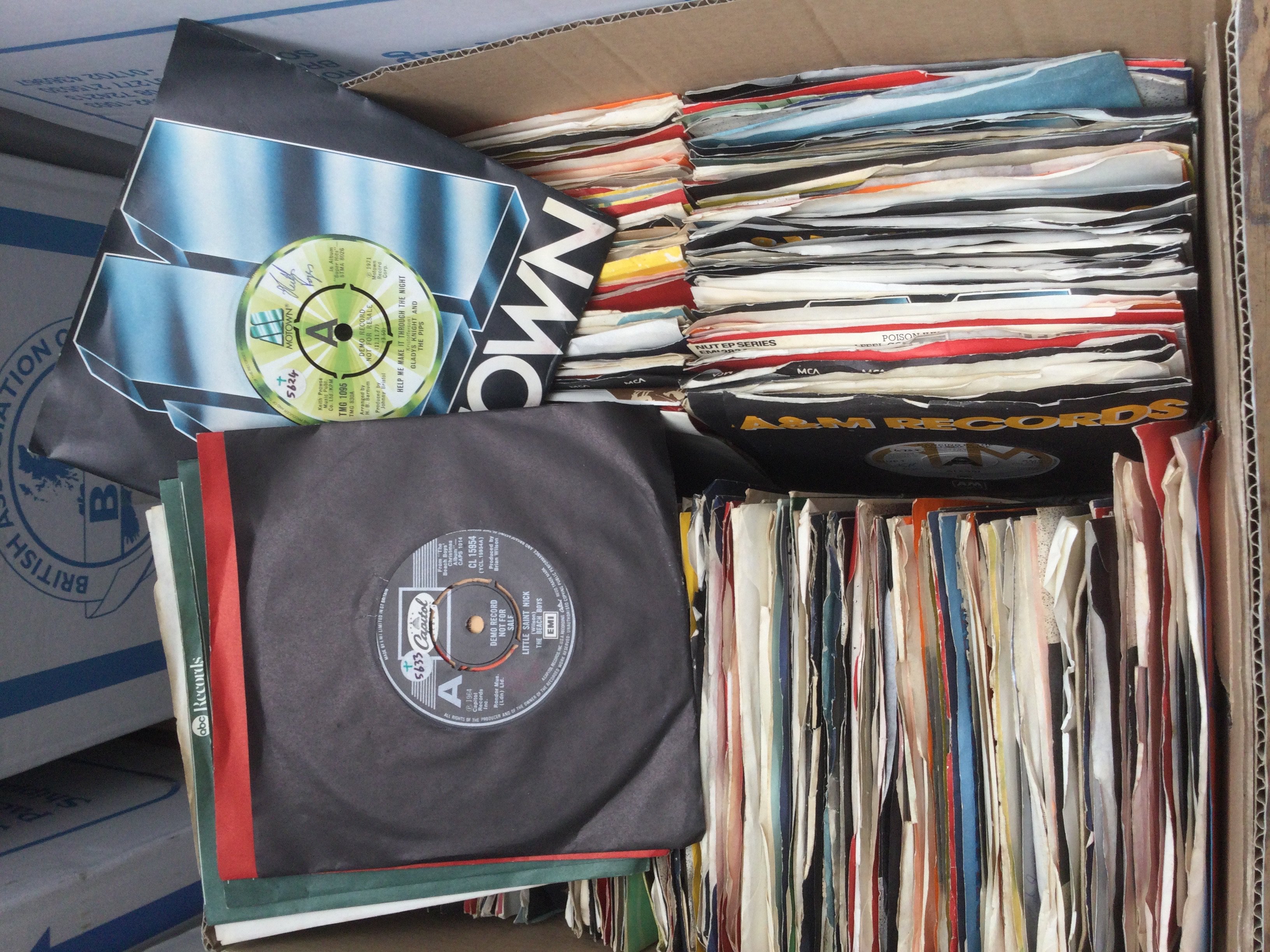 Two boxes of promo 7" singles by various artists including Wings, Billy Joel, The Beach Boys and many more plus some foreign Beatles singles and Elvis Presley EPs.