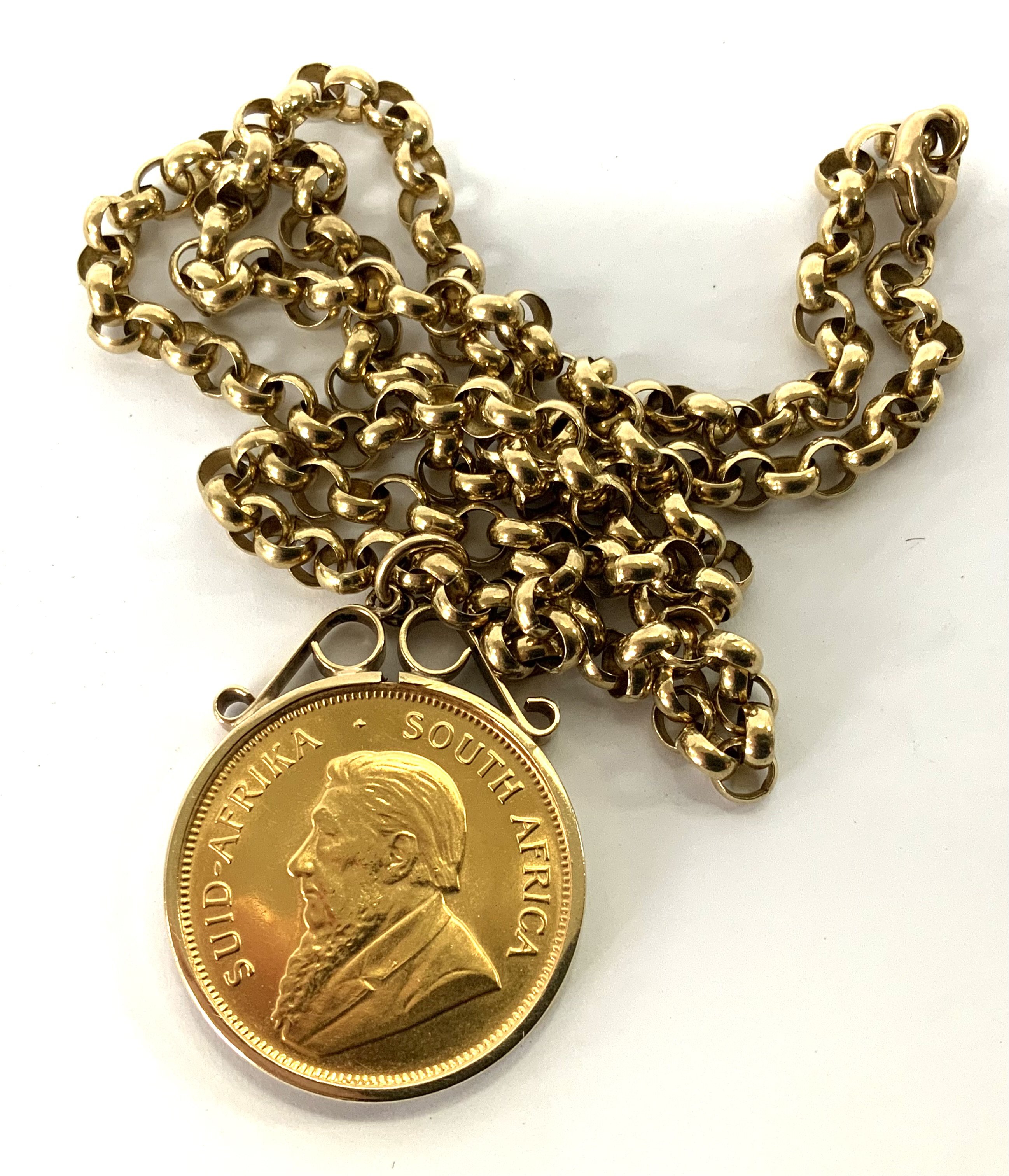 A 1980 1/2 South African gold Kruggerand, within and 9ct gold coin mount and chain. 40.34g (A)
