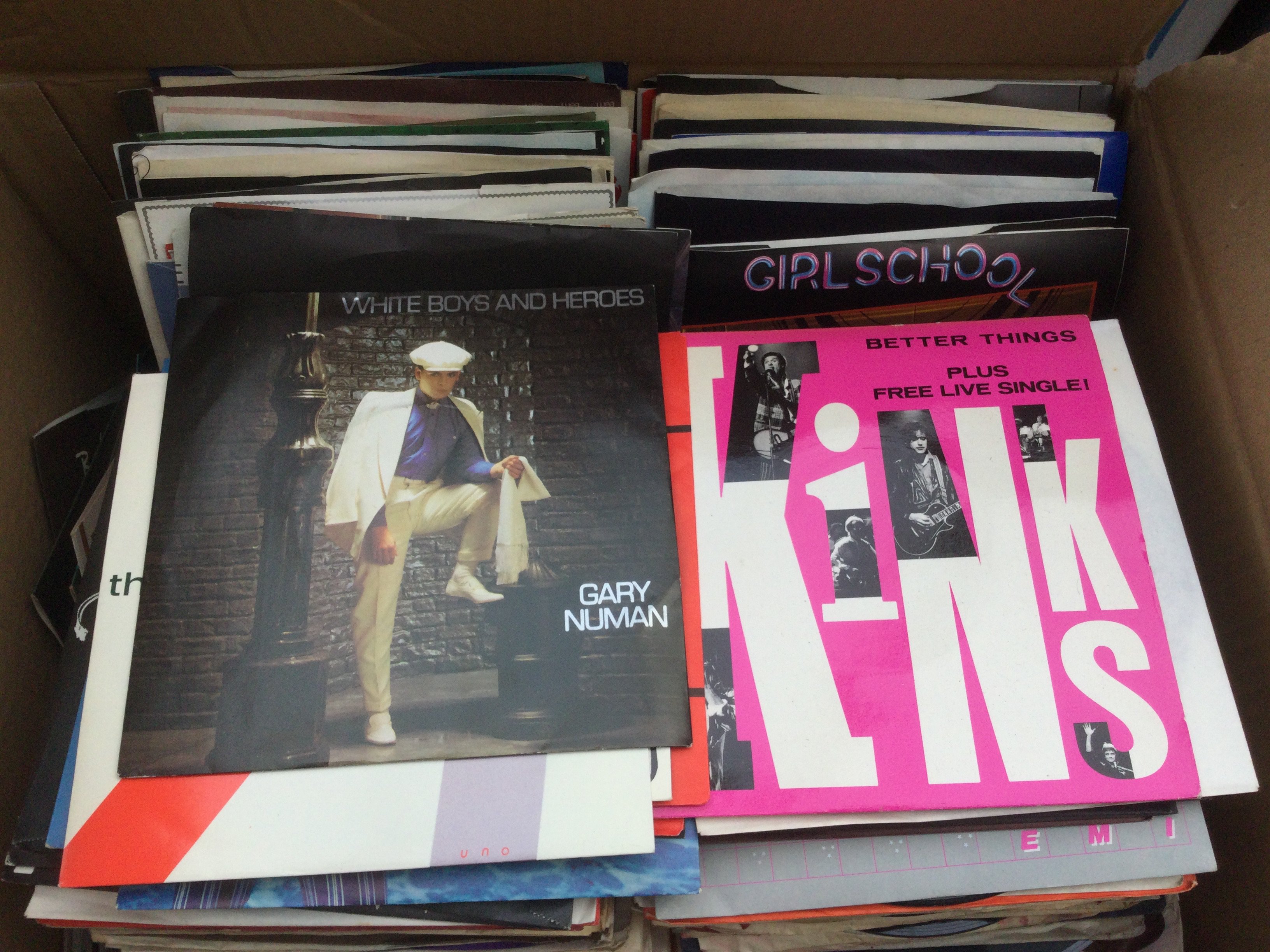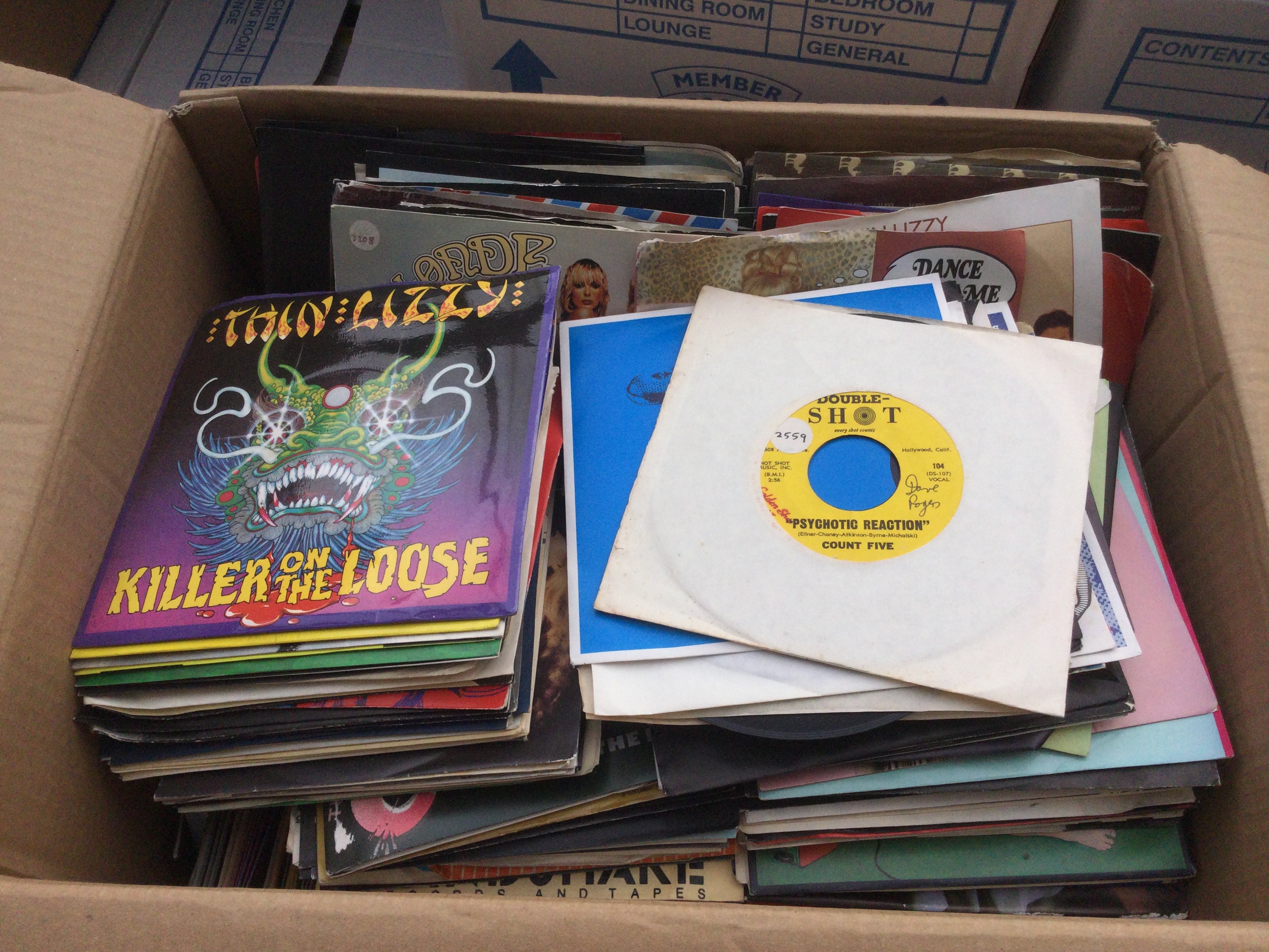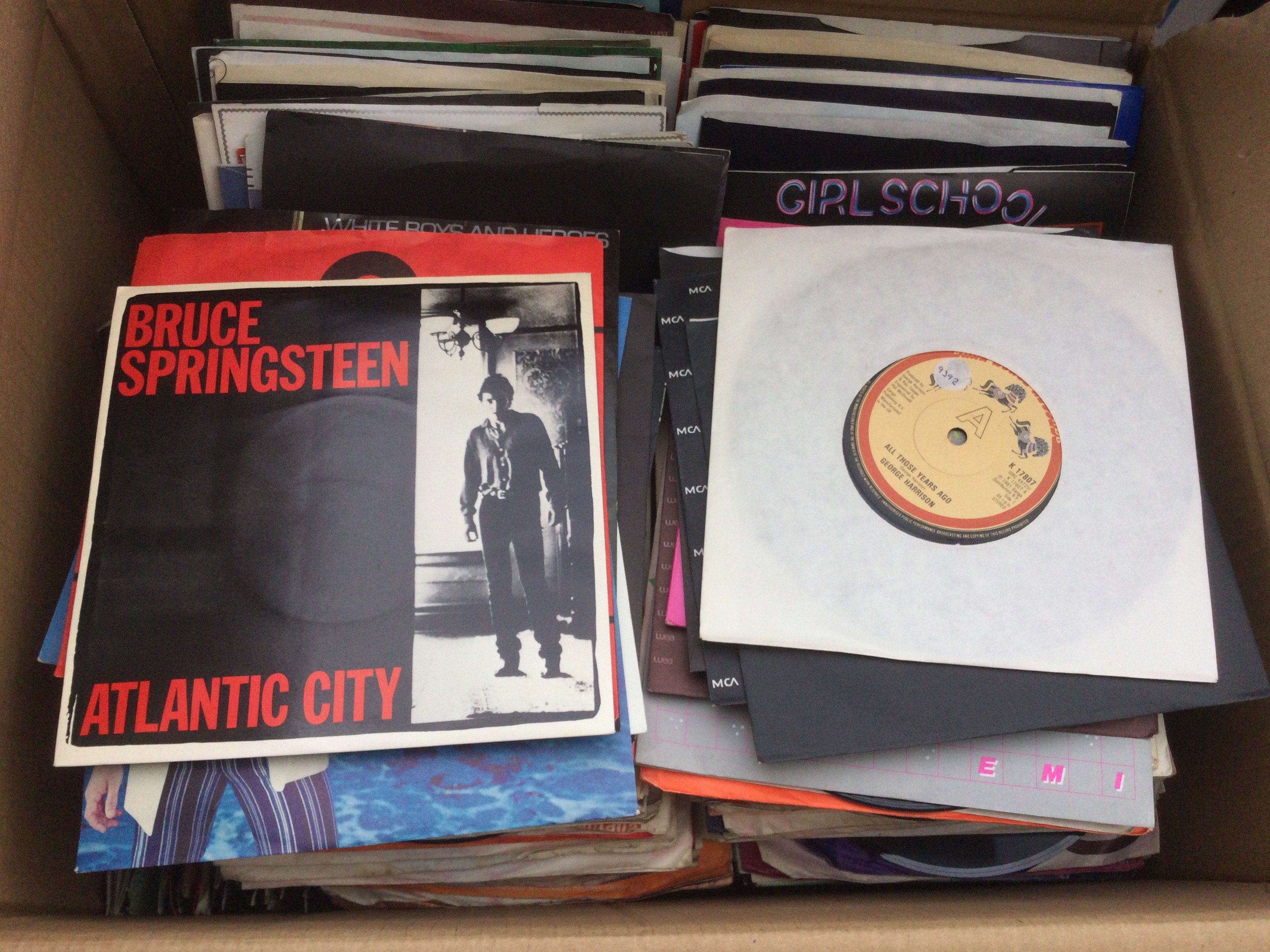 Two boxes of 7" singles by various artists including The Jam, Bob Marley, Bruce Springsteen and many more.