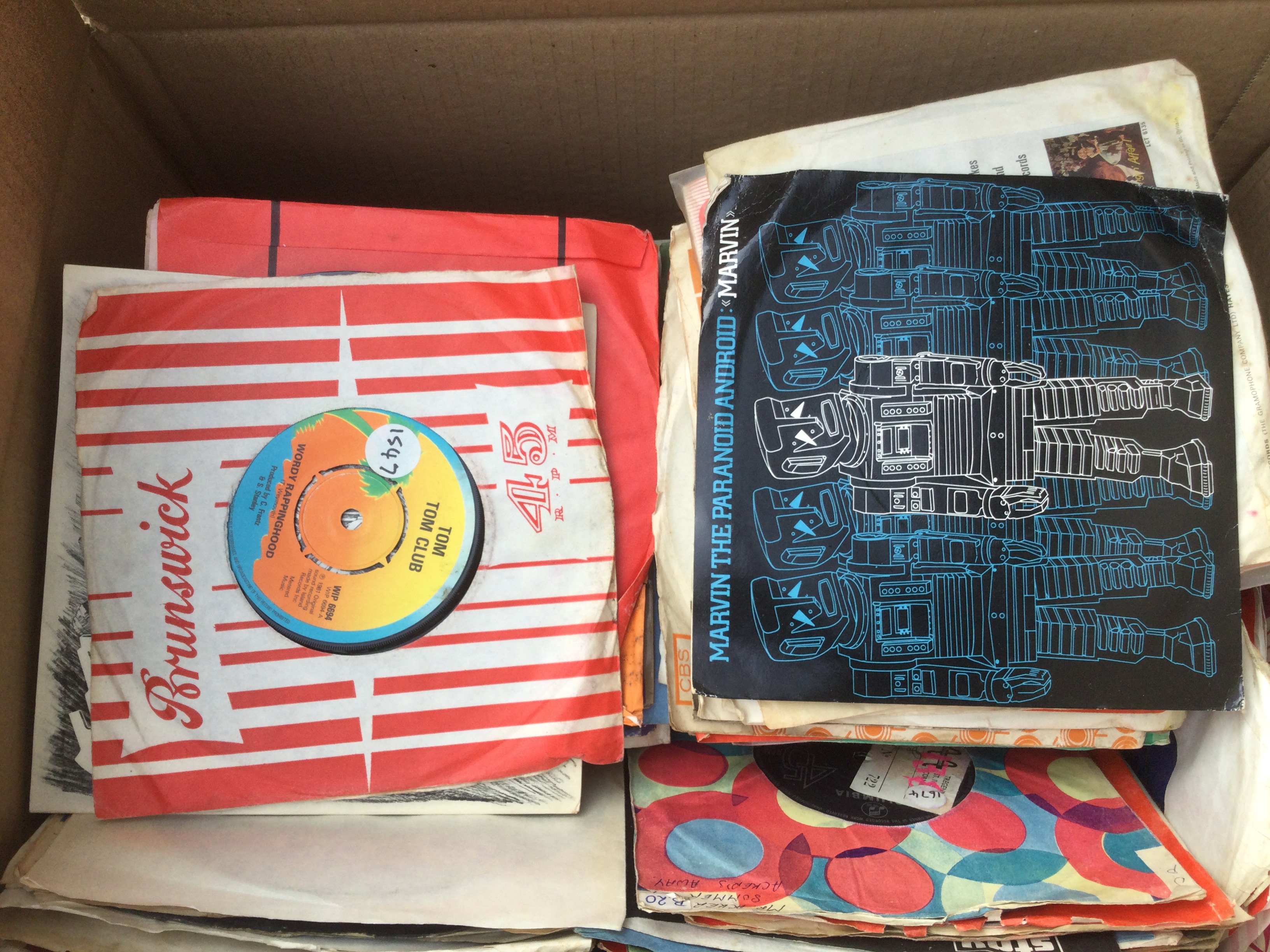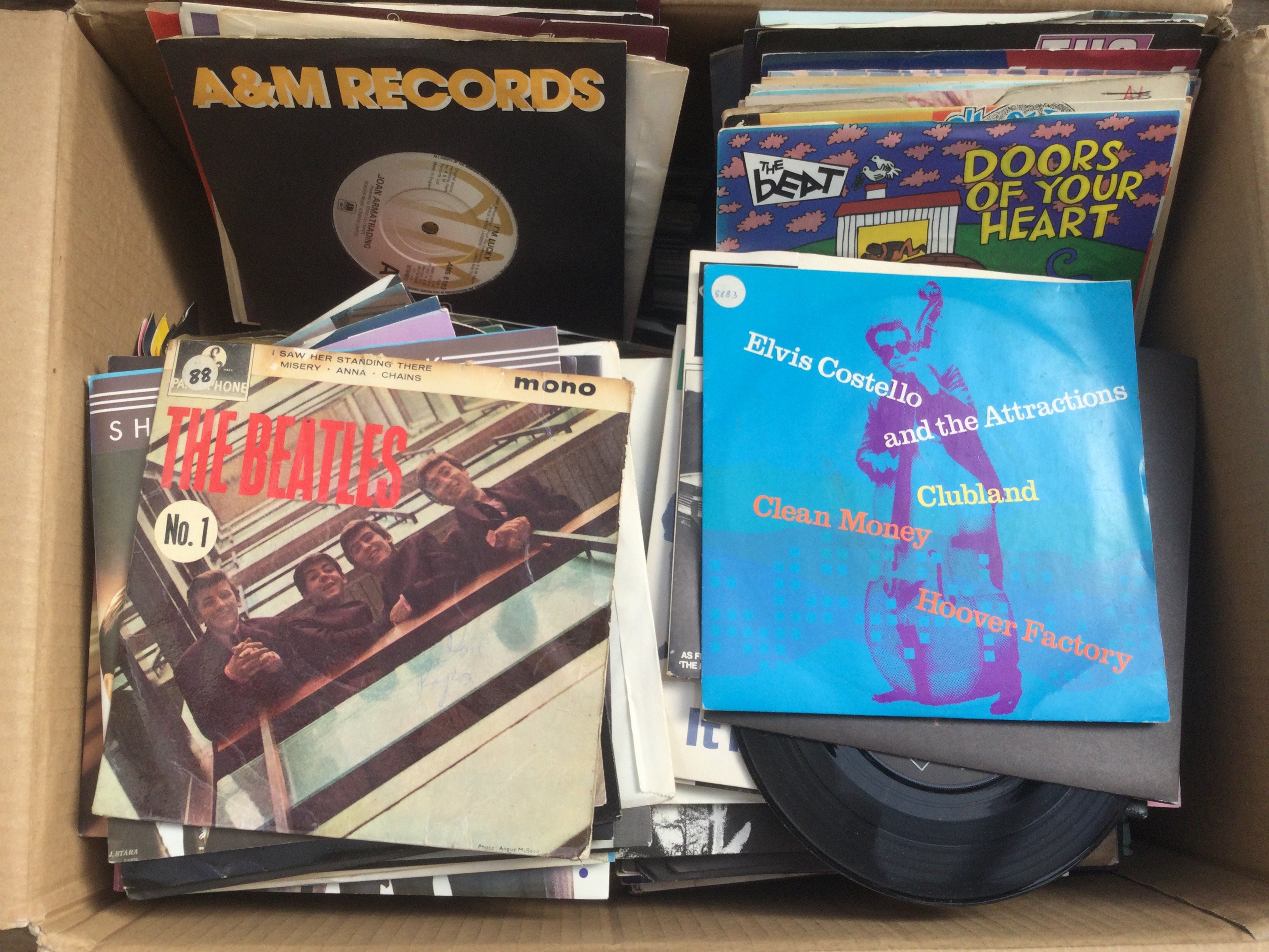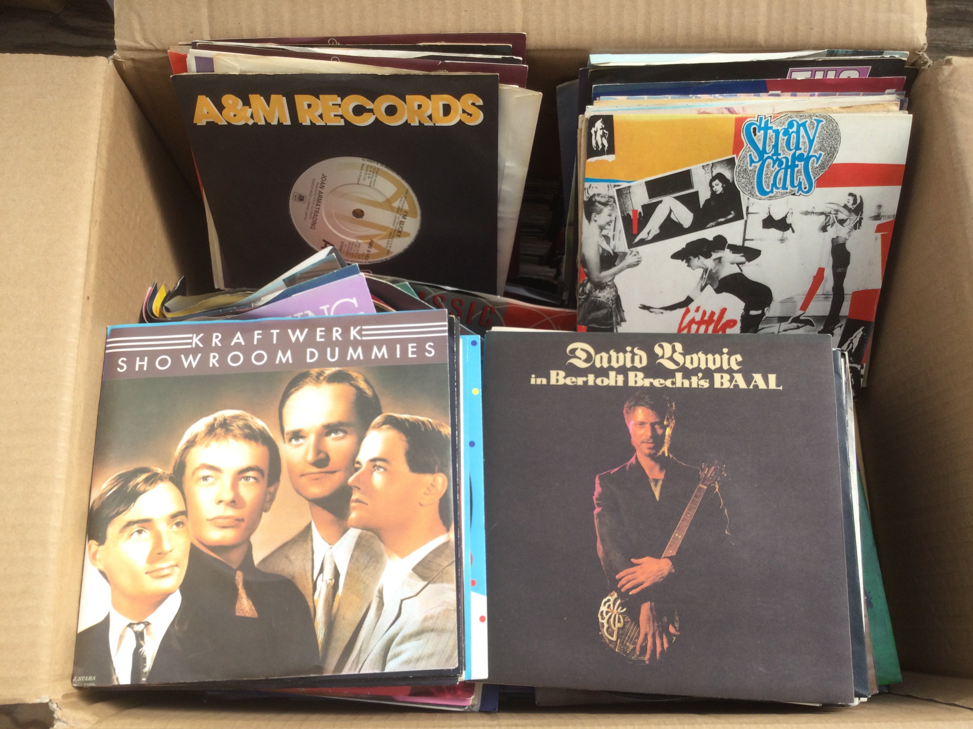 Two boxes of 7" singles and EPs by various artists including David Bowie, Kraftwerk, Steel Pulse and many more.