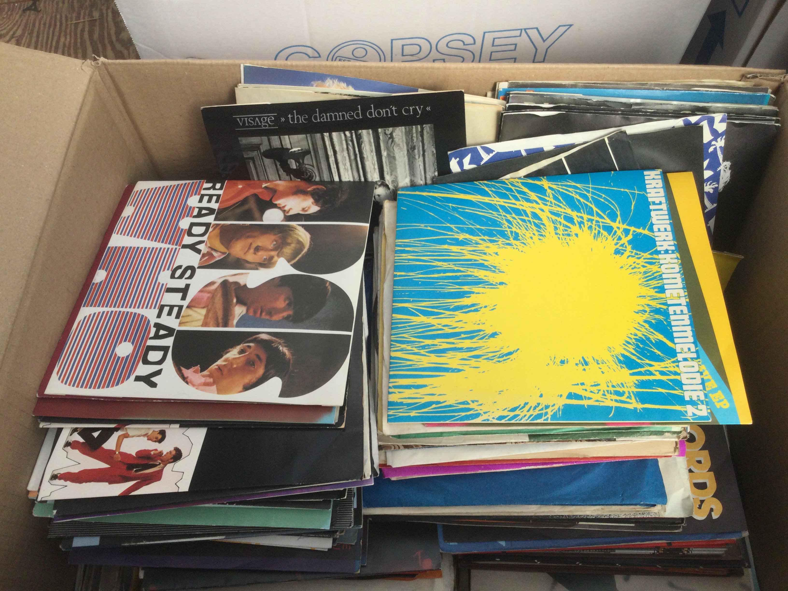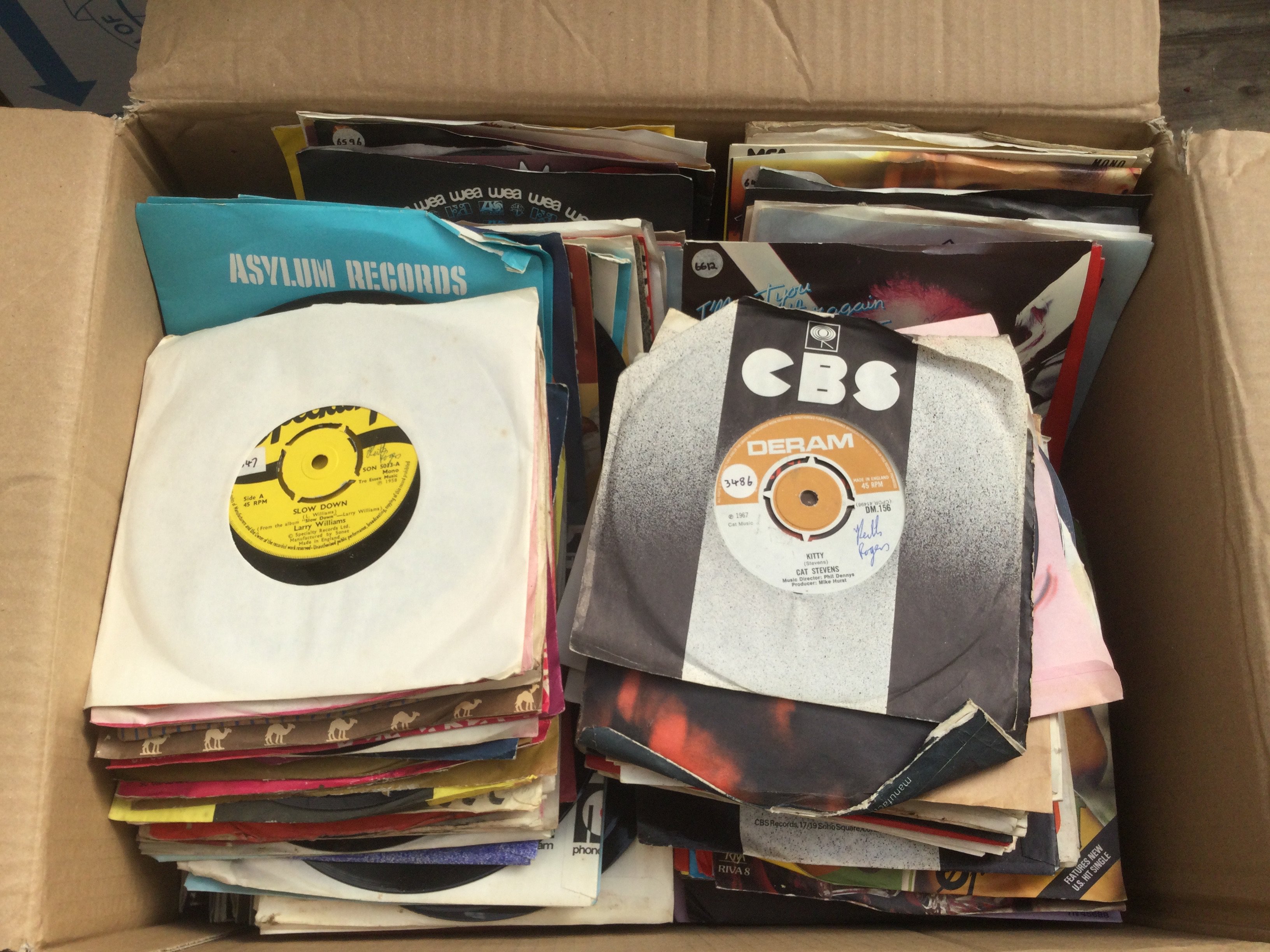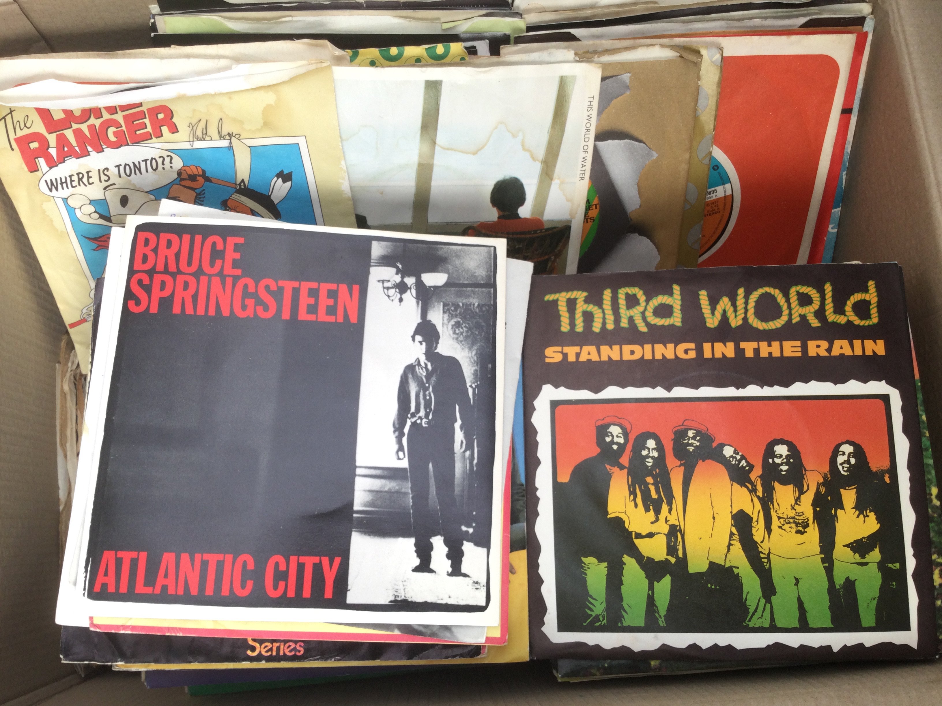 Three boxes of 7" singles and EPs by various artists including Jethro Tull, The Kinks, Bruce Springsteen and many more.