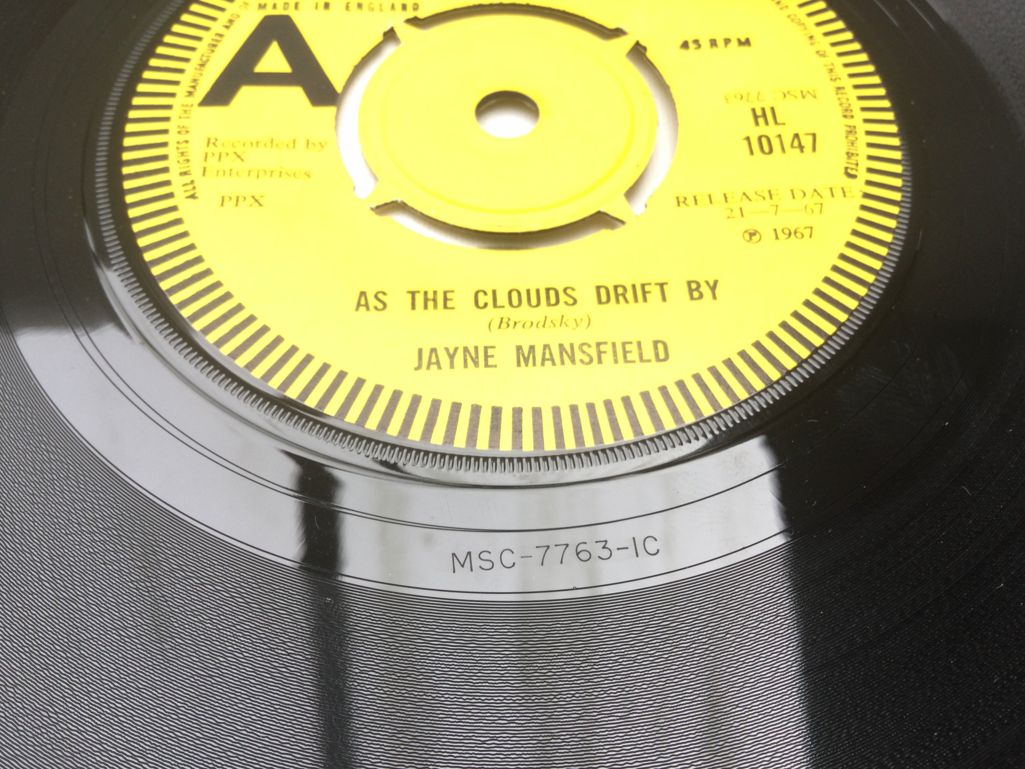 A very rare 7" demo disc by Jayne Mansfield featuring Jimi Hendrix of As The Clouds Drift By b/w Suey. Condition Ex.