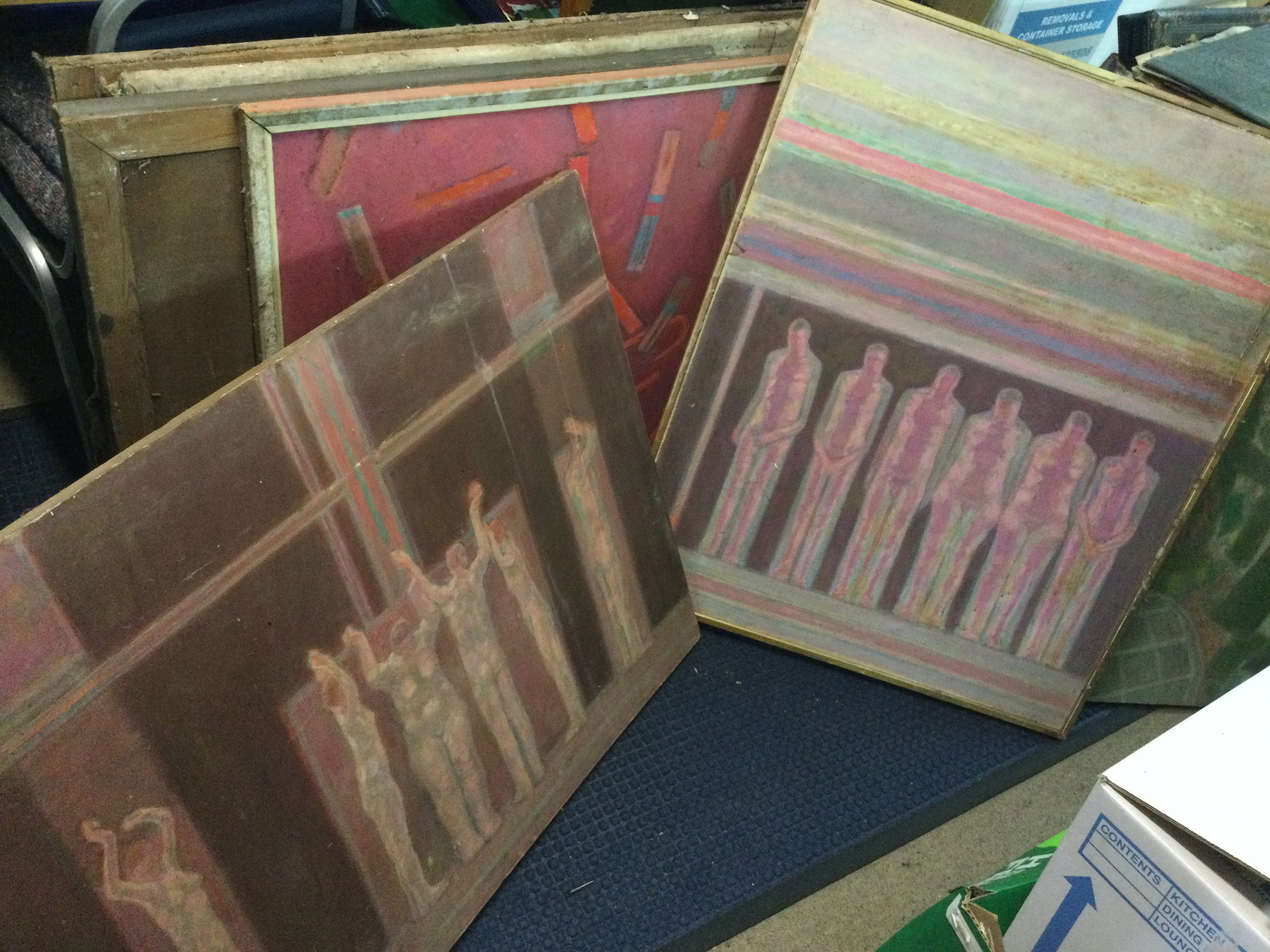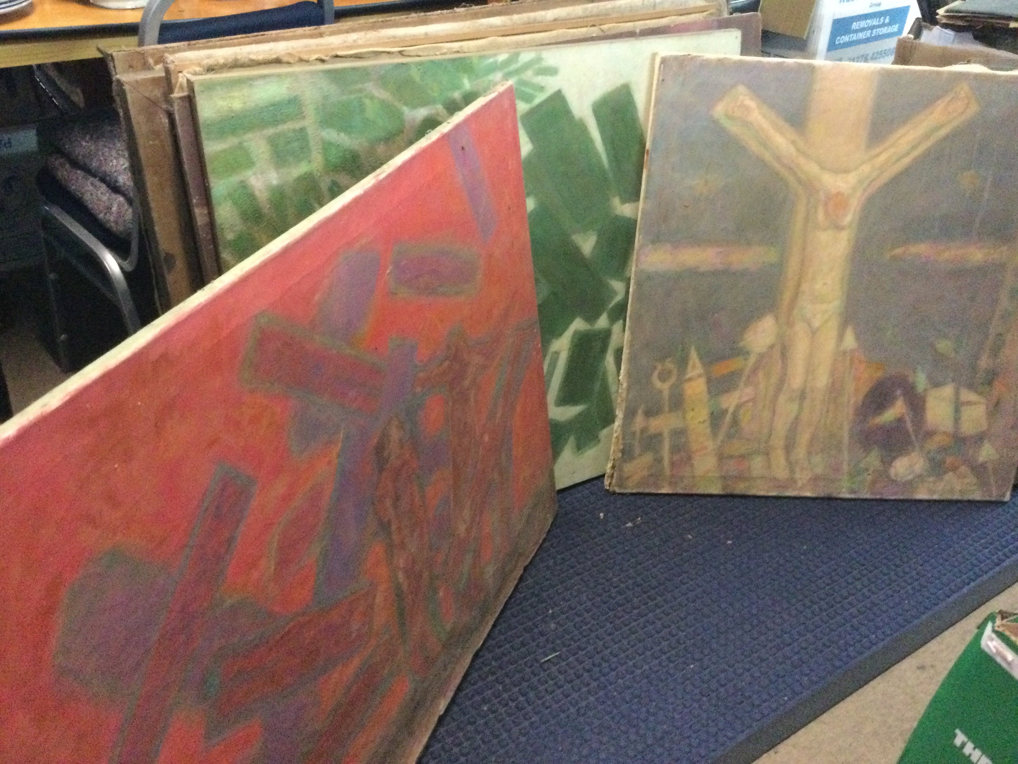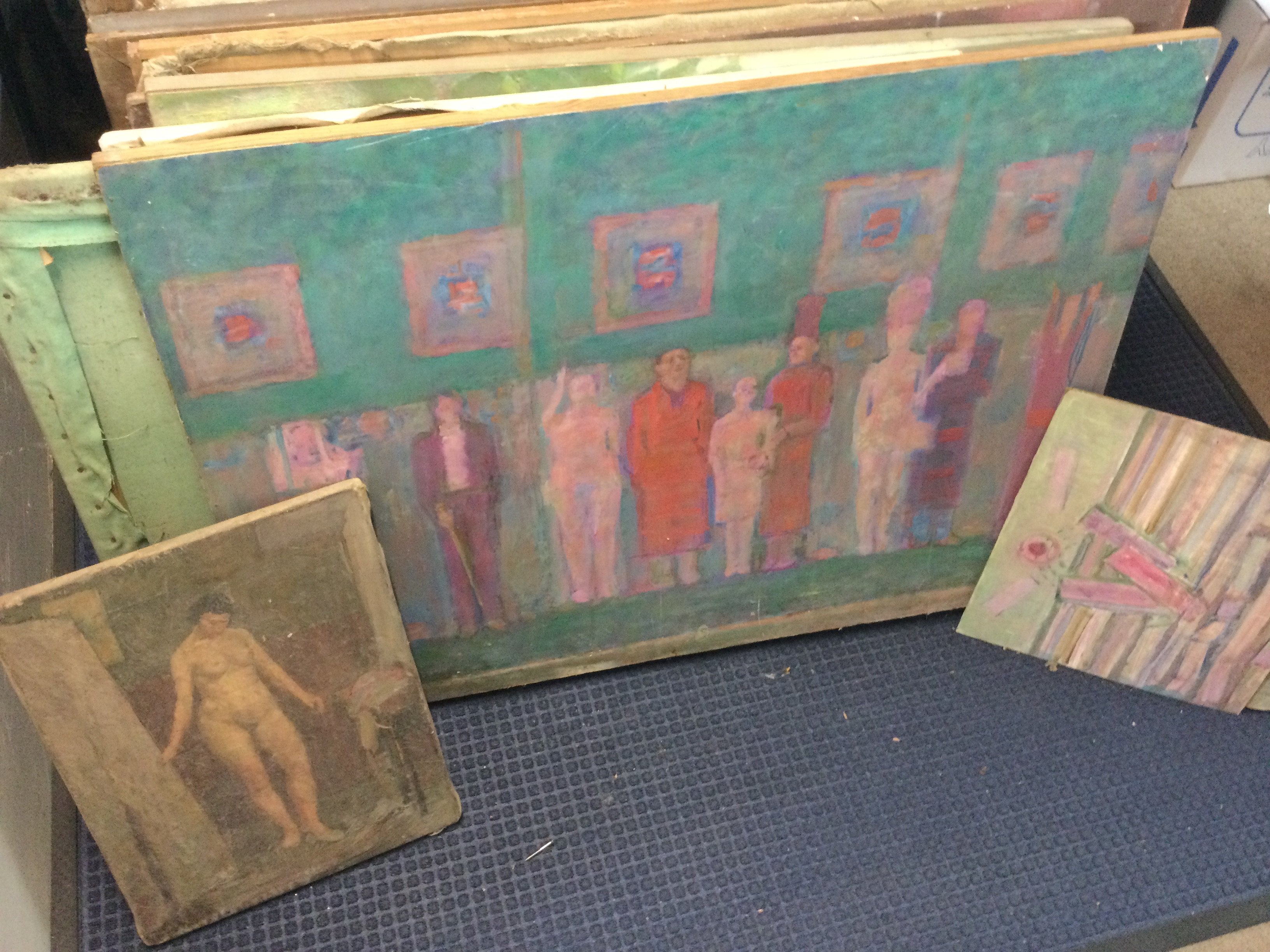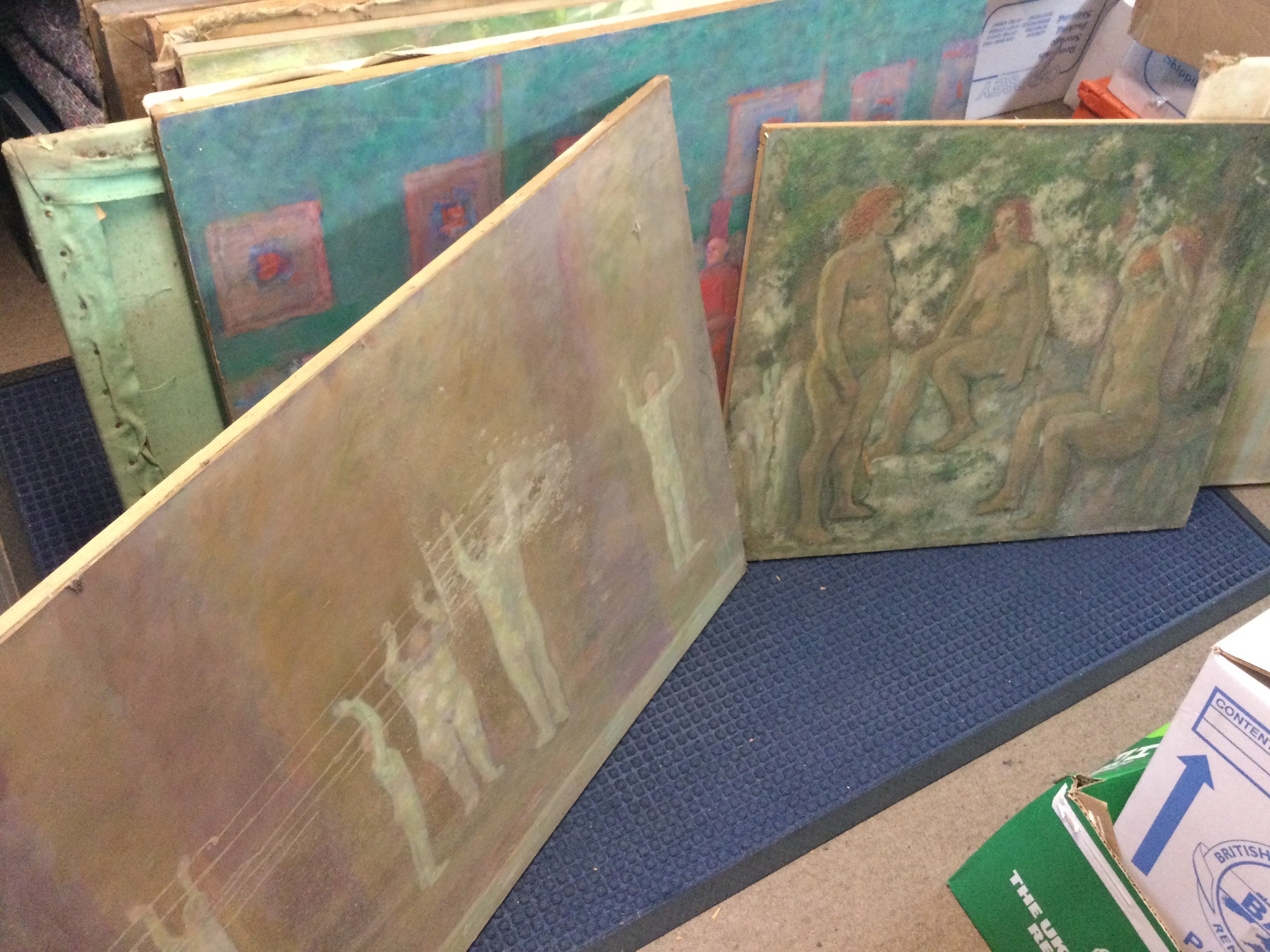 A collection of unframed Albert Harold Palmer (1911 - 1985 ) paintings including nudes, abstract etc. Artist and teacher, born in Northamptonshire, who studied art part-time, then full-time at Grimsby School of Art, 1923 - 9, worked in a London commercial art studio, 1929 - 33, then attended Royal College of Art, 1933 - 6. In 1938 he received a Travelling Scholarship from the College, also a Gold Medal. After copying House of Commons murals for the World Trade Exhibition in New York, 1938 - 9, Palmer from 1939 - 45 served in the Camouflage Corps, then spent 1947 - 9 in a tuberculosis sanatorium in Switzerland. He was on the staff of Maidstone Art School, 1950 - 4, from 1954 - 62 was lecturer in painting at Gravesend Art School, then acting principal; and was head of art and craft at Gravesend Adult Education Centre, 1962 - 77. From 1977 - 85 painted full-time at his own studio gallery in central London.