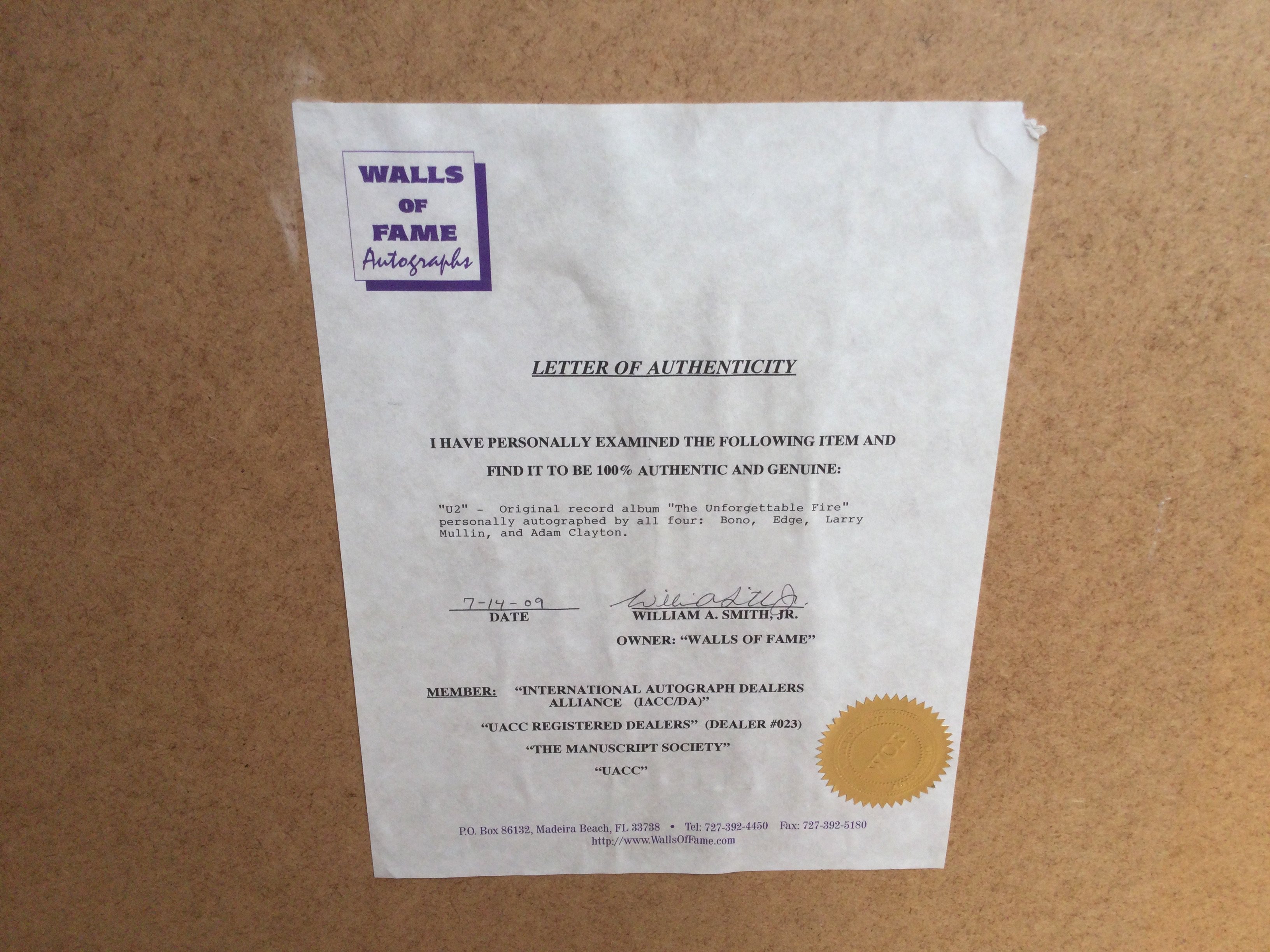 A framed and glazed U2 display signed by all band members with COA, approx 55cm x 100cm.