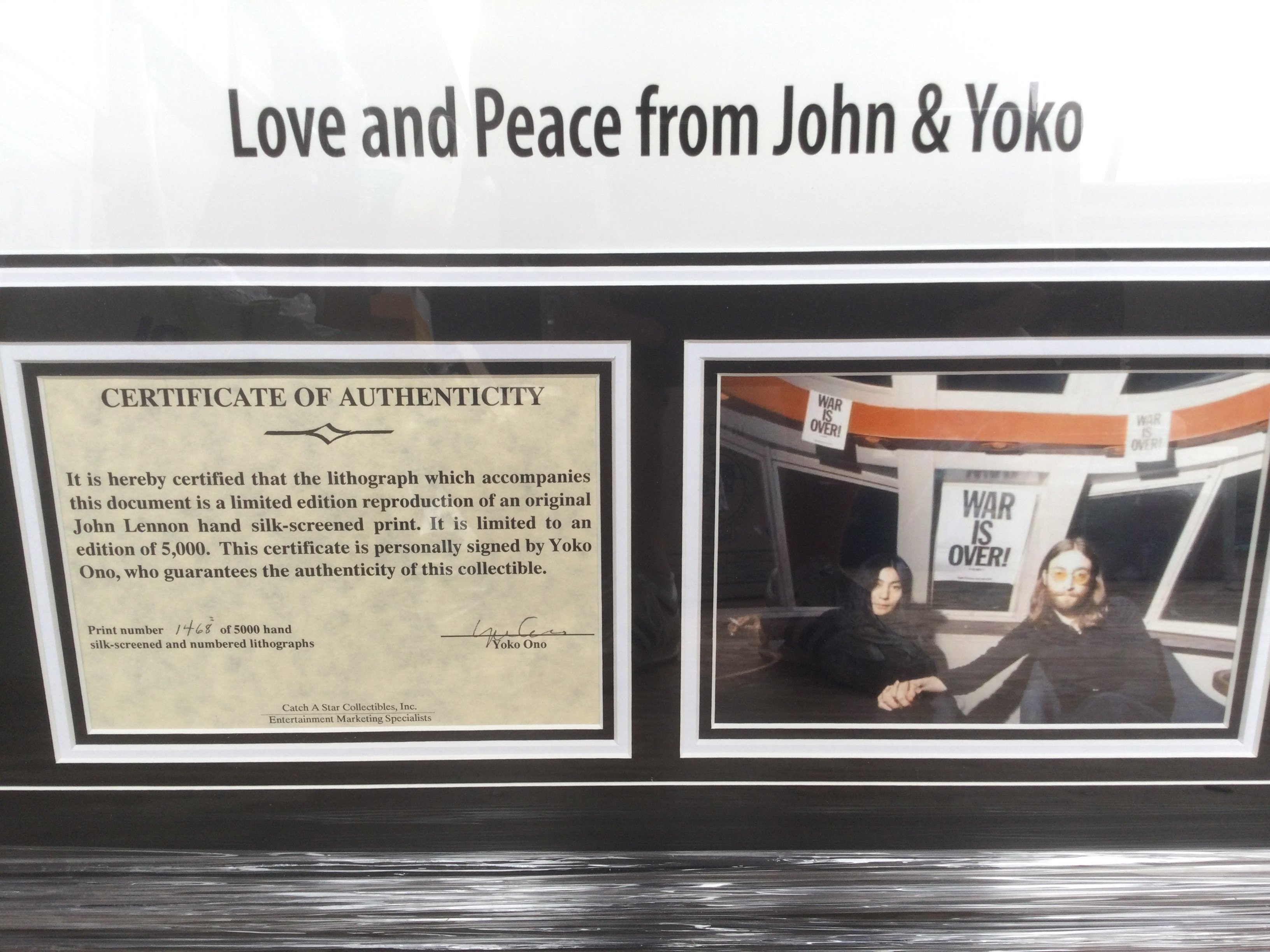 A framed and glazed limited edition John & Yoko lithographic print signed by Yoko Ono. This is one of 5,000 reproduced examples and comes with a COA. Approx 106cm x 69cm.
