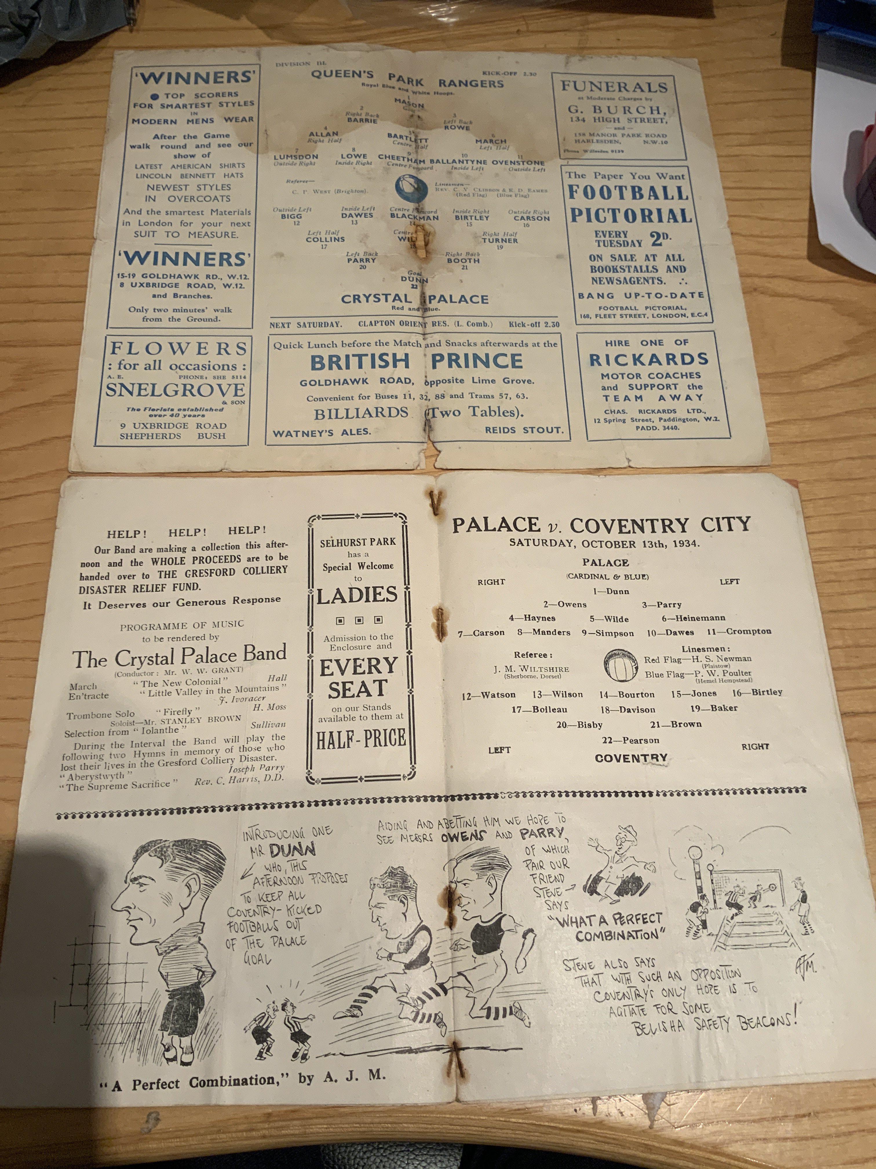 1930s Crystal Palace Football Programmes: Home v 34/35 Coventry with rusty staples but no team changes. C/W poor condition away at 35/36 QPR. (2)