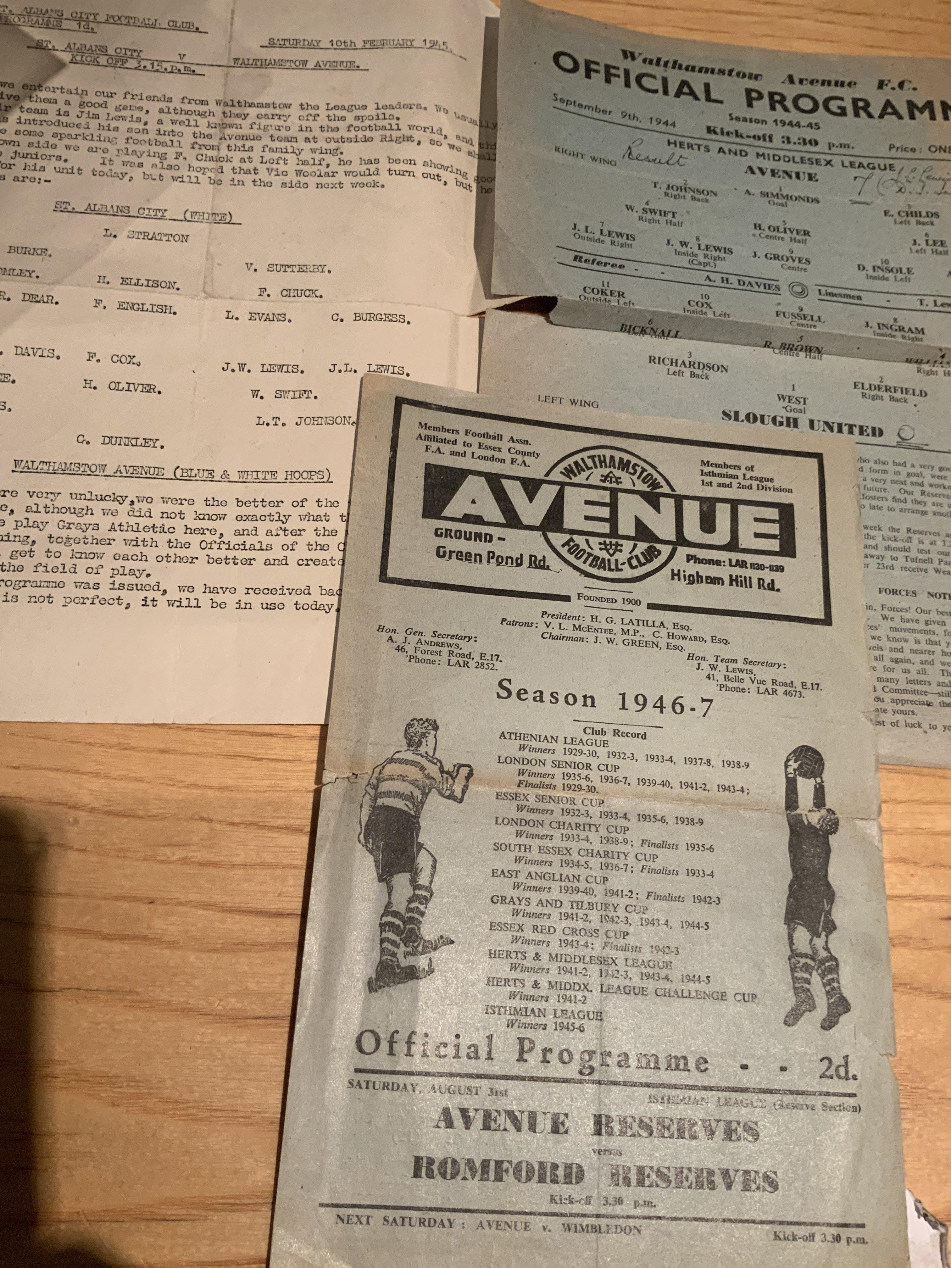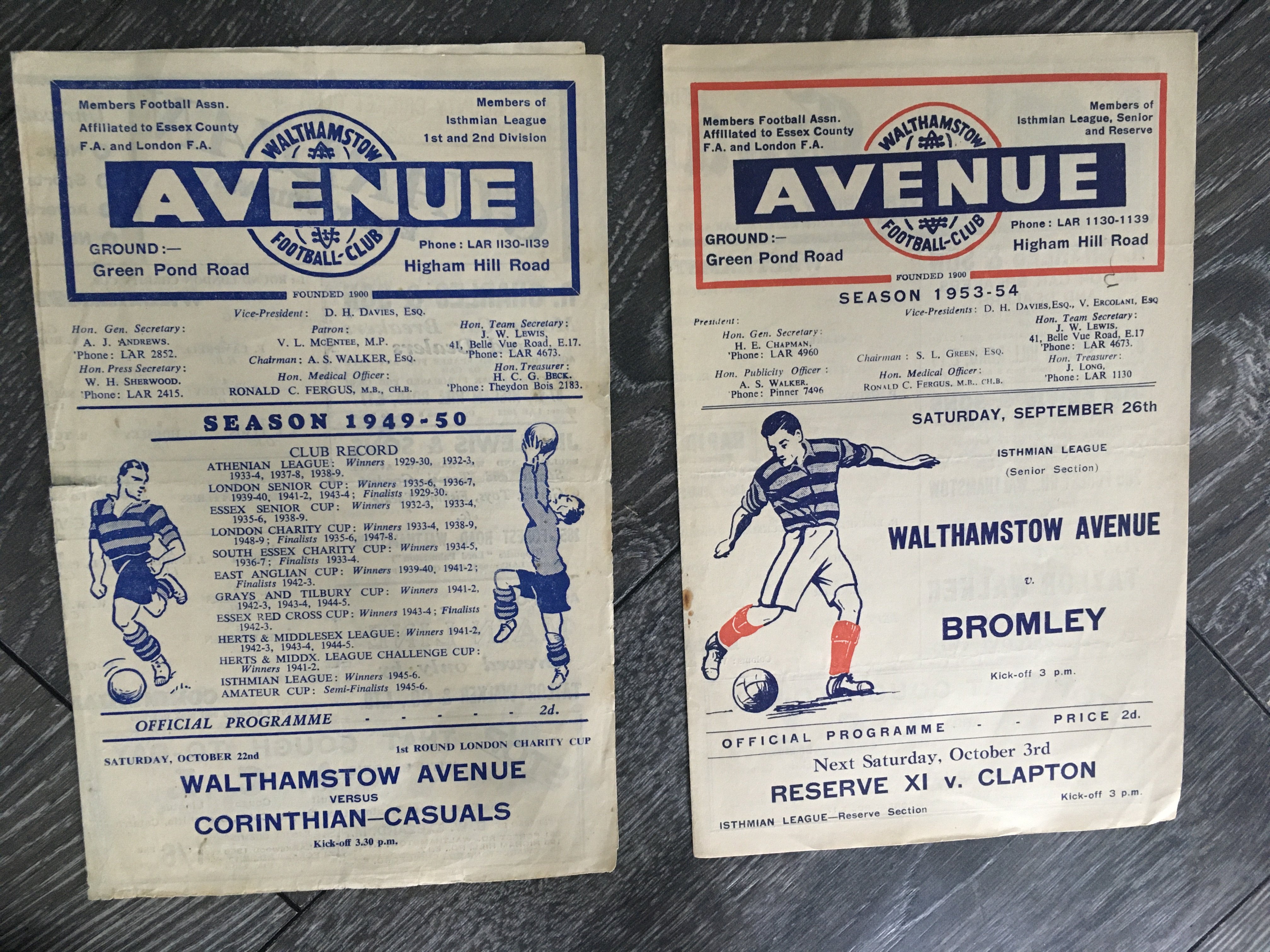 1940s Walthamstow Avenue Football Programmes: Former property of Walthamstow player and England International cricketer Doug Insole. 44/45 Walthamstow Schools v Edmonton Guildford and Bermondsey x 2. There are a couple of programmes from the same season where Doug was breaking into the mens team and another from 46/47 and 49/50. We have added 53/54 Bromley to this lot but not from Insole. Mixed conditions. (9)
