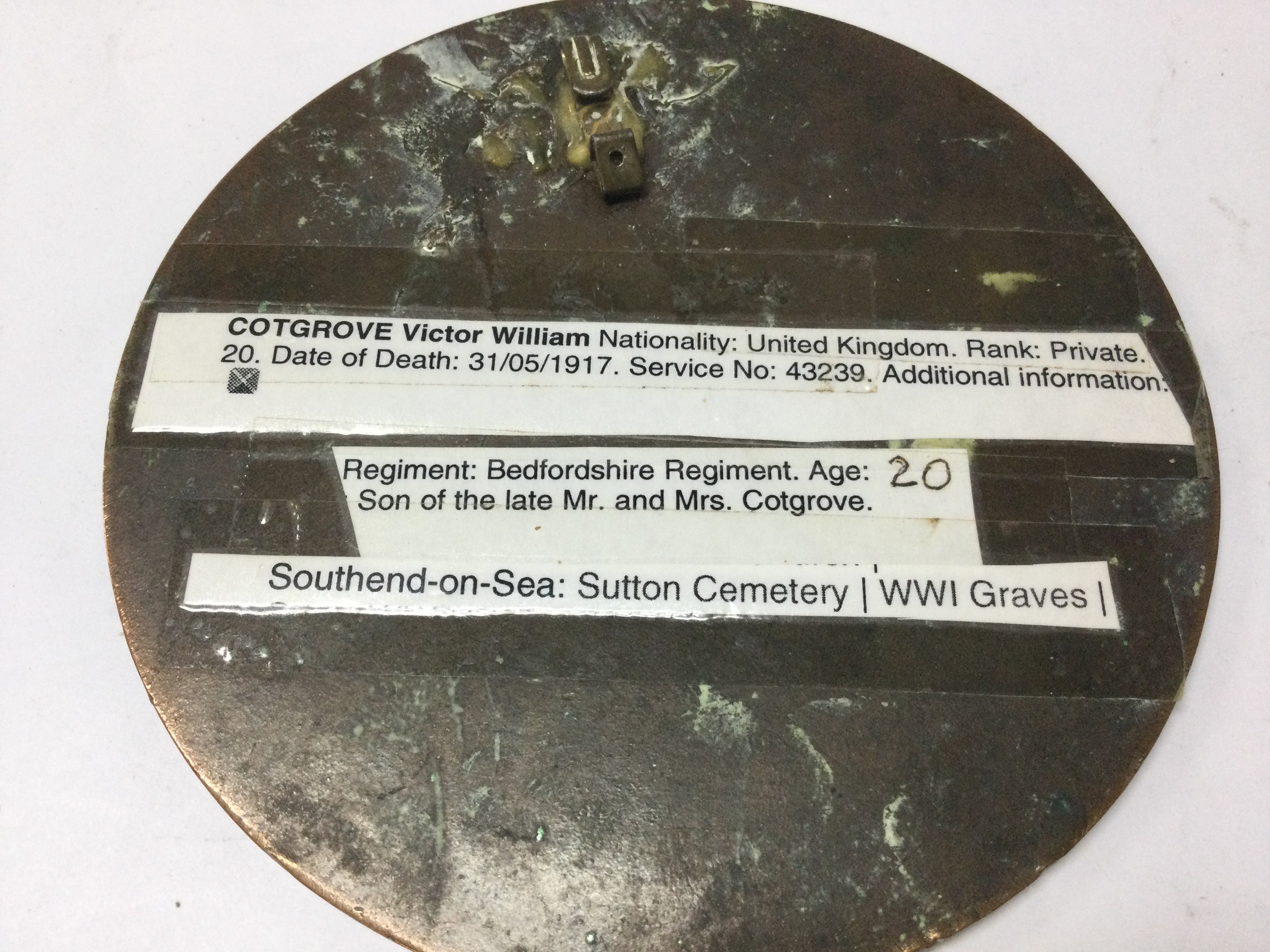 A death plaque , dedicated to Victor William Cotgrove. Rank : Private. Date of death : 31/05/1917. Service no : 43239. Bedfordshire regiment. Postage category A