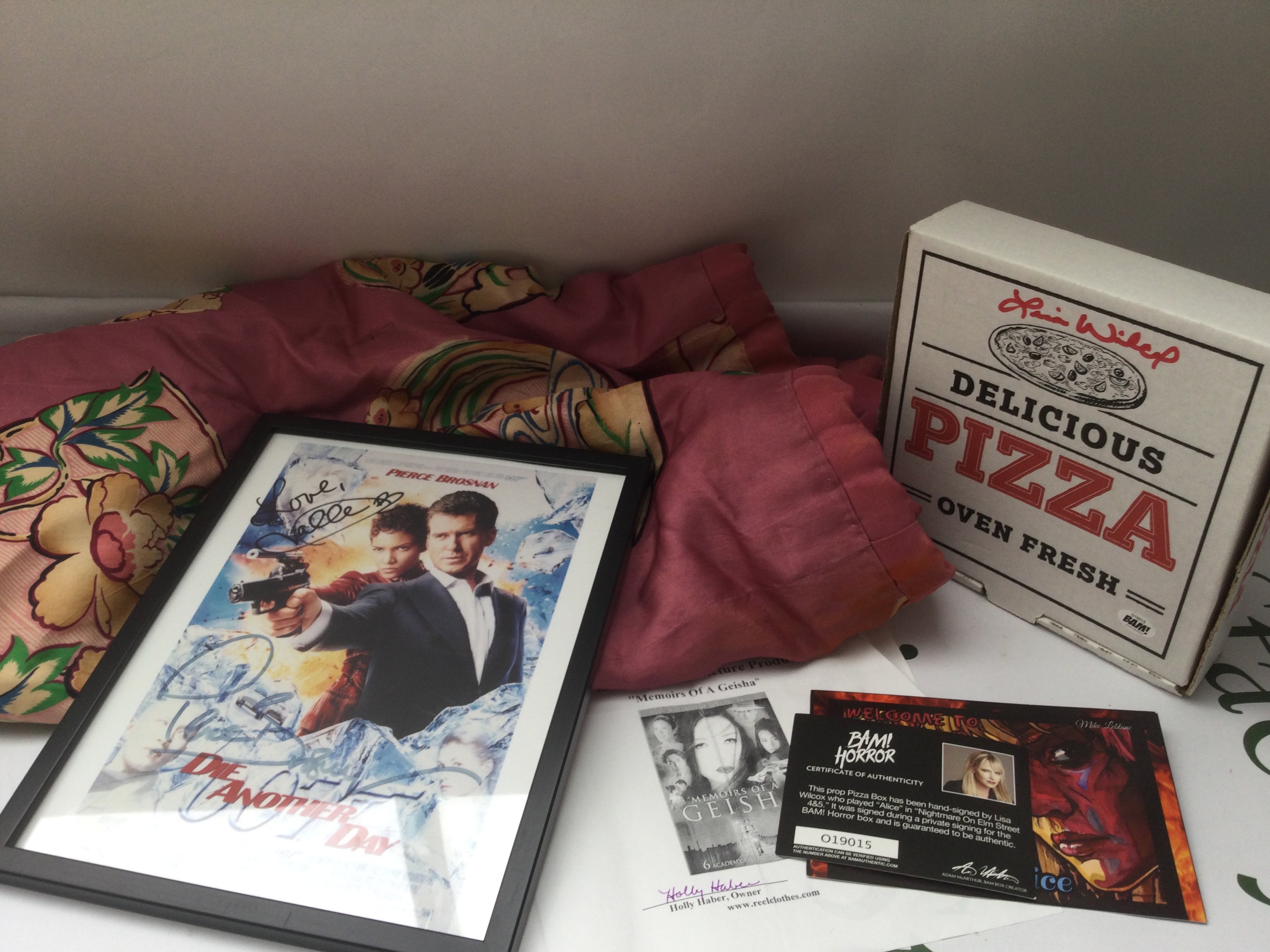 A 1992 Batman cowl by Rubies, a framed and glazed Die Another Day promotional card signed by Pierce Brosnan and Halle Berry, a custom made kimono for Memoirs of a Geisha (not screen used) and a pizza box prop from Nightmare on Elm Street signed by Lisa Wilcox.