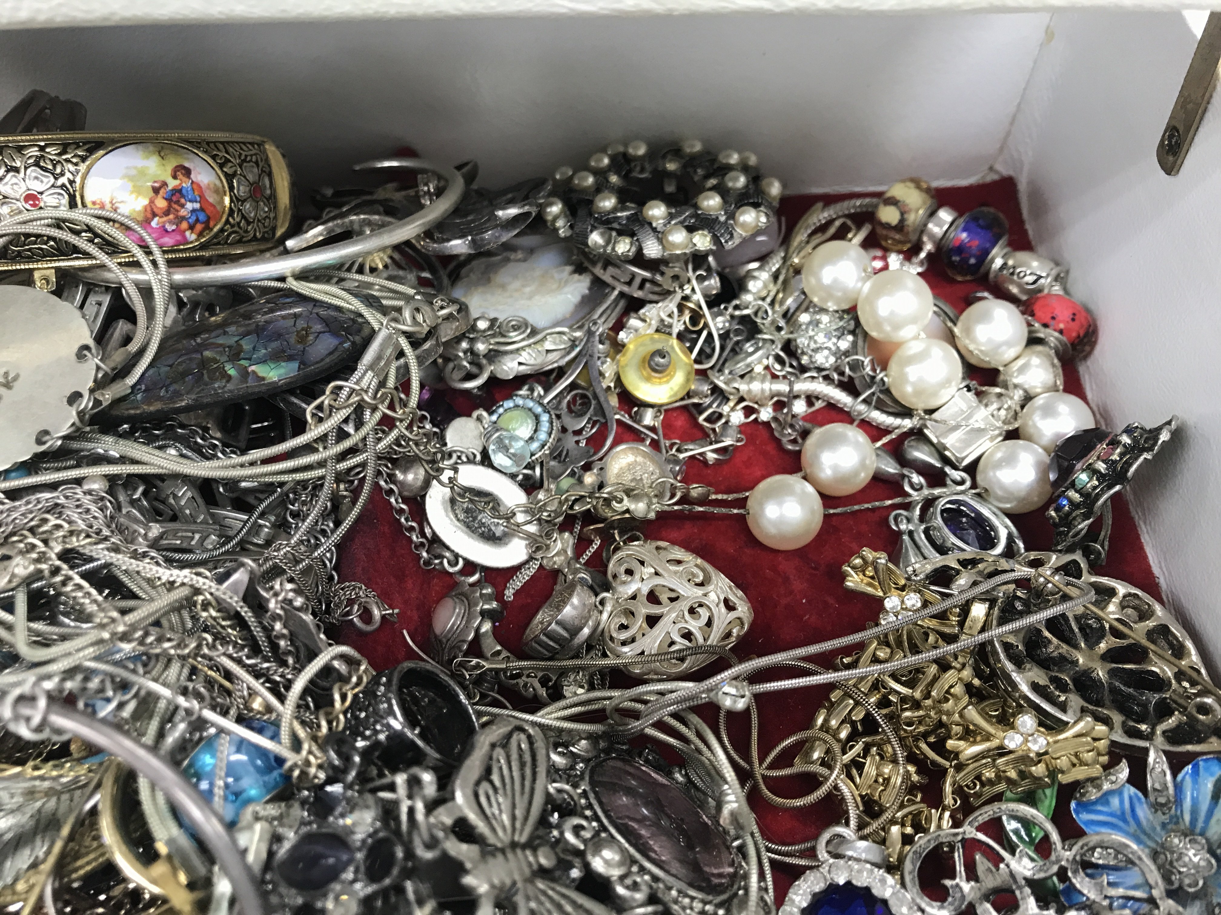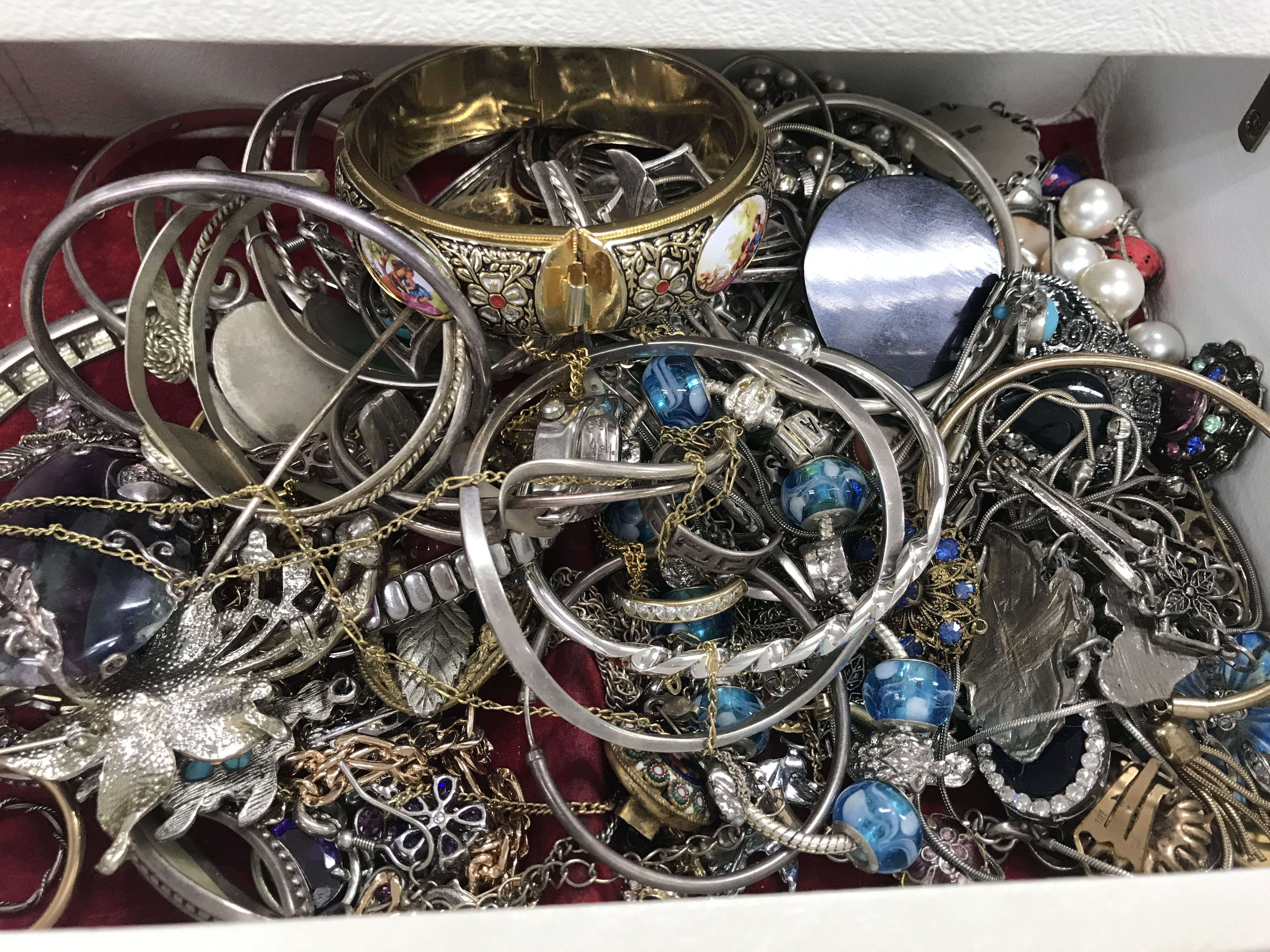 A jewellery box containing a mix of costume jewellery including silver and amethyst items. Postage B
