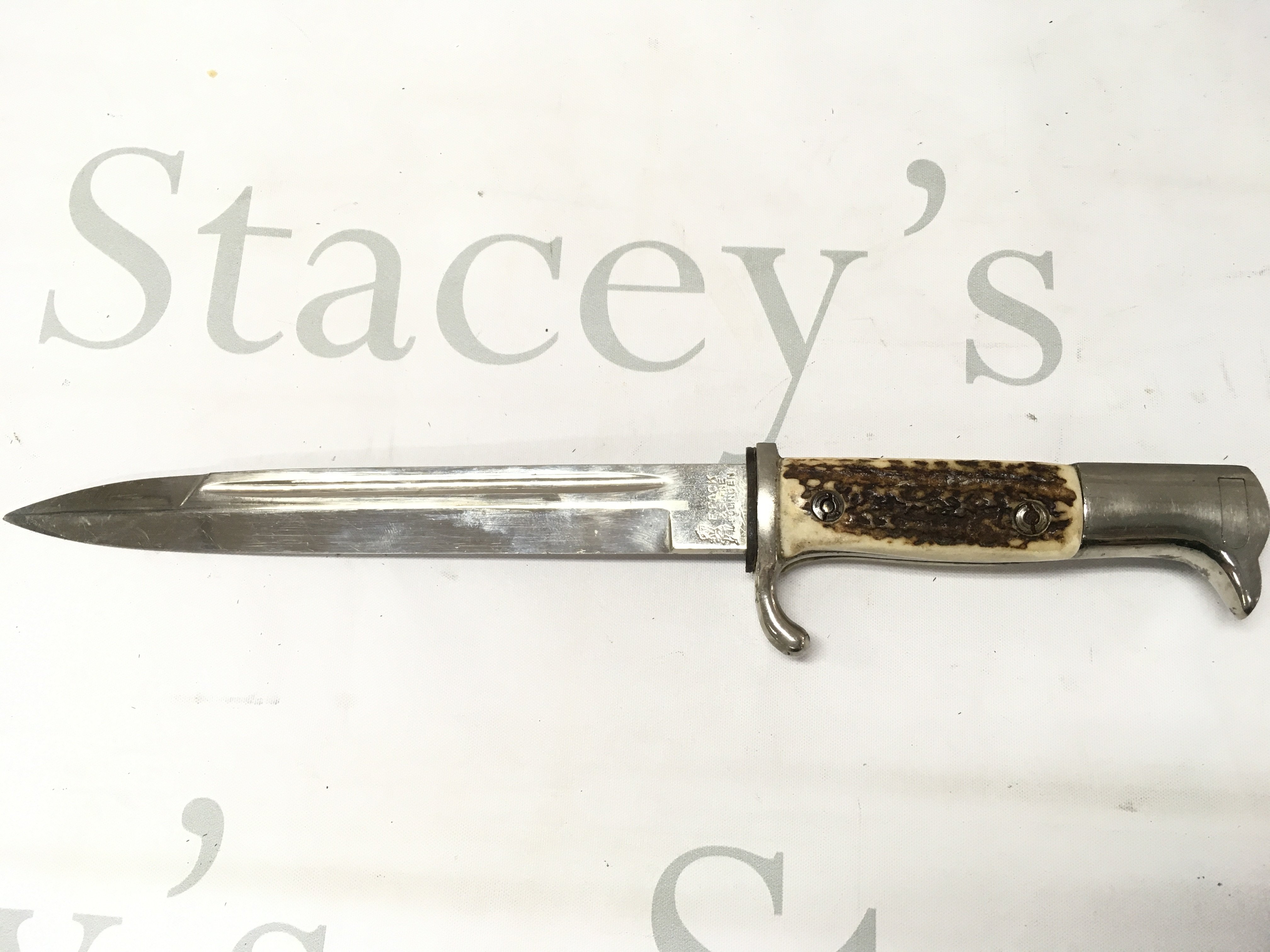 A WW2 Third Reich Dren Bayonet by E Pack & Sohne ,Solingen with stag horn grip and black leather frog . This lot cannot be posted