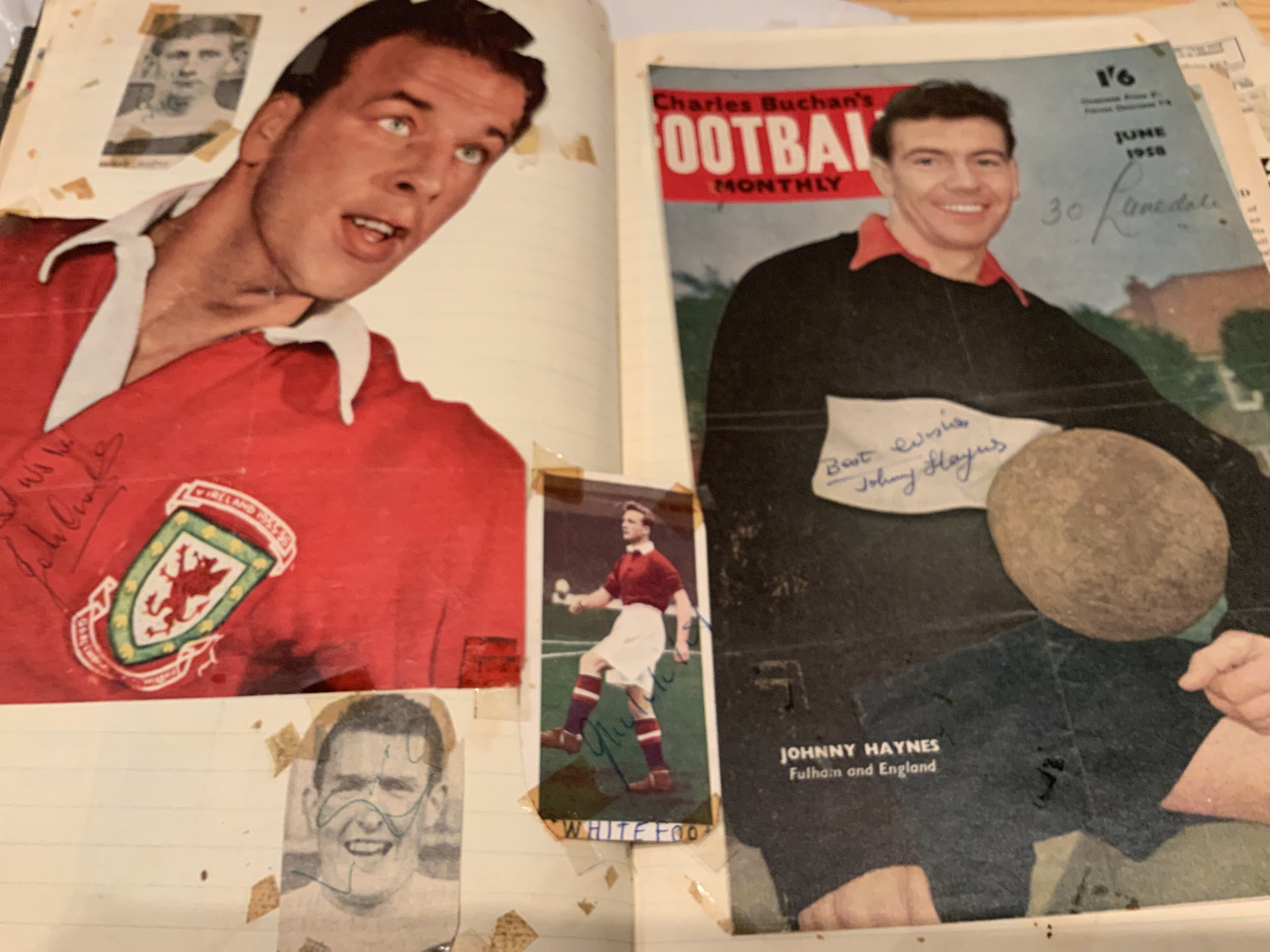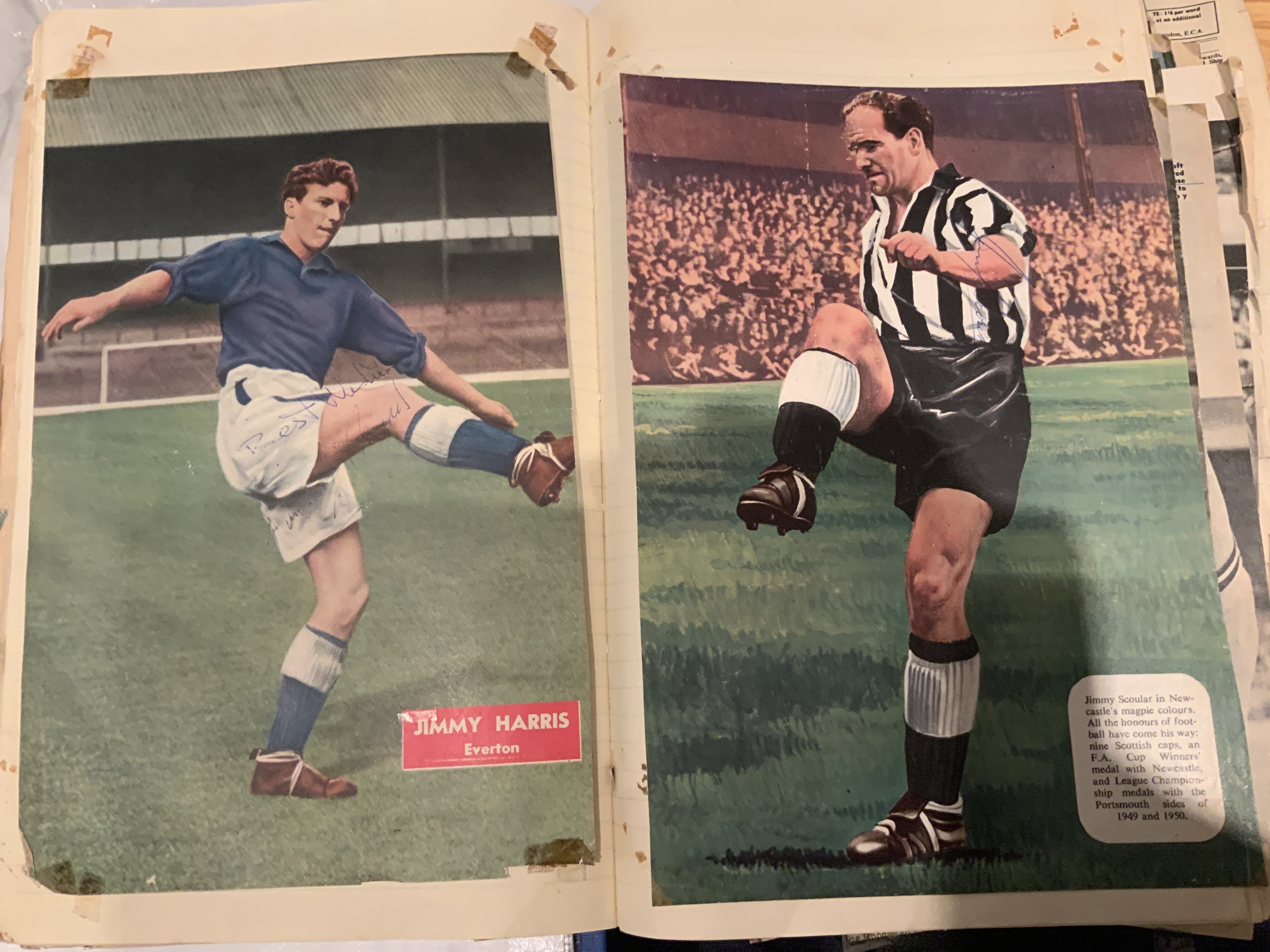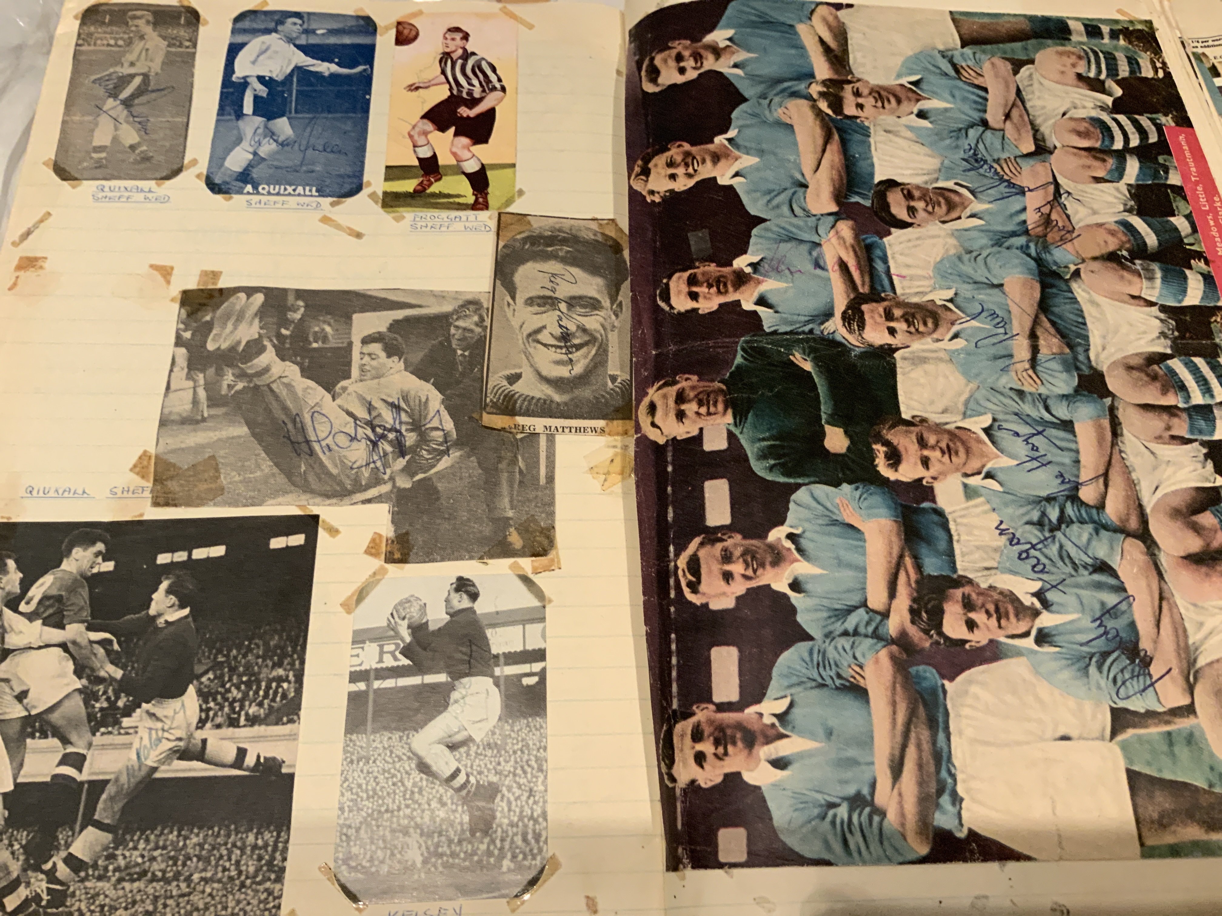 Signed Football Scrapbook: Quantity of hand signed undedicated autographs on various size magazine pictures. All have been stuck into scrapbook and have tape marks to corner and most have come loose so with a little trim you could lose the tape marks. The majority are late 50s and 60s with some great names to include an Everton 1960s team group signed by 15. Worth a look.