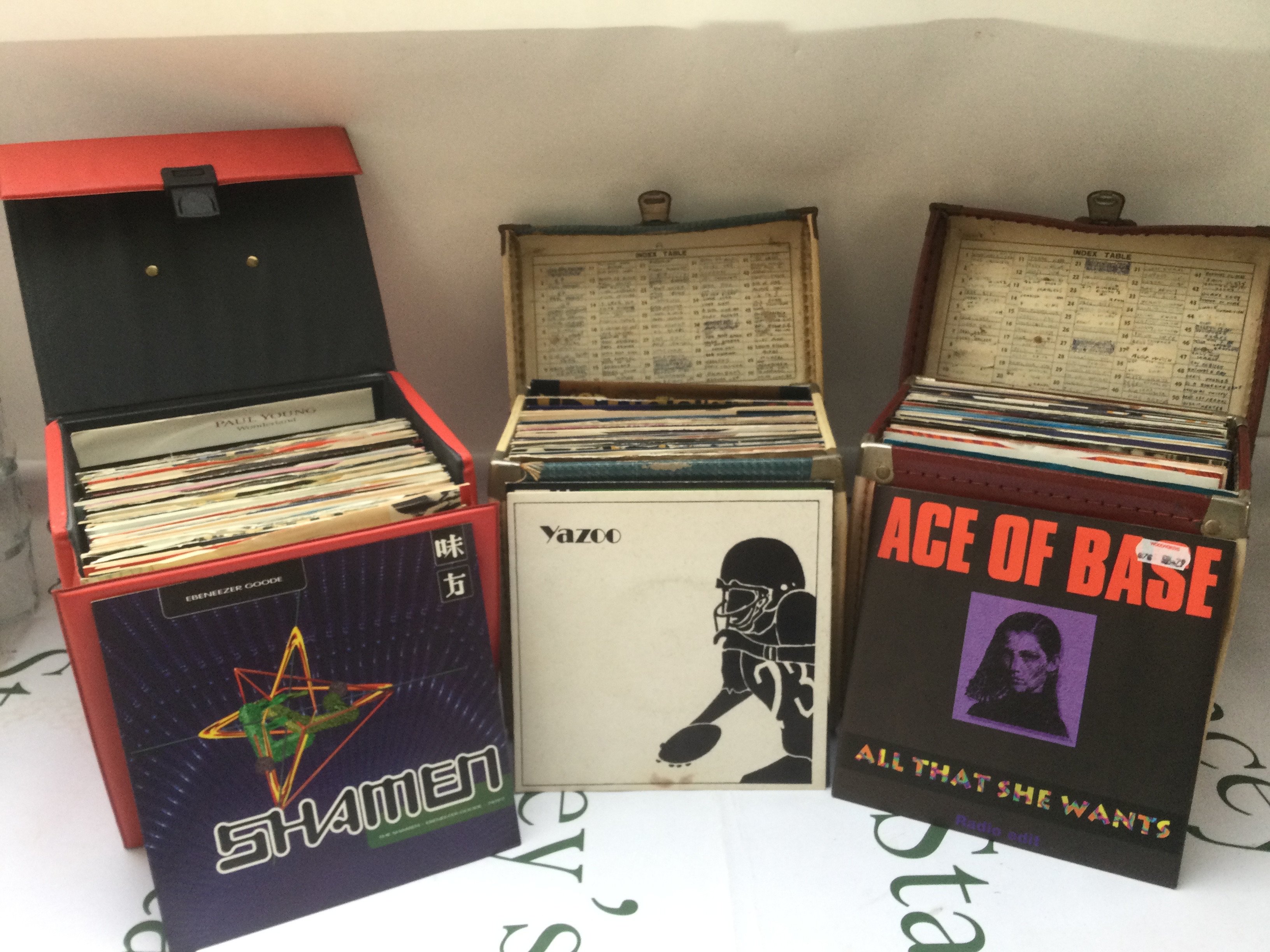 Three record cases of 7" singles comprising mainly 1980s and 90s artists.