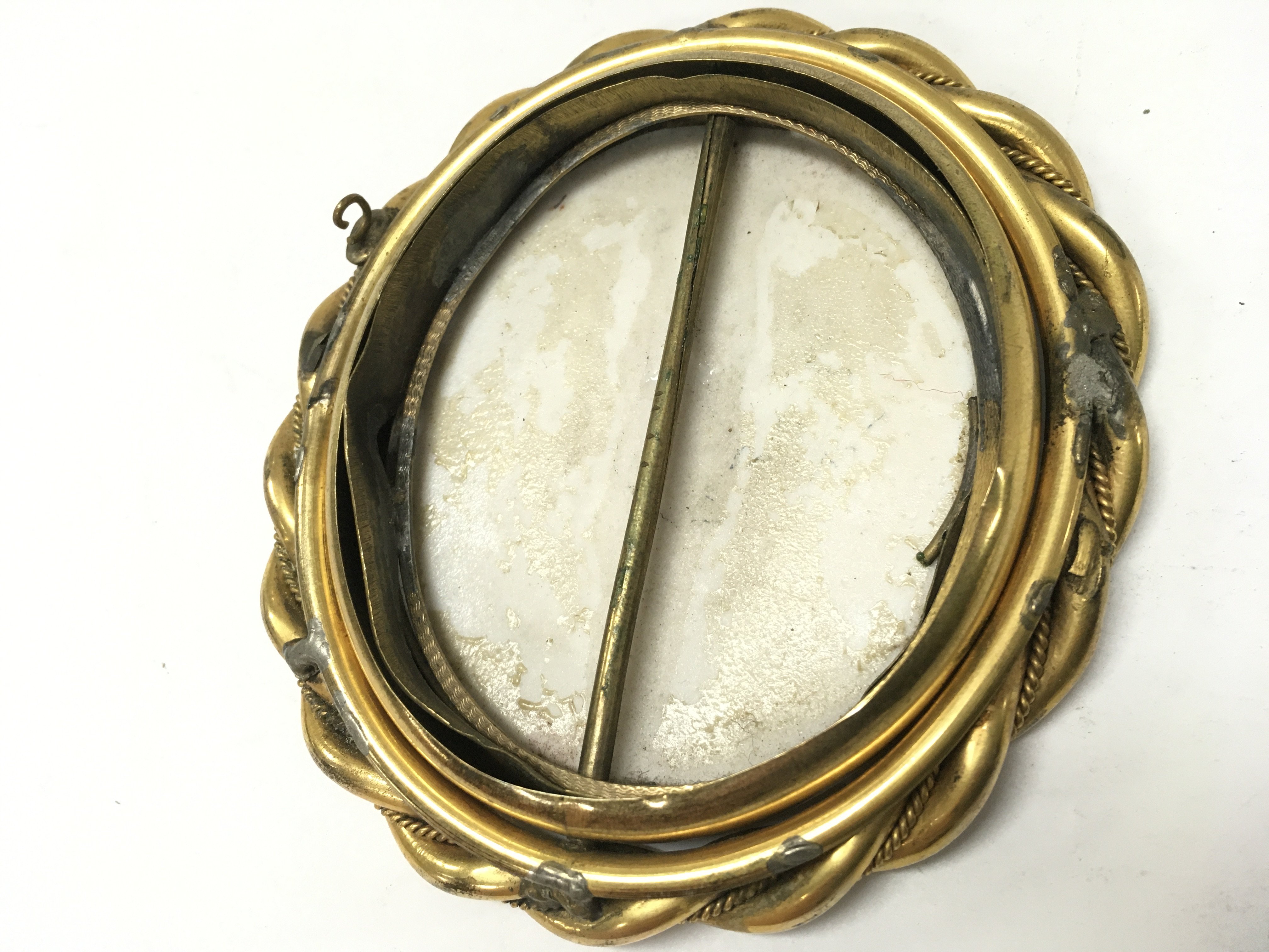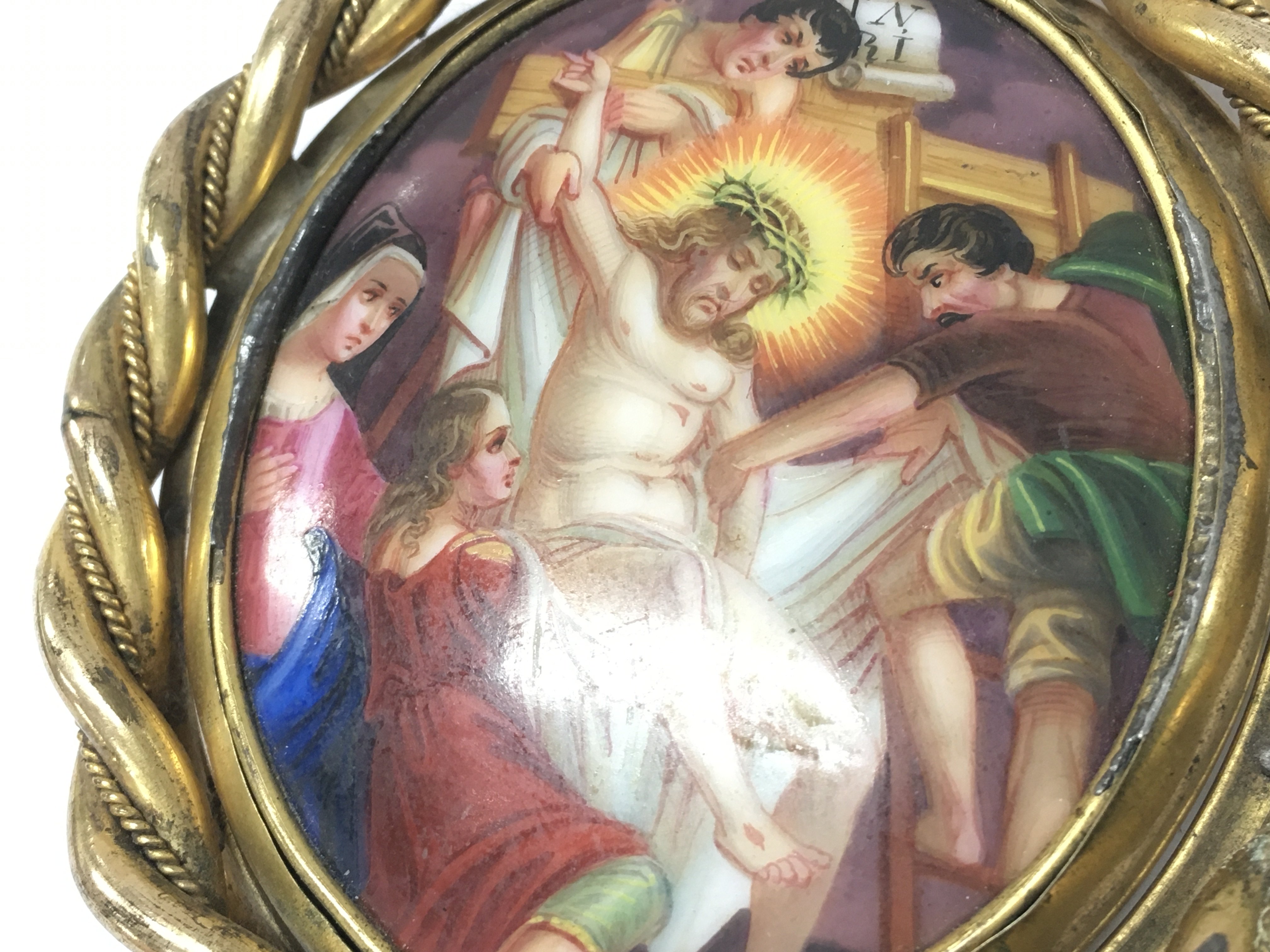 A porcelain hand painted Religious brooch depicting Jesus being taken down from the cross.