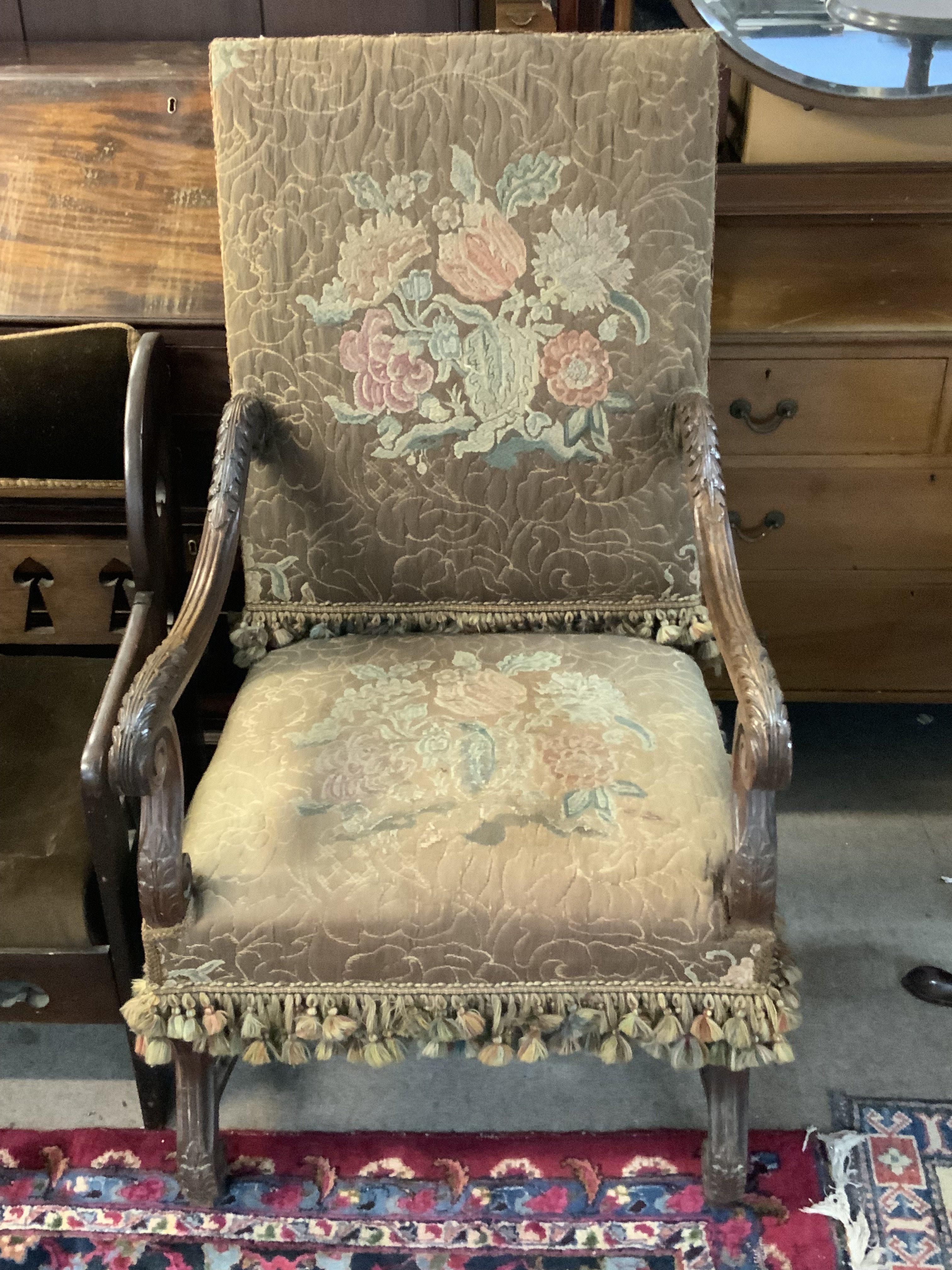 A French upholstered open armchair. 63cm x 116cm.