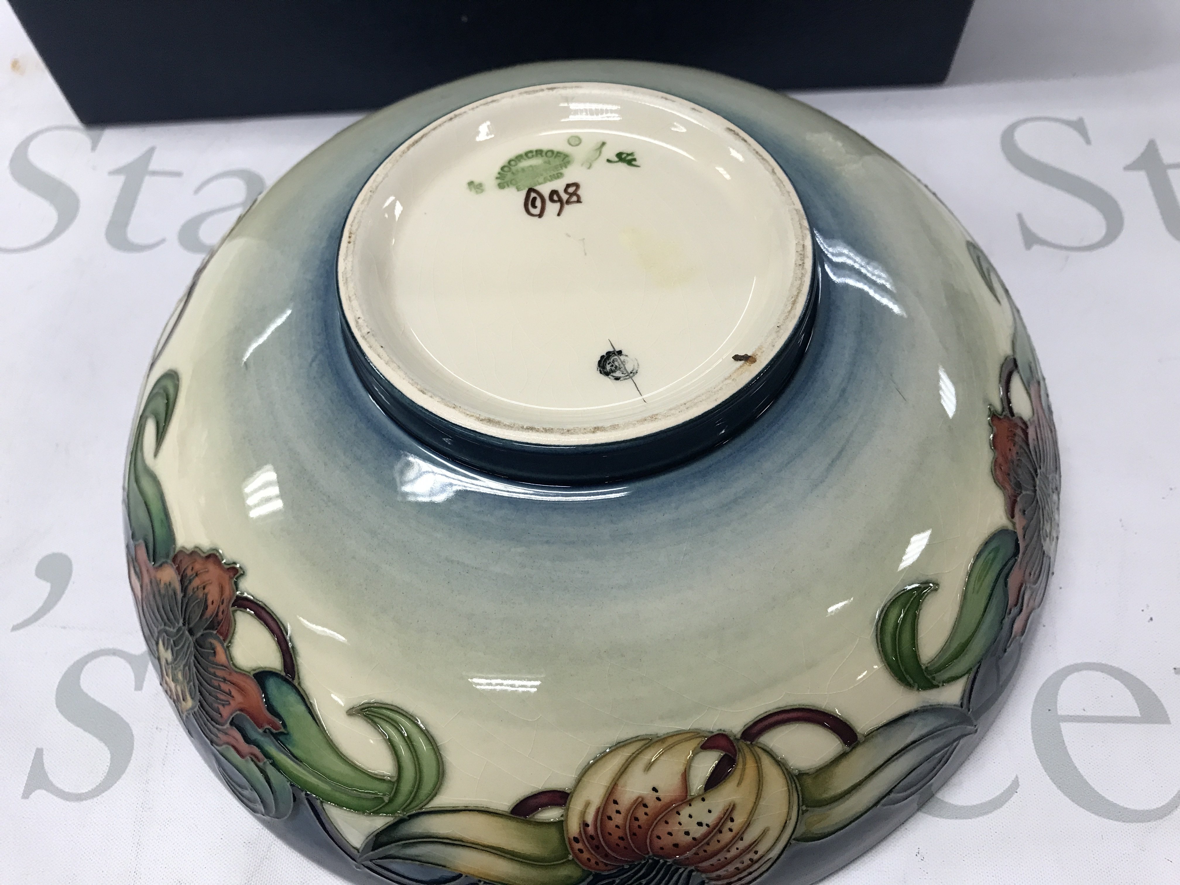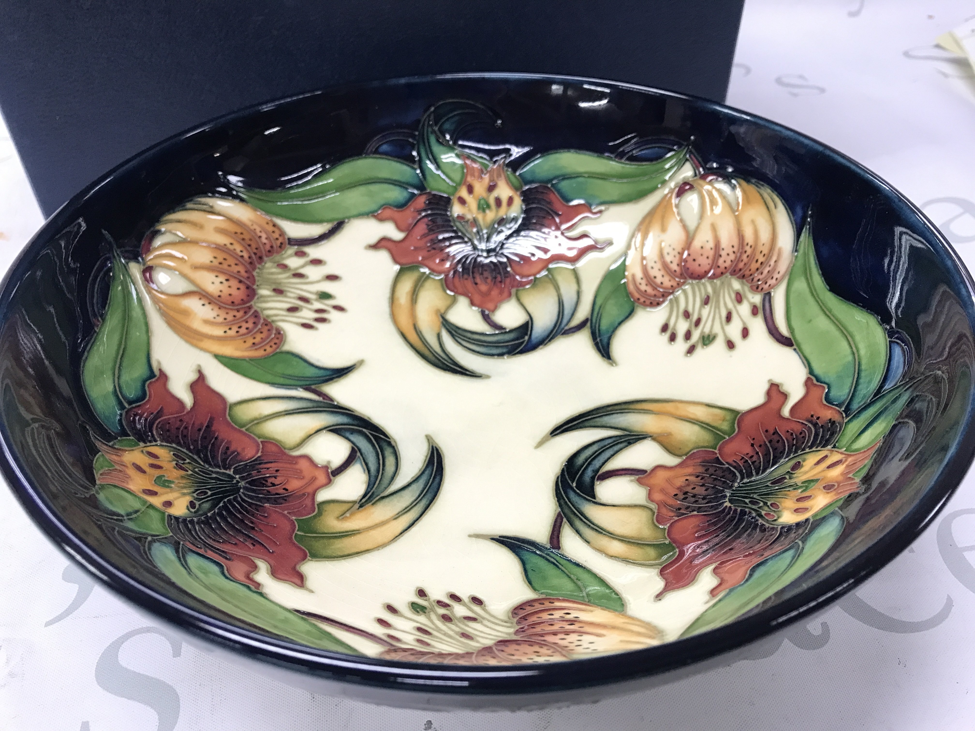 Moorcroft Anna Lily bowl, circa 1998 . No obvious damage or restoration. Crazing seen. 26cm wide 8.5cm tall. This lot cannot be posted