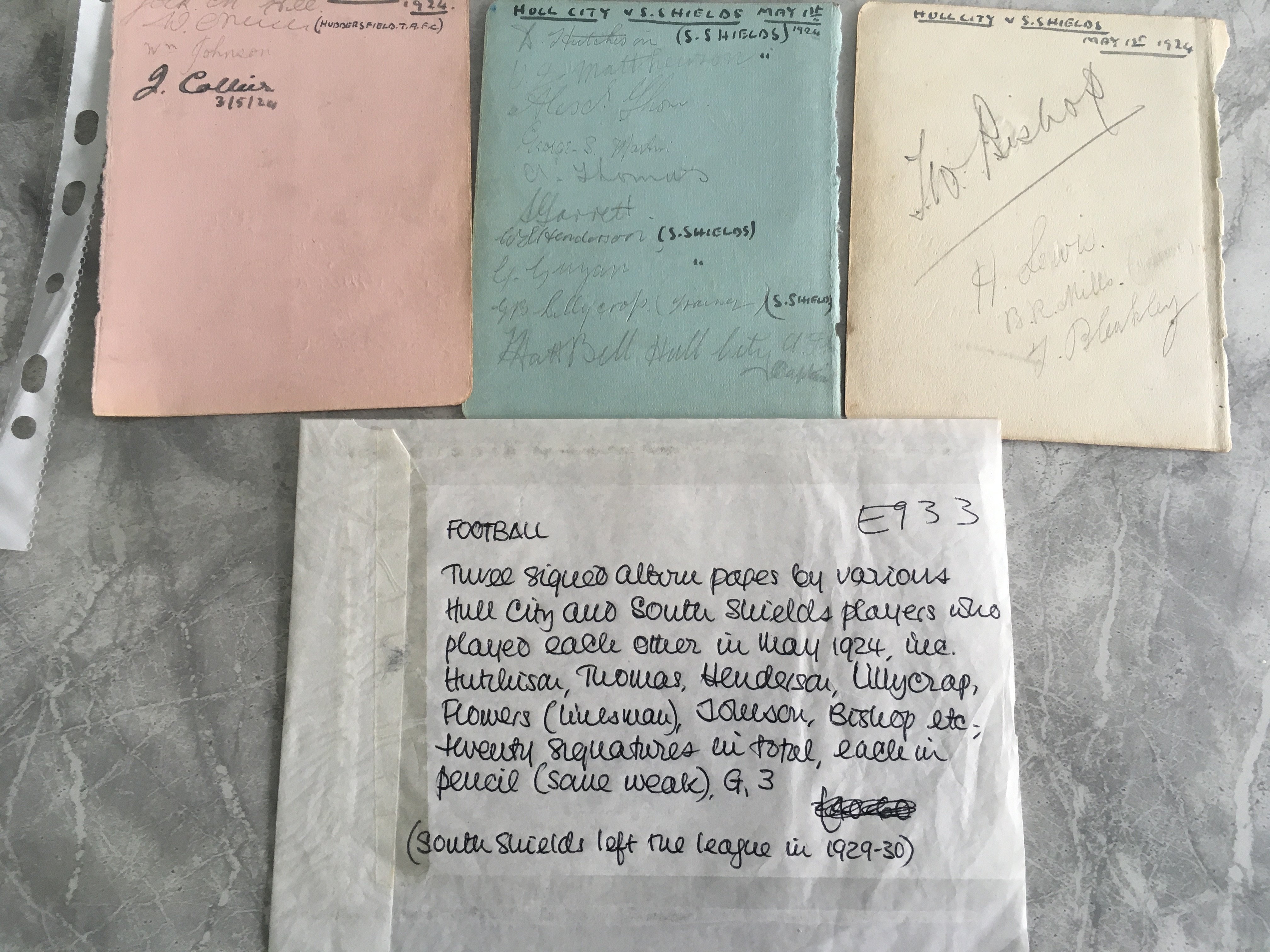 Hull City Football Autographs: 10 autographs from 47/48 stuck down to autograph page. C/W on 3 pages removed from autograph book 18 autographs in light pencil on a page headed 1924 Hull v South Shields. Autographs we checked were South Shields players.