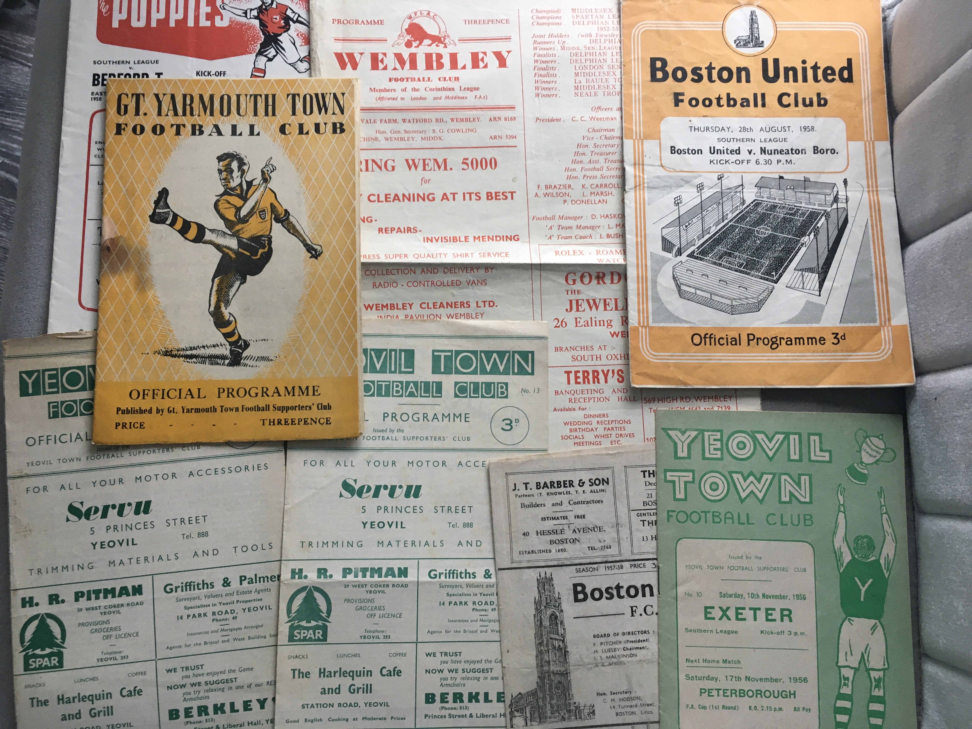 1950s Non League Football Programmes: Mid to late 50s to include 5 x Grantham some with writing to cover, 1 each of Boston, Kettering, Yeovil, Gt Yarmouth, Corinthians, Maidenhead, Wealdstone, Ilford plus 51/52 Kidderminster v Yeovil and more.