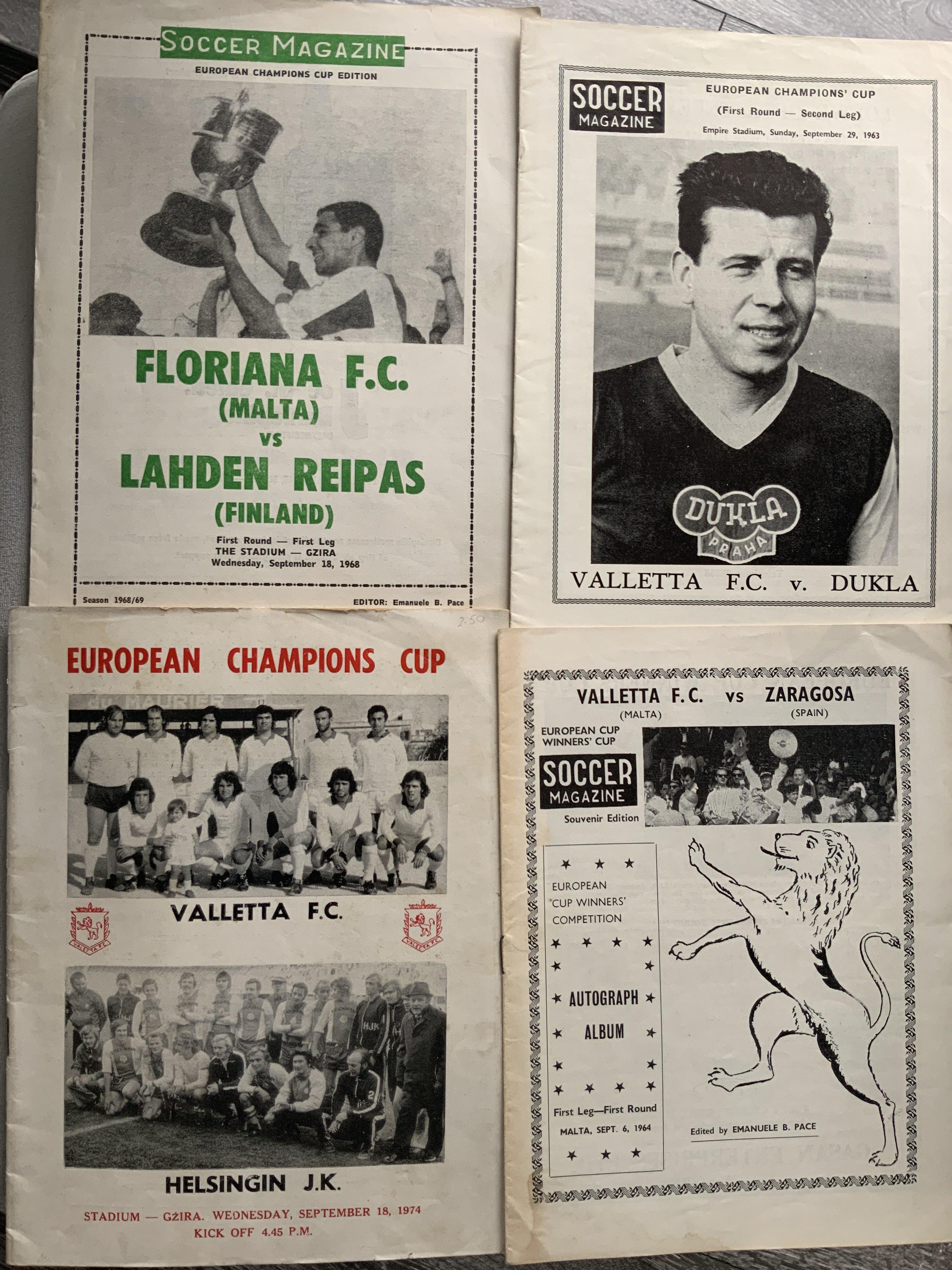 Maltese Clubs European Home Football Programmes: Floriana v 62/63 Ipswich, 67/68 Breda, 68/69 Reipas Lahden, Sliema v 68/69 Randers Freja, Hibernians v 68/69 Aris Salonika, Valletta v 63/64 Dukla, 64/65 Zaragoza, 74/75 Helsingin. Good. (8)