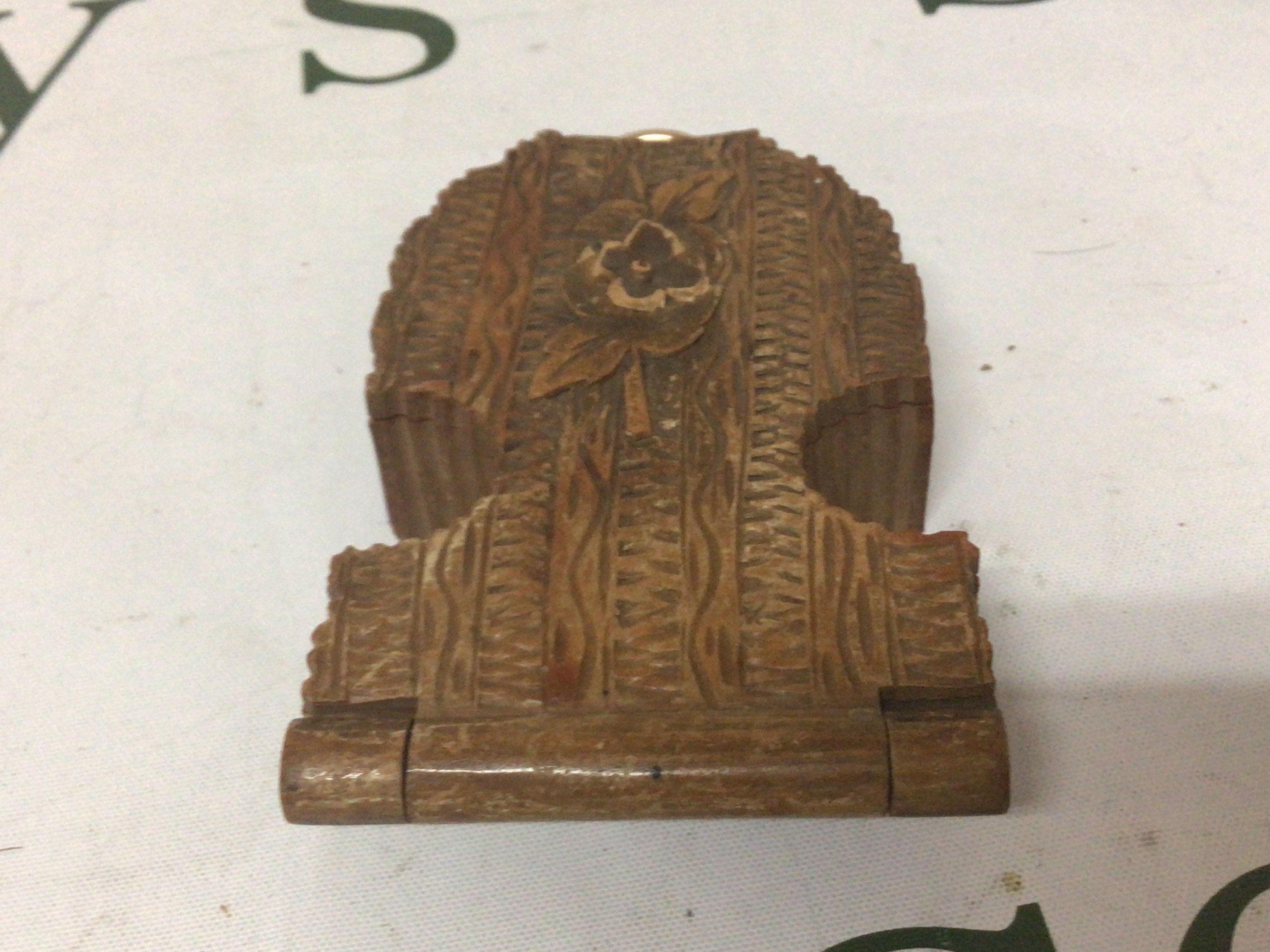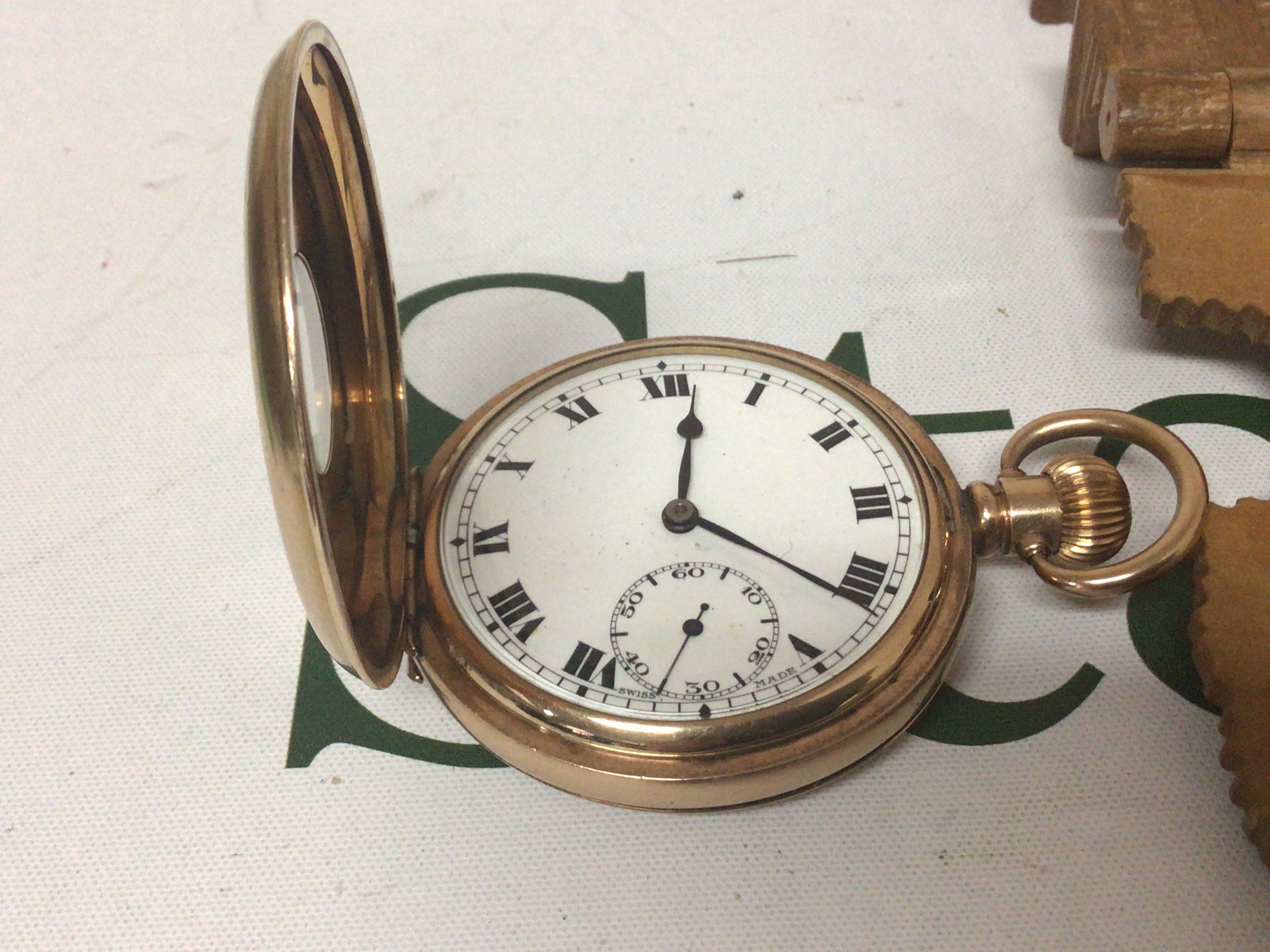 A gold plated half hunter pocket watch button wind seen working.in a carved wood Swiss watch case