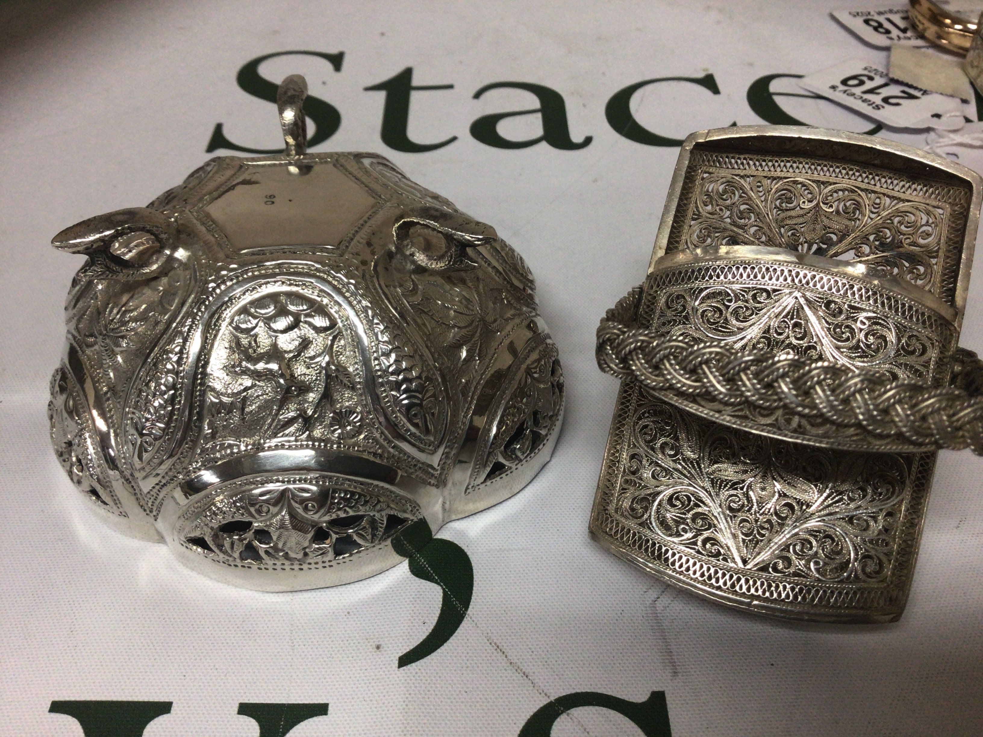 A white metal bowl stamped 90 possible Indian with Repousse decoration panels of animals and foliage. and a filigree case (2)