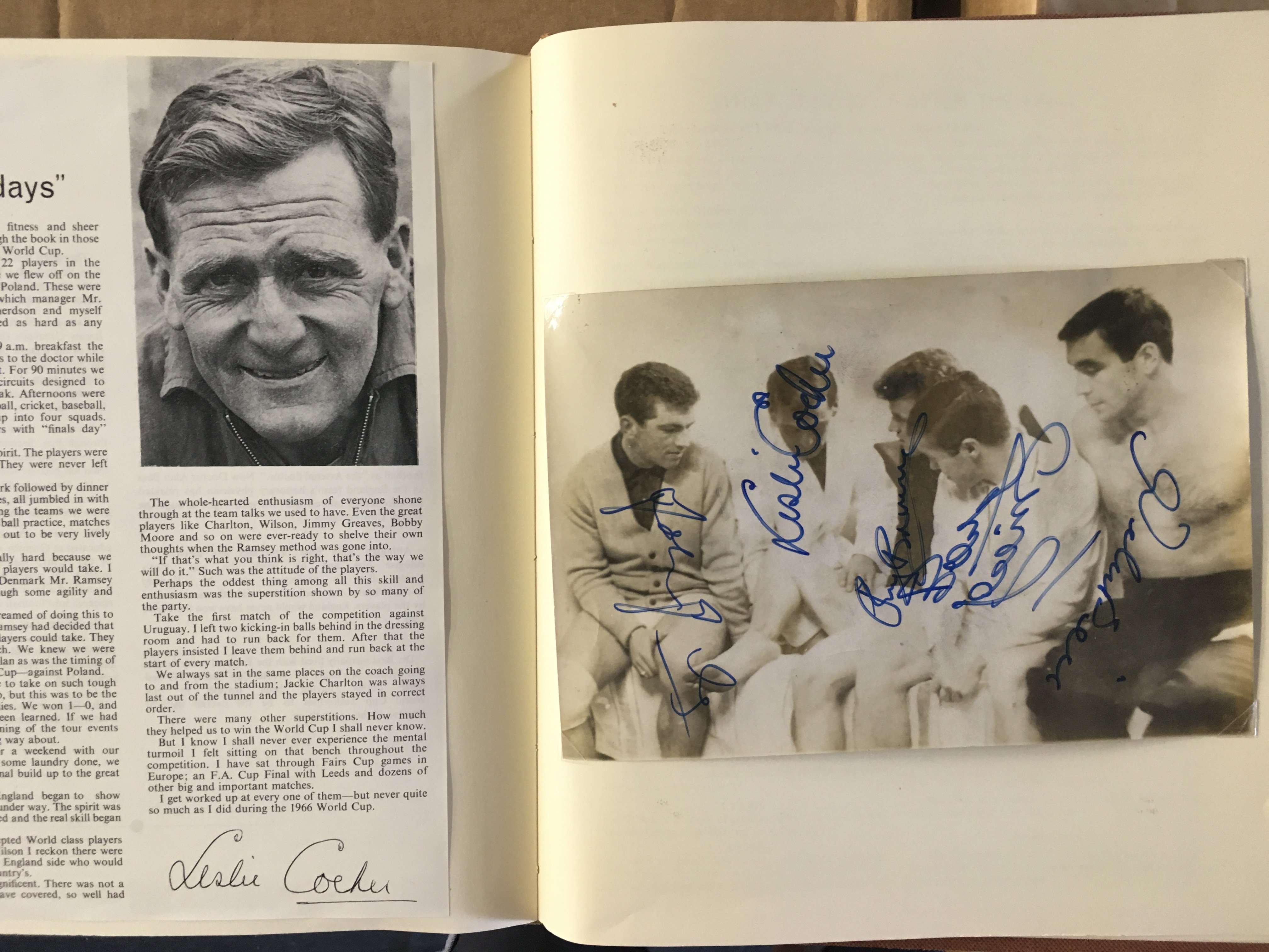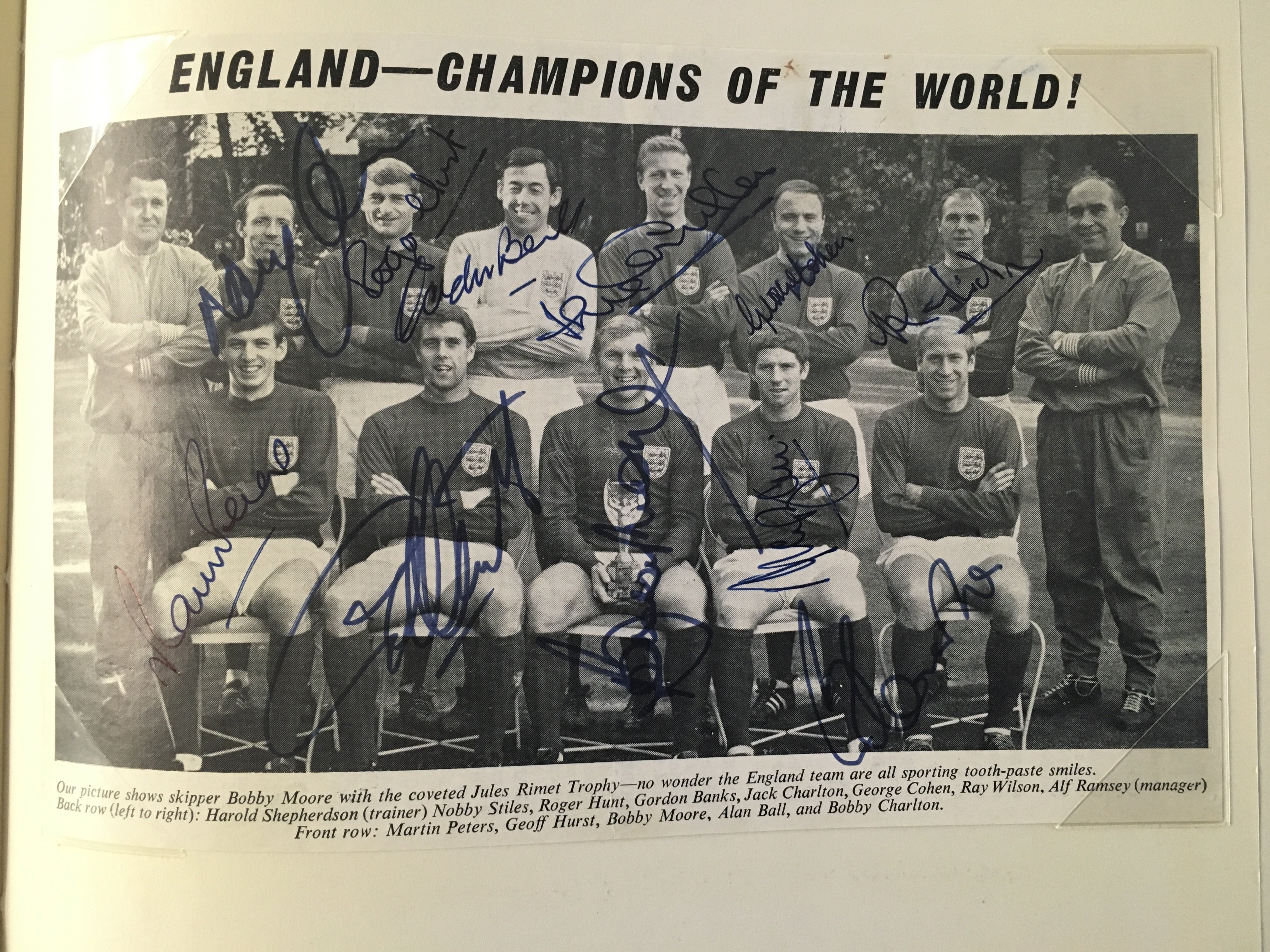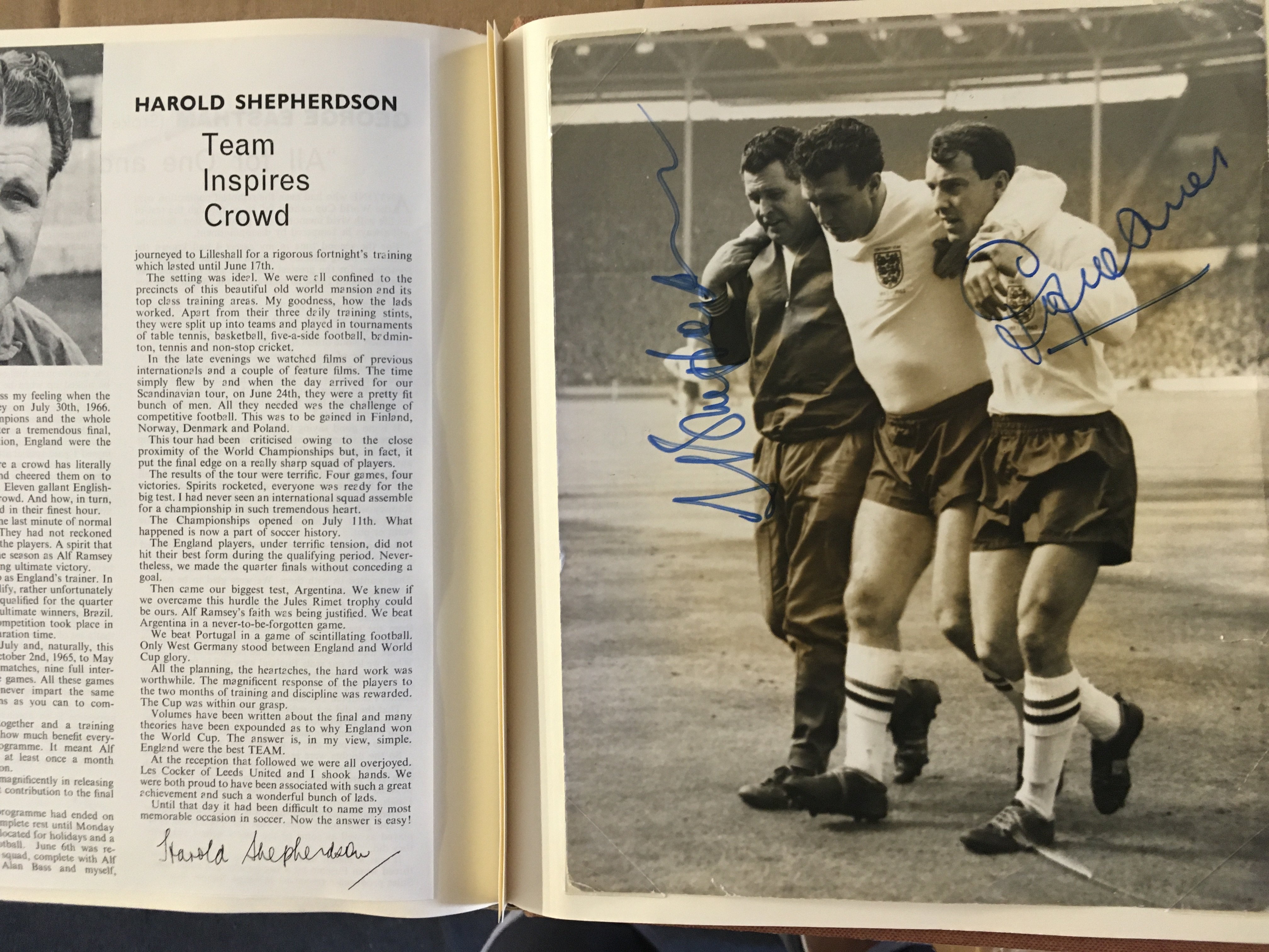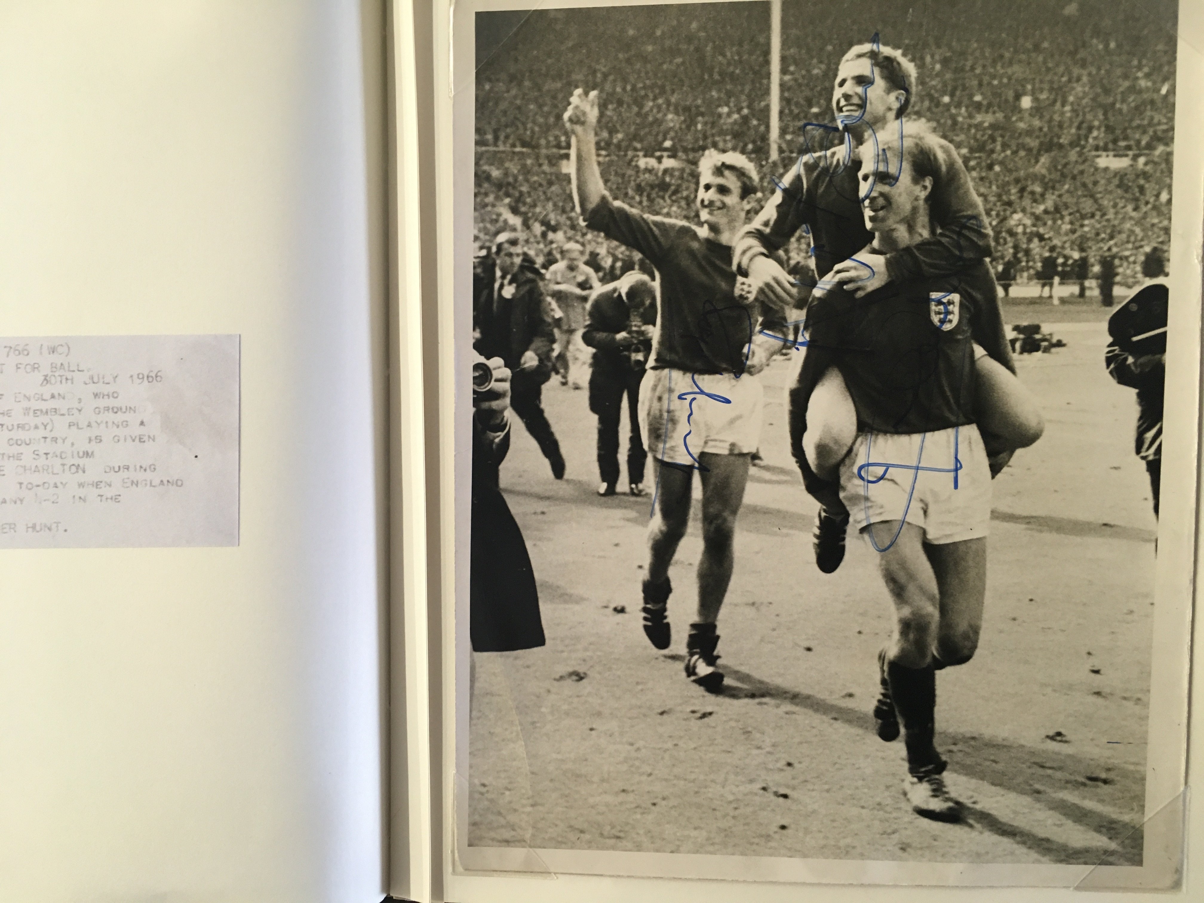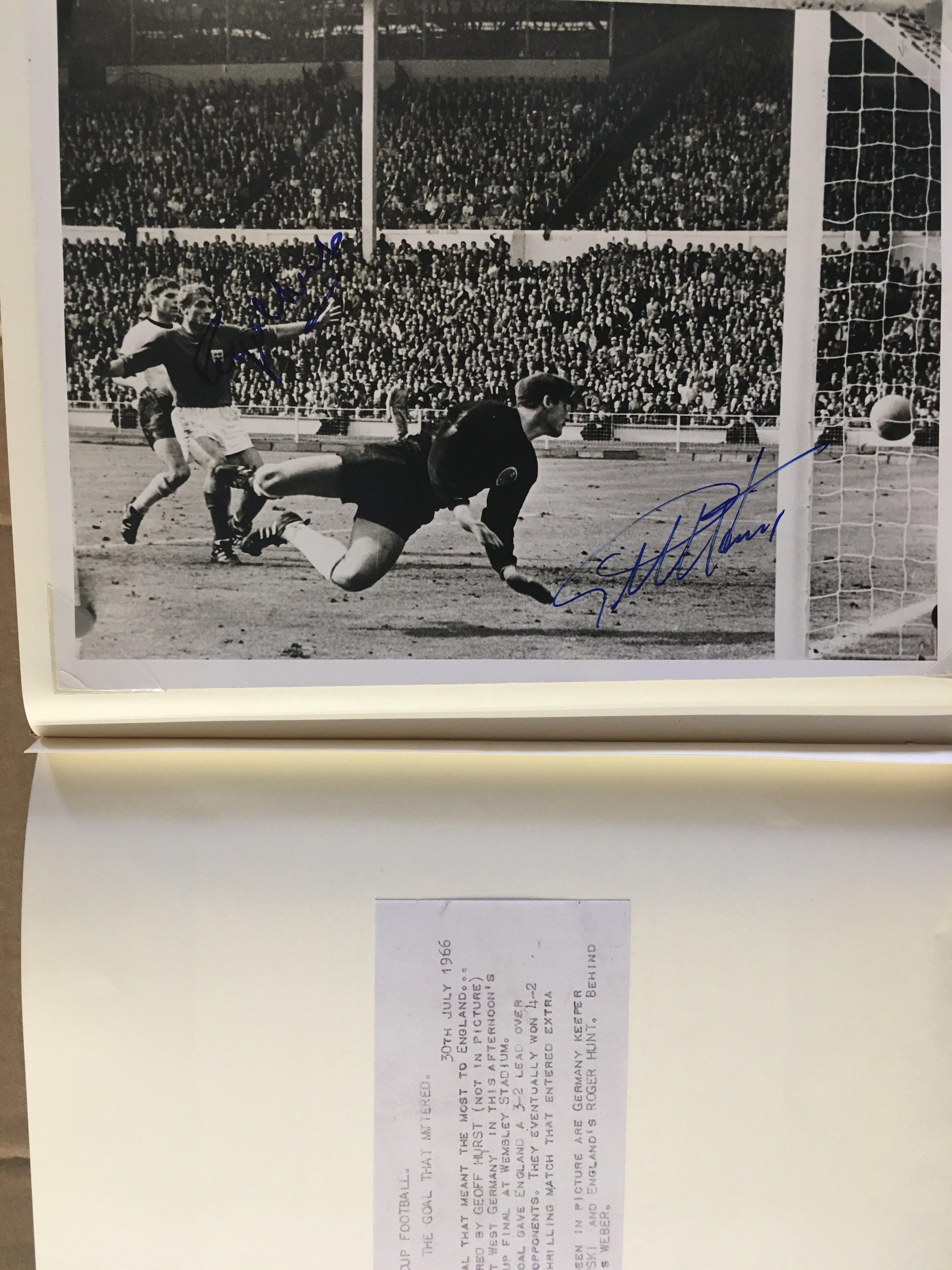 England 1966 World Cup Incredible Football Collection: When you open this original World Cup Willie folder you turn each page and find a stunning press photo from the ceremony and then from each match England played in. The annotations to rear of the clipped in photos have been copied and are on opposite page for reference and some are signed. The final has a photo of all the goals ( some signed ) and a very rare original team sheet. There are celebration photos also ( some signed ). There is a signed press photo of all the 22 players after that plus Ramsey Shepherdson and Cocker ( some in club kit ). This must view lot is finished off with a large magazine picture signed by all 11 winning players. There are a total of 45 original press photos with press stamps etc to rear.