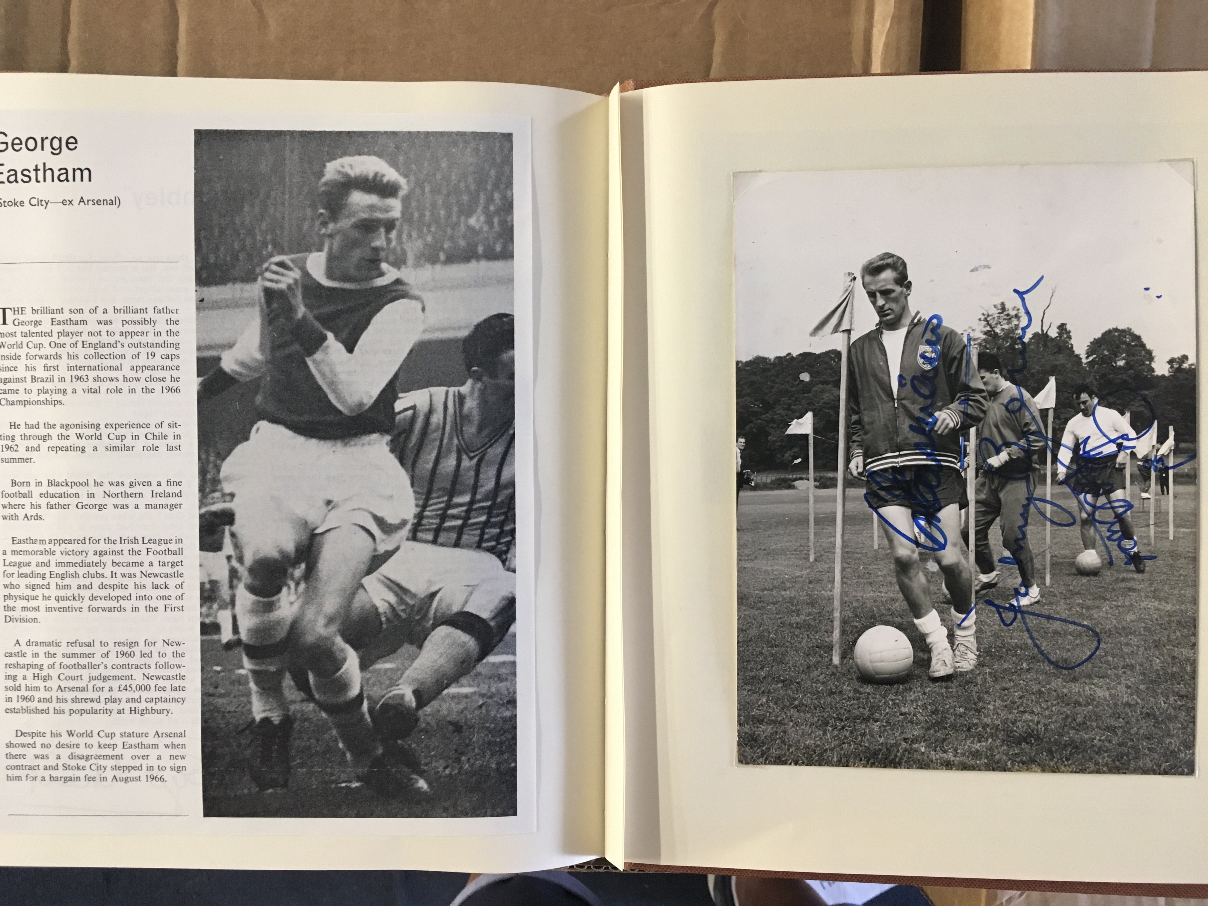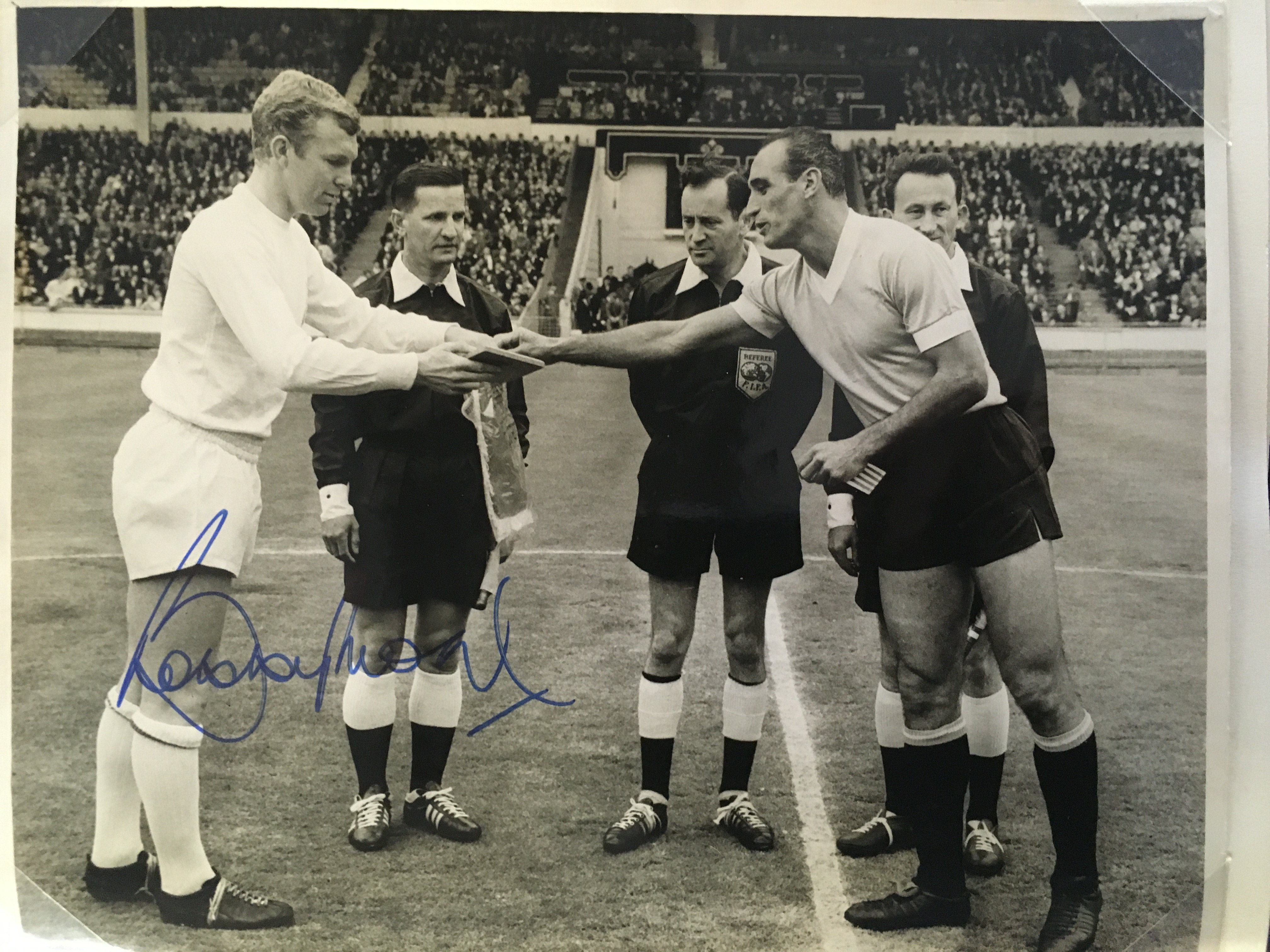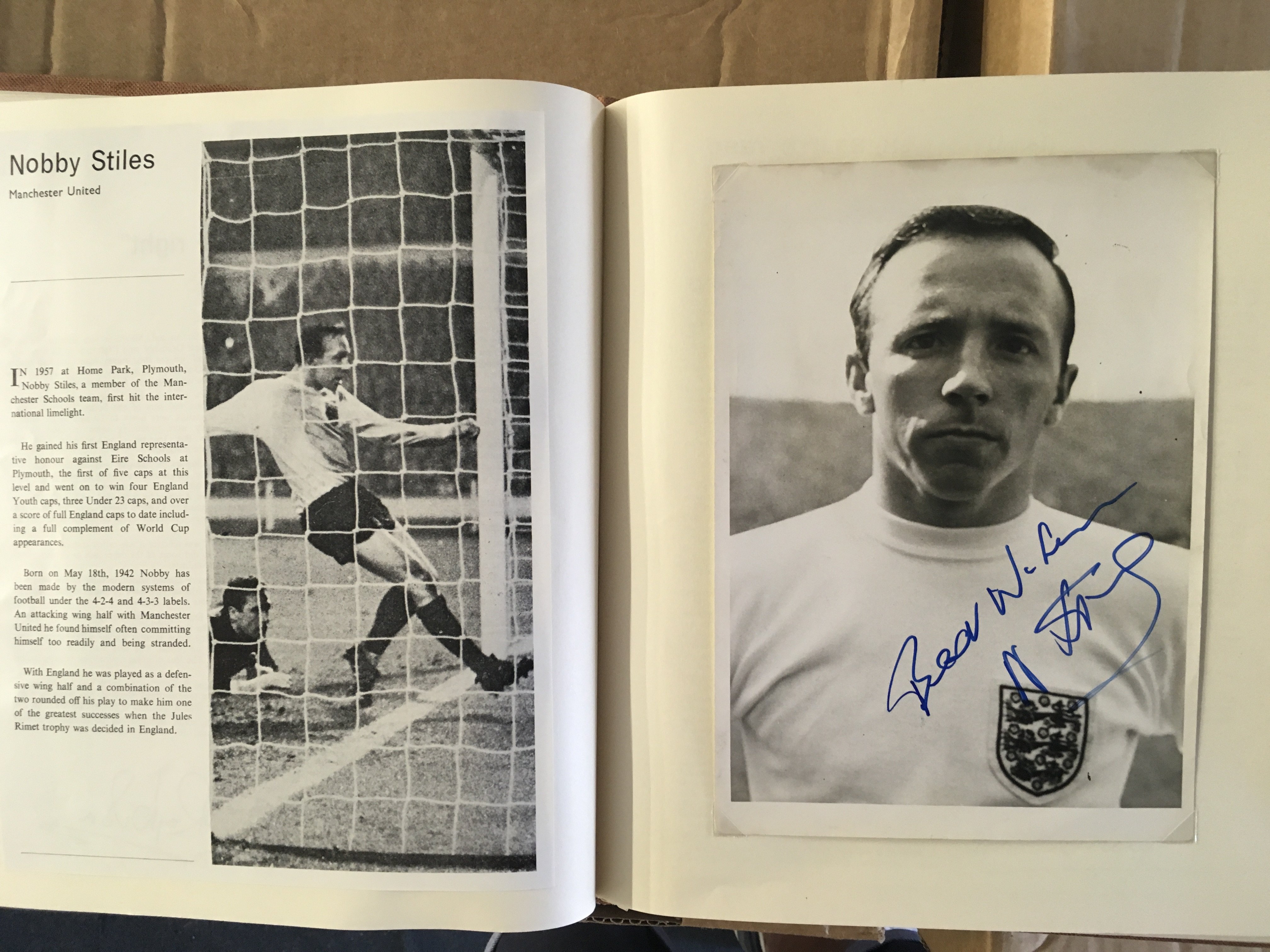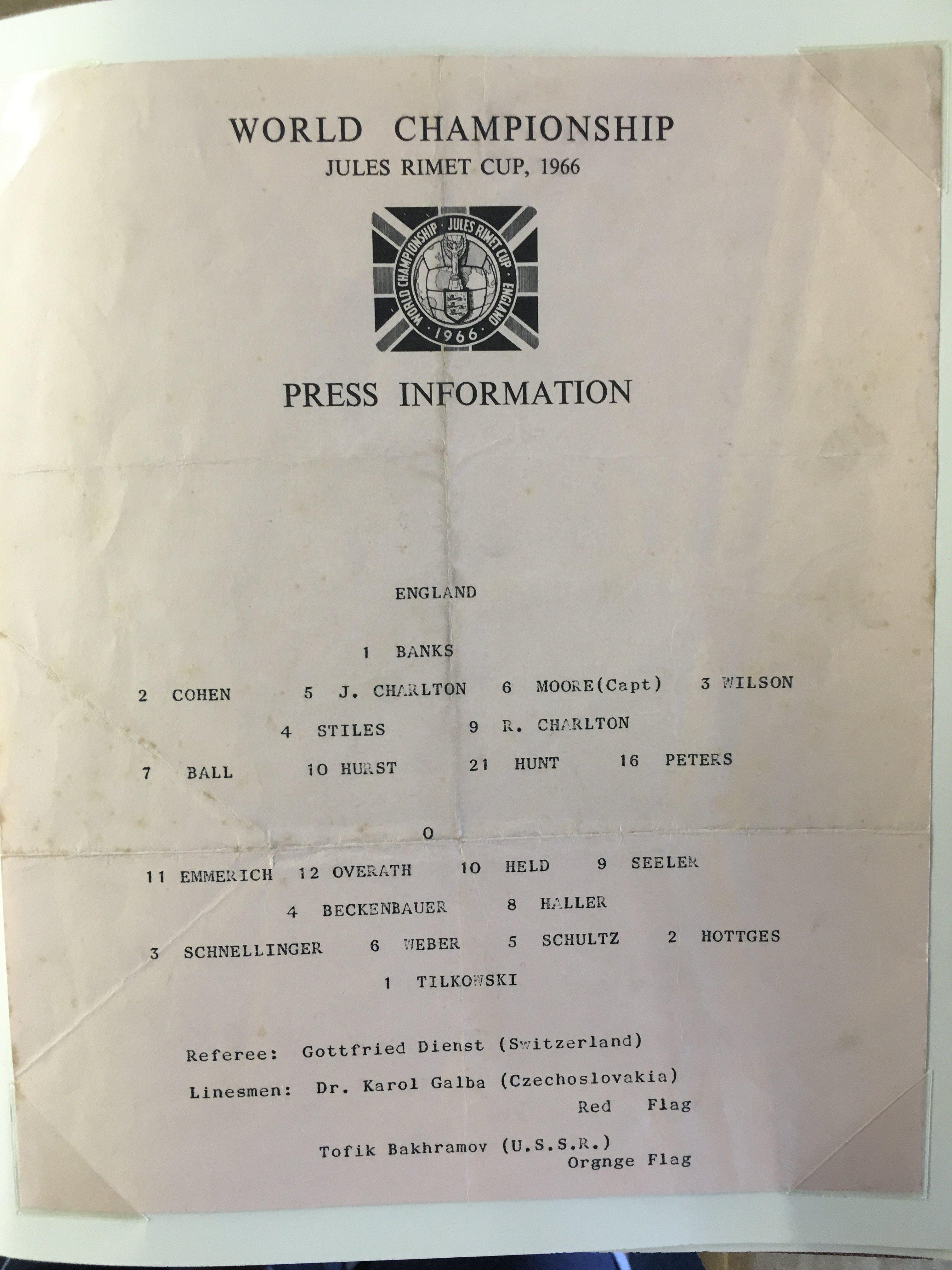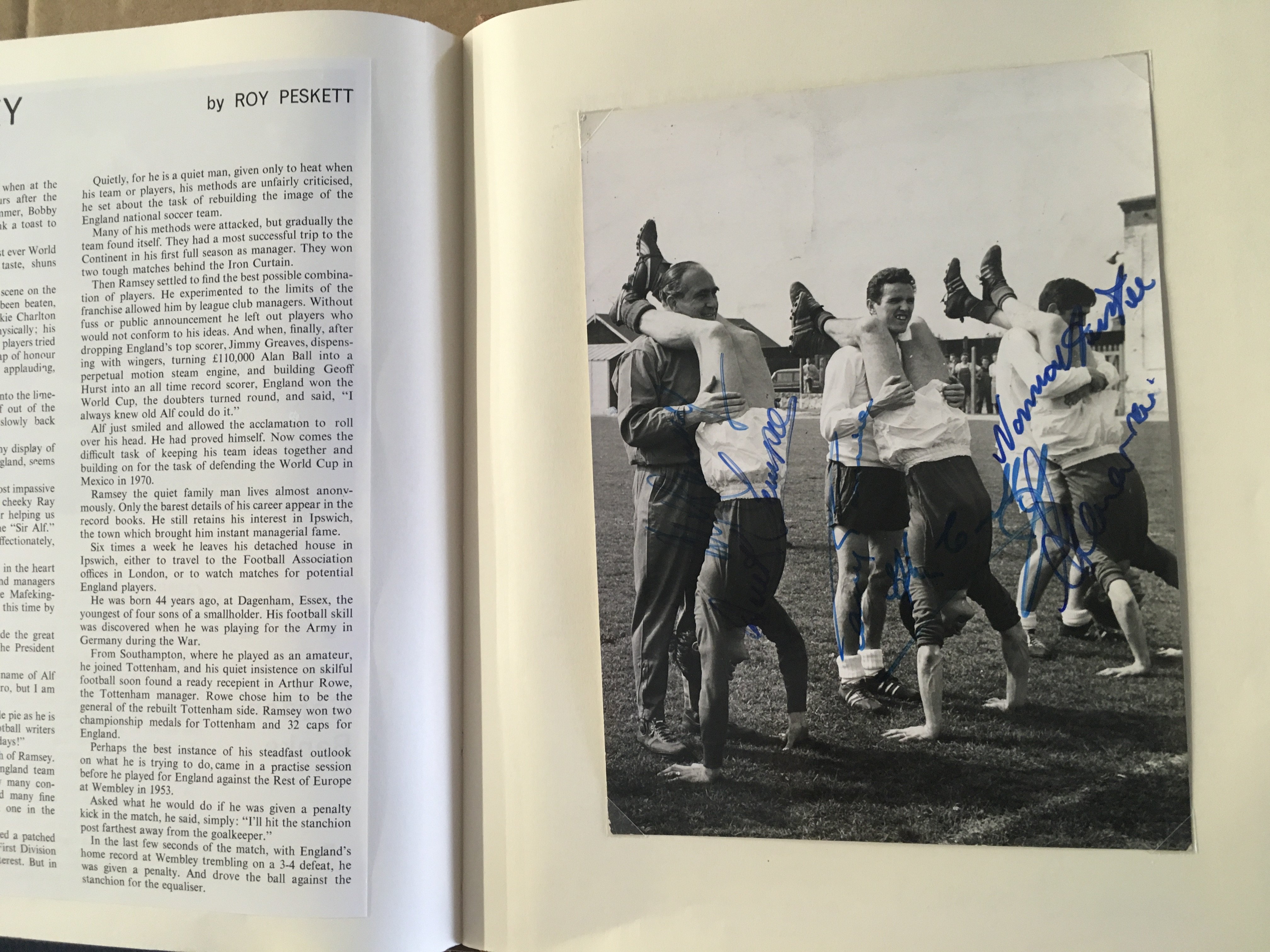 England 1966 World Cup Incredible Football Collection: When you open this original World Cup Willie folder you turn each page and find a stunning press photo from the ceremony and then from each match England played in. The annotations to rear of the clipped in photos have been copied and are on opposite page for reference and some are signed. The final has a photo of all the goals ( some signed ) and a very rare original team sheet. There are celebration photos also ( some signed ). There is a signed press photo of all the 22 players after that plus Ramsey Shepherdson and Cocker ( some in club kit ). This must view lot is finished off with a large magazine picture signed by all 11 winning players. There are a total of 45 original press photos with press stamps etc to rear.