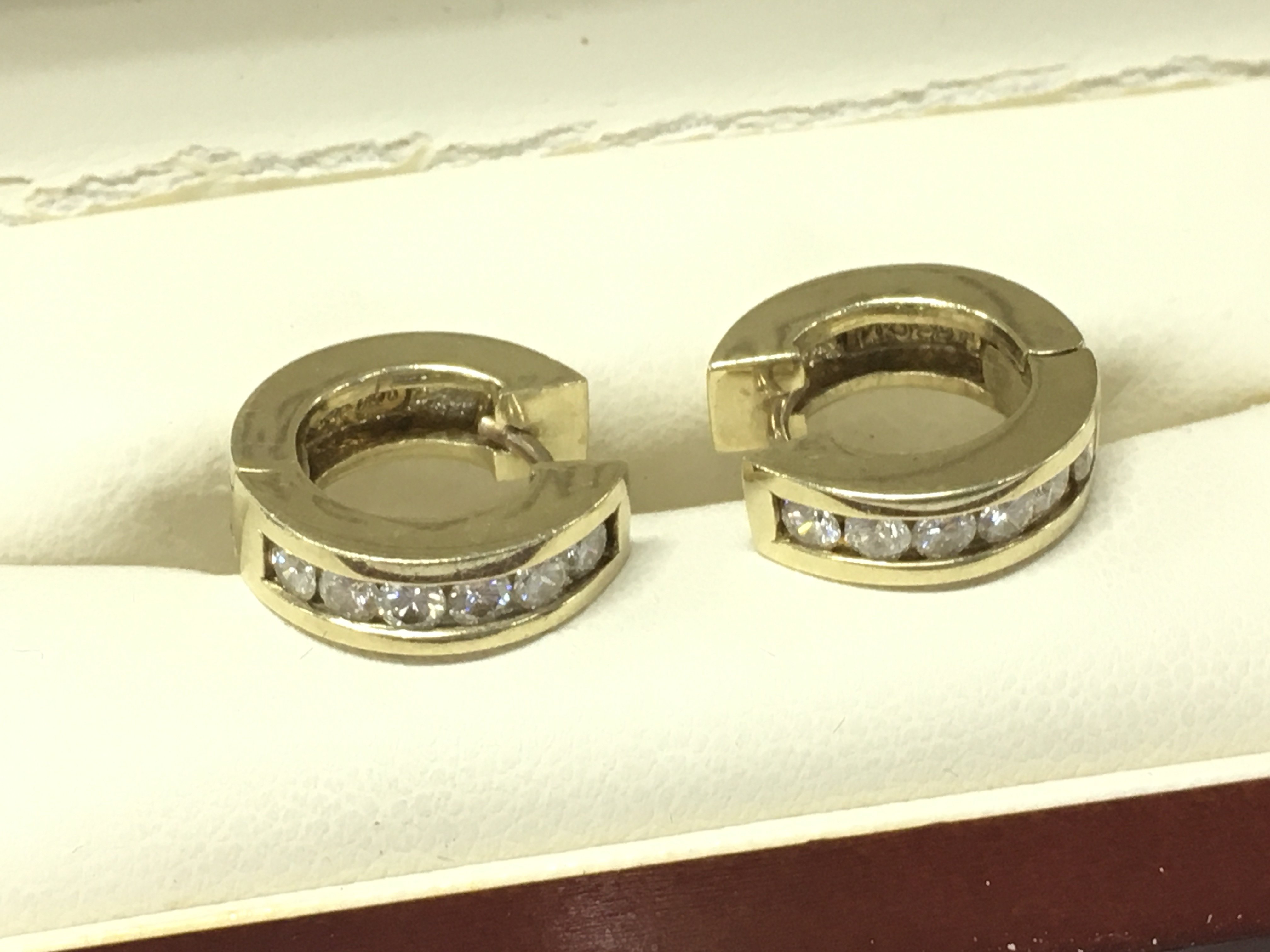 A pair of small hoop 14ct and diamond earrings , 9g total weight. Postage category A