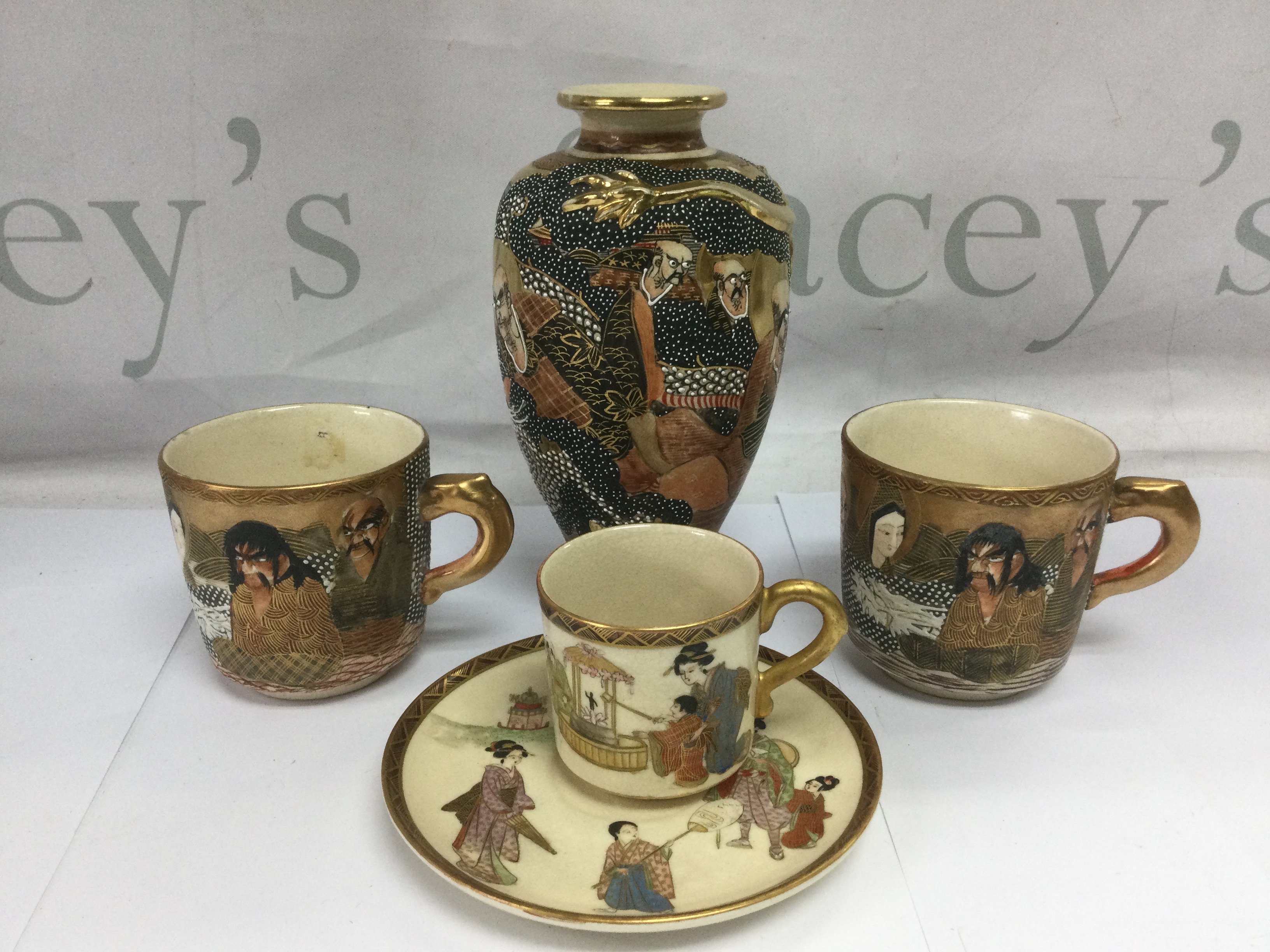 A small Japanese Satsuma vase, three cups and a saucer (5). Shipping category D.