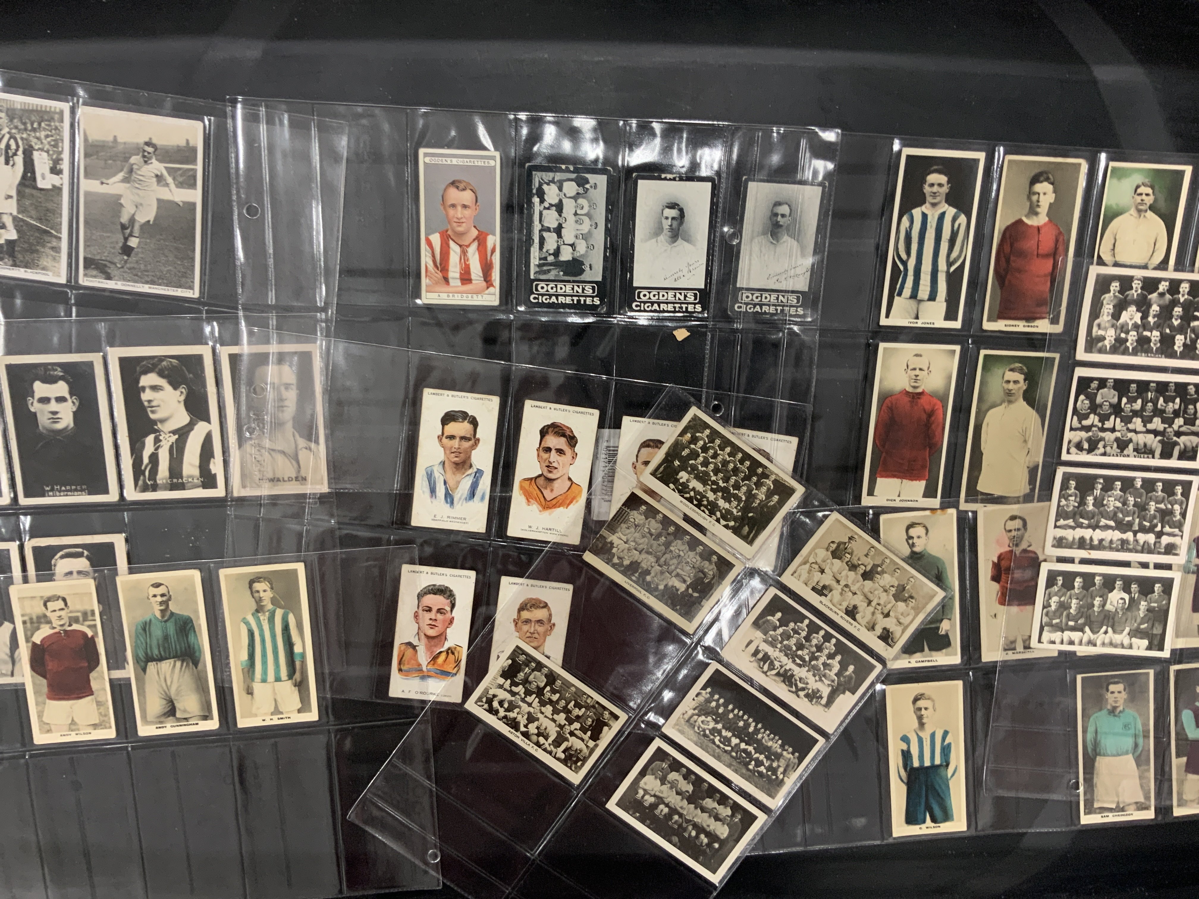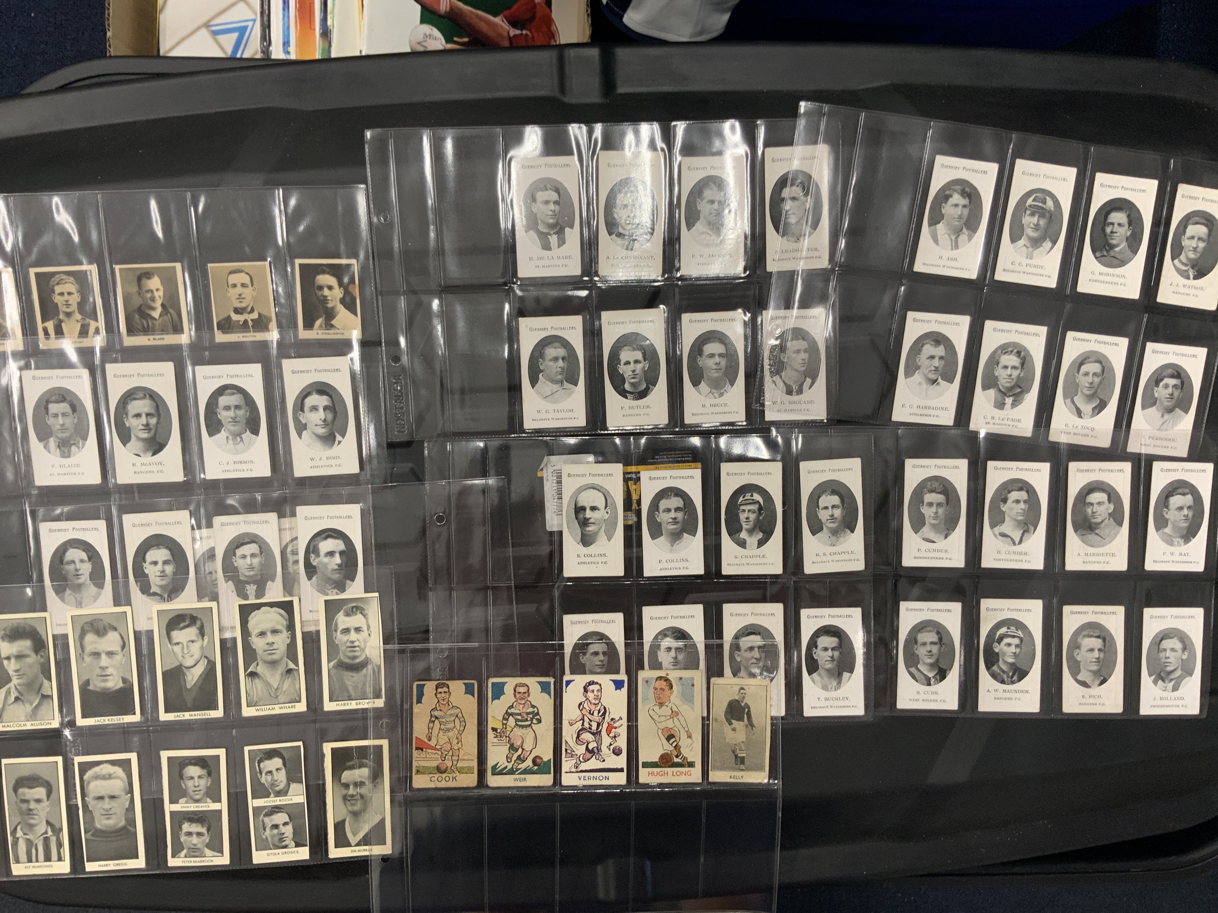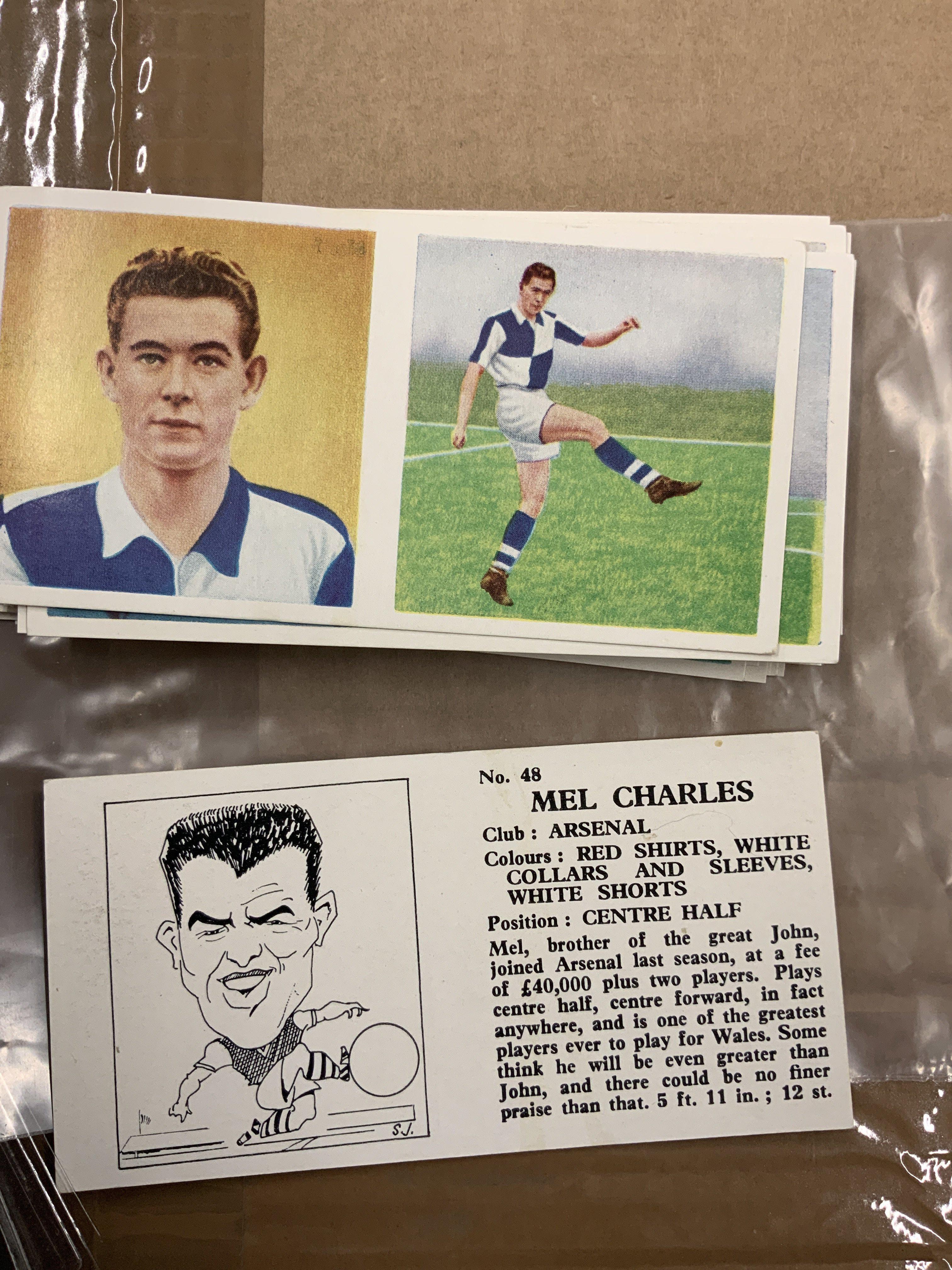 Football Card Collection: Complete set 48 1960 Chics and two missing from 1956 team group set, 42 cards made by Bucktrout of Guernsey, over 200 Pinnace, complete set of 50 Association Footballers by Wills. Cards from makers such as Adventure, Pluck, Ogdens and more. Quantity.