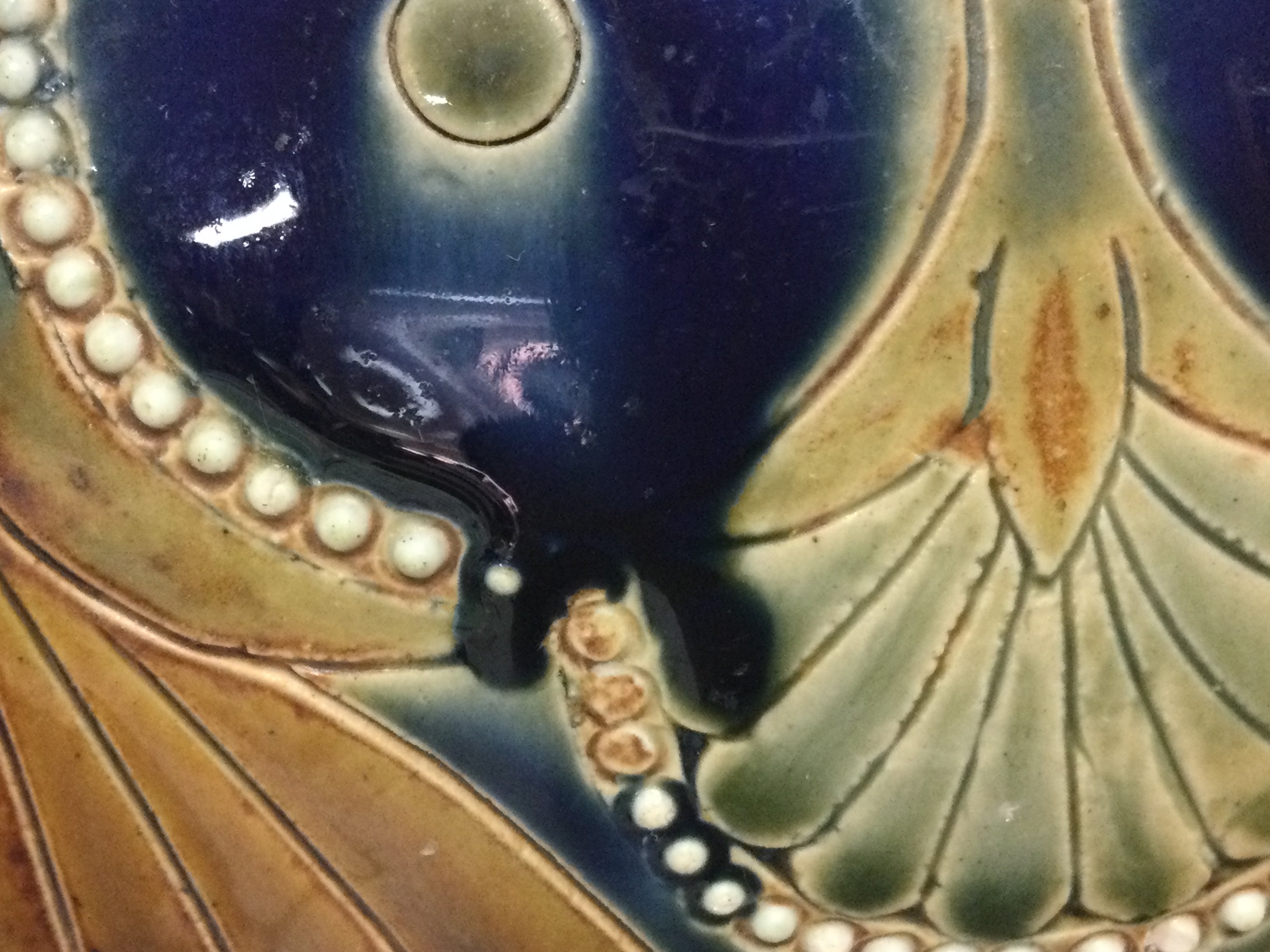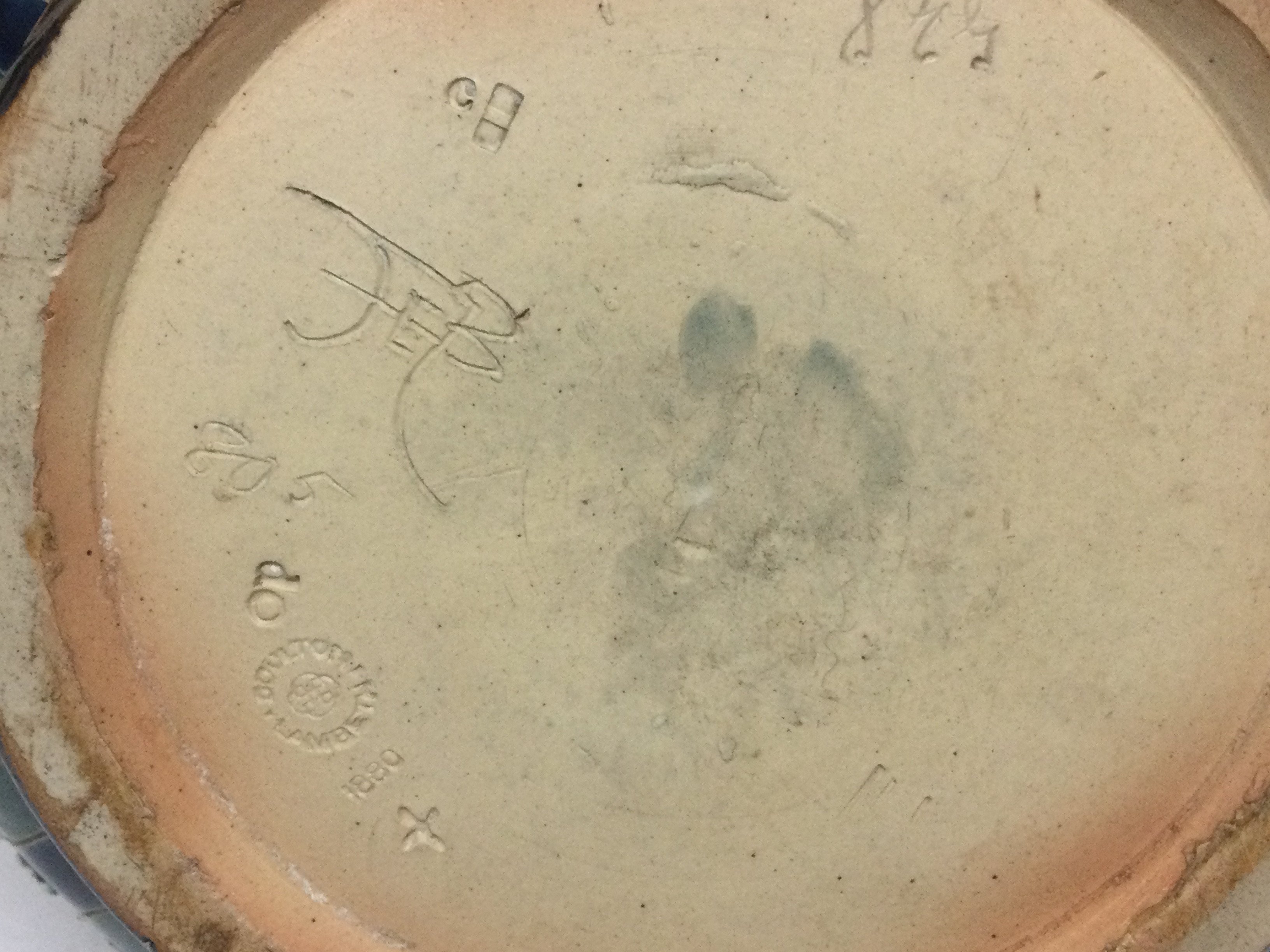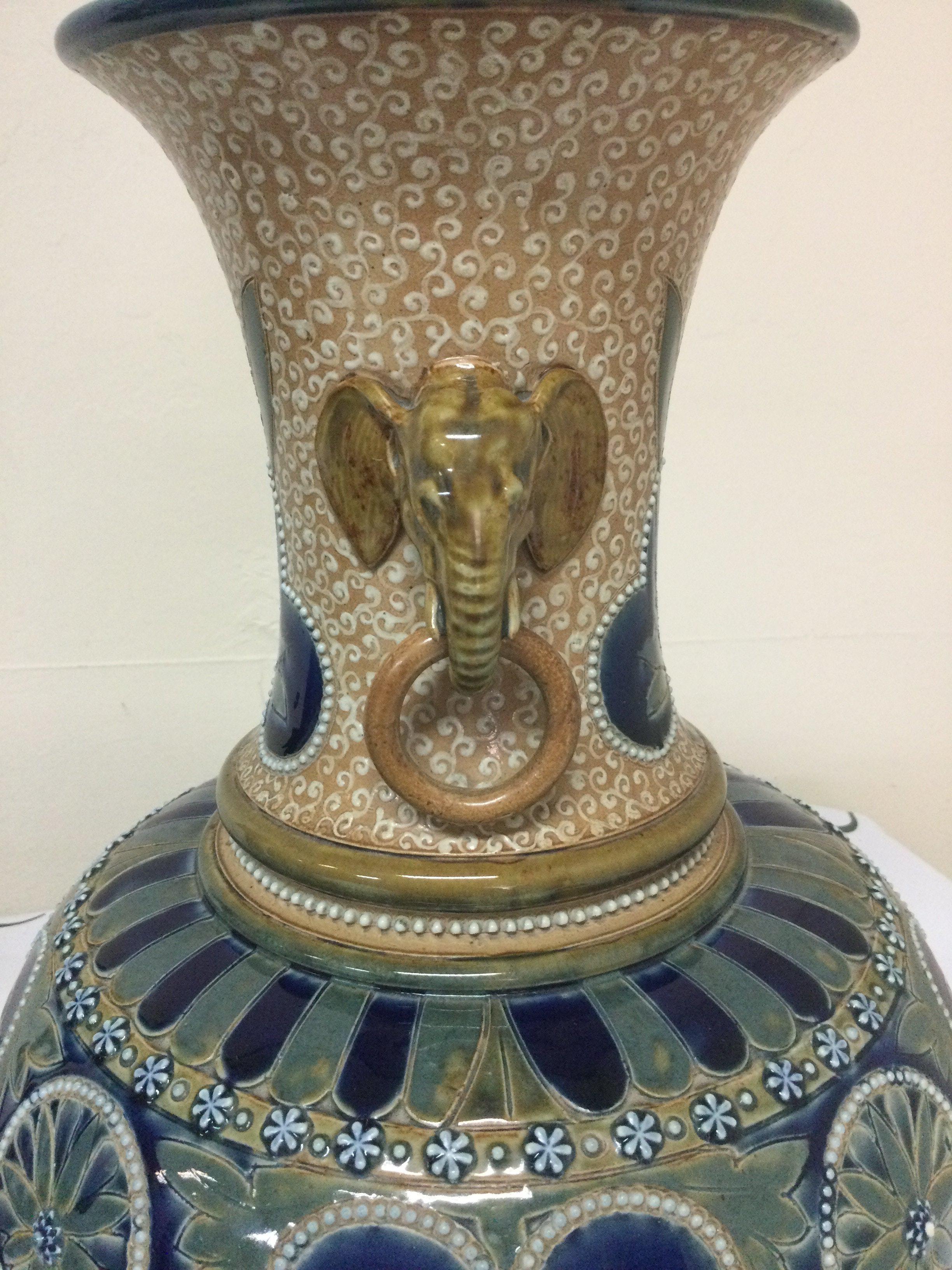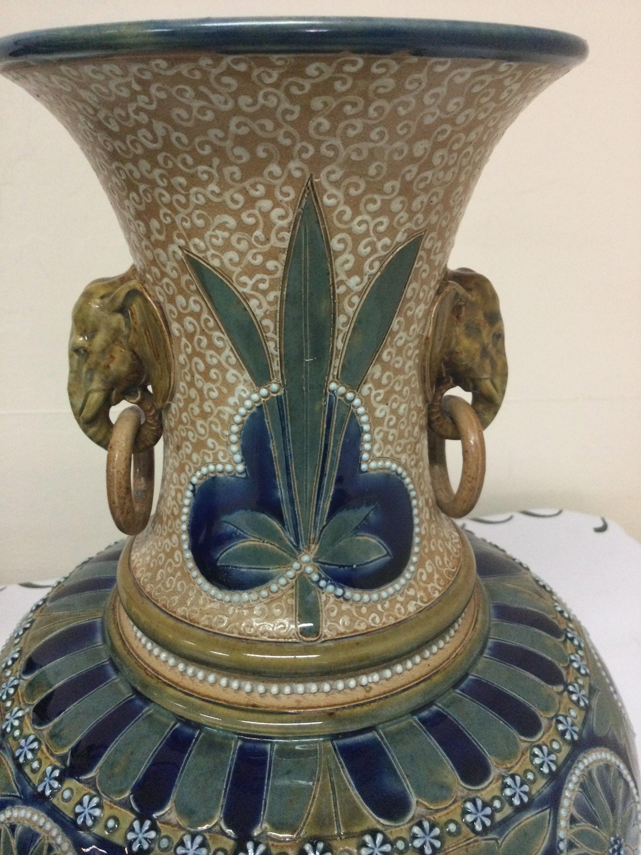 A unusual Florence Barlow Doulton Lambeth stoneware Art pottery vase decorated with stylistic Flowers and foliage with elephant ring handles in a blue green brown glaze . 32 cm. Three beads missing.