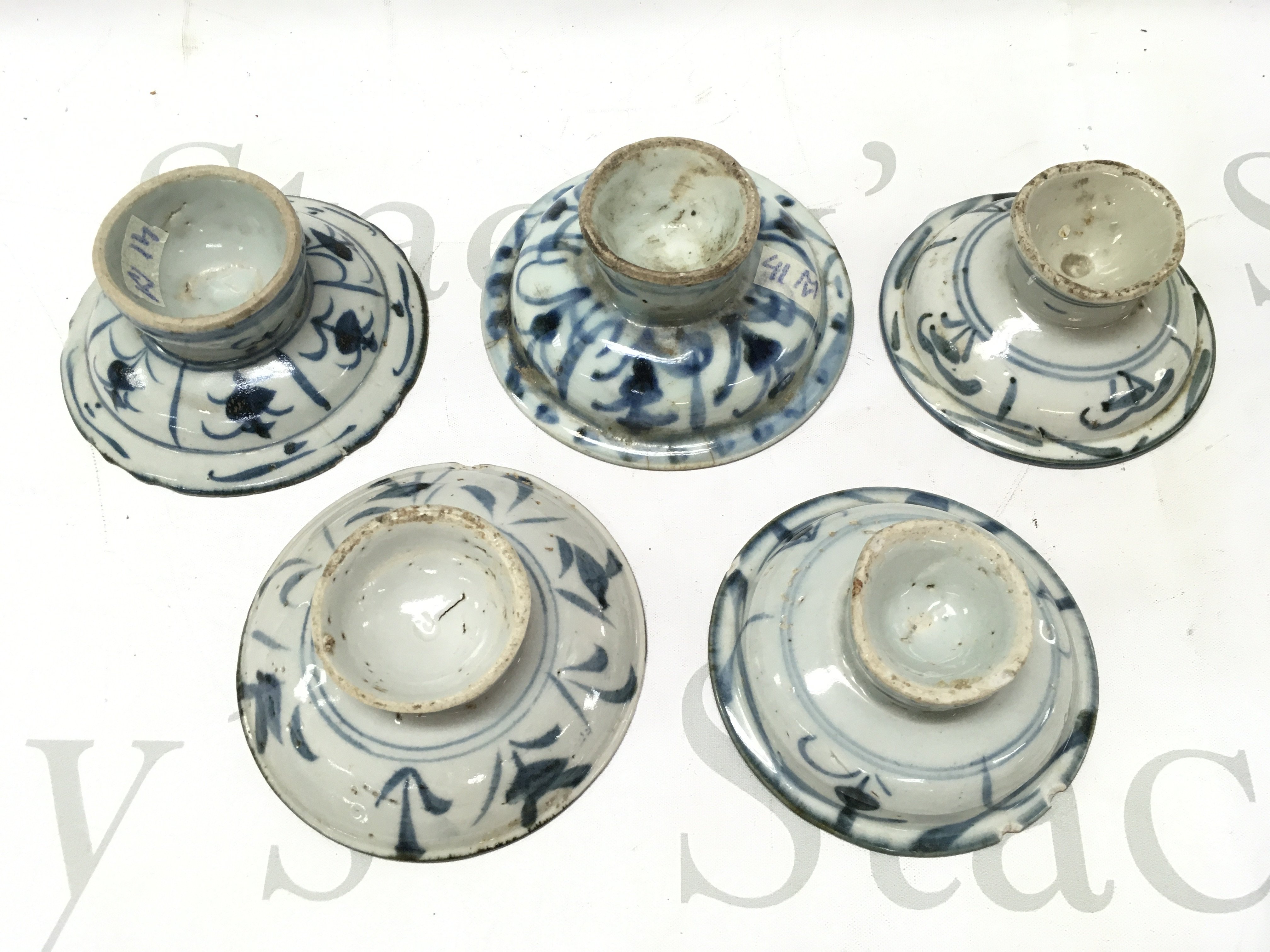 Five Chinese Ming stem bowls , hairline cracks and chips. approximately 2 inches high 4 inches wide. This lot cannot be posted