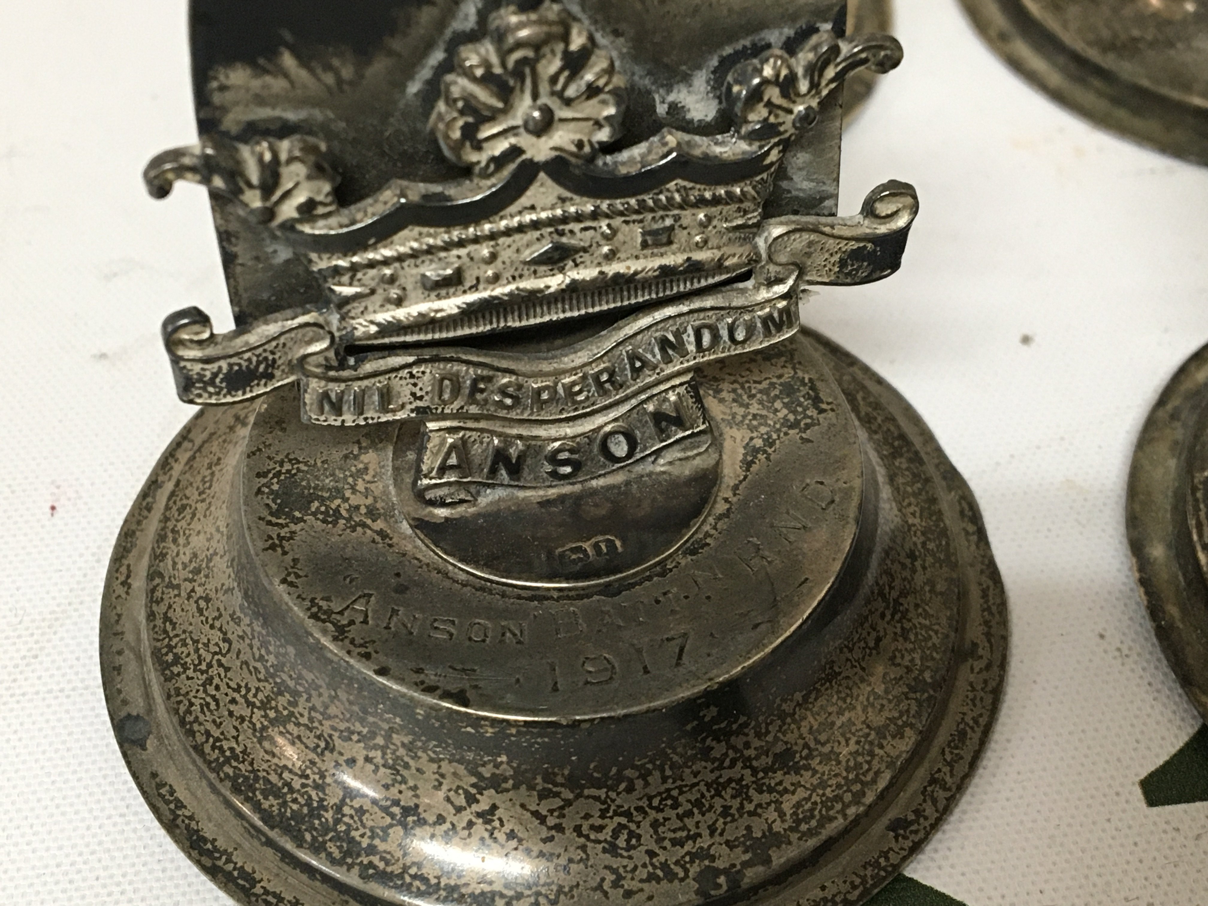 A rare and interesting set of six British Royal Navy silver menu holders dated 1917 the silver holders with the badge of the Anson Battalion. These troops where Royal Navy Volunteers who fought land battles.The Seafied boys. Battles included the Siege of Antwerp Salonica The Western Front and the attempt on Sulva Bay Gallipoli. Rare and possible unique silver menu holders.