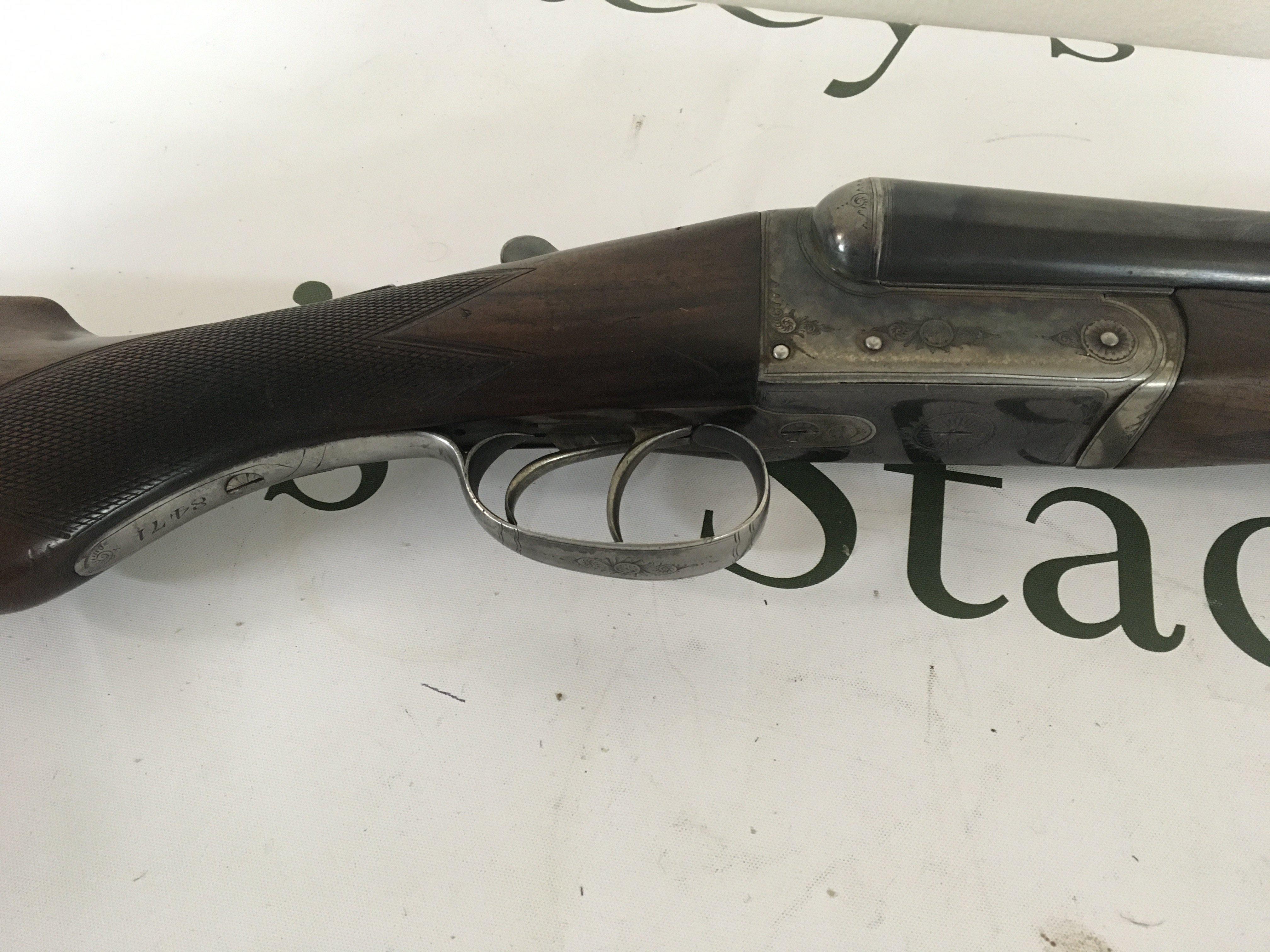 An English 12bore double barrel sporting shot gun side by side barrels fixed choke double trigger ejector. Maker T Baker of London serial number 8471 PLEASE NOTE A SHOTGUN LICENCE IS REQUIRED TO BUY THIS LOT VIEWING AND COLLECTION IS BY APPOINTMENT ONLY.