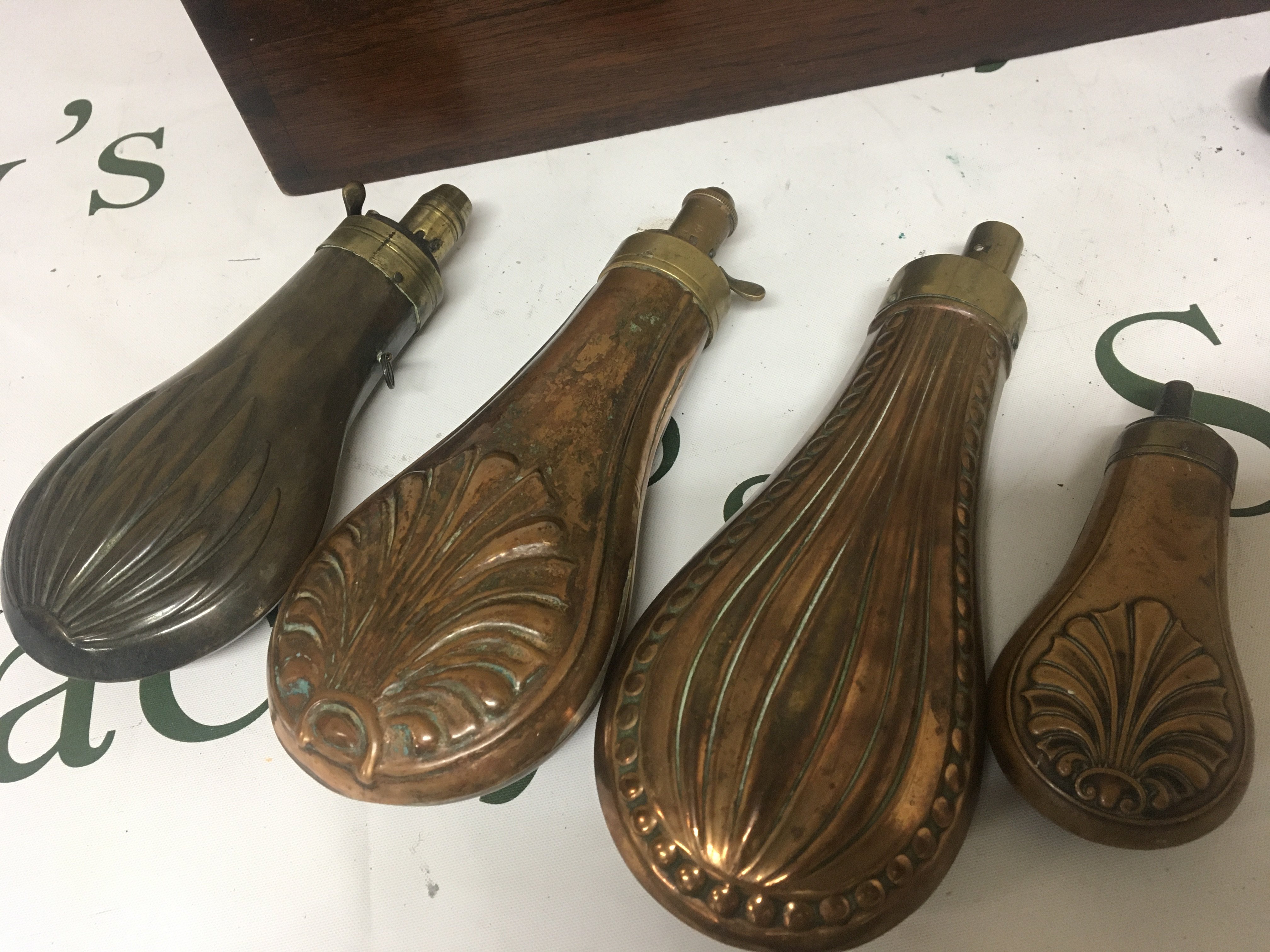 Four 19th century Copper powder flasks and cartridge loader all in a mahogany box.